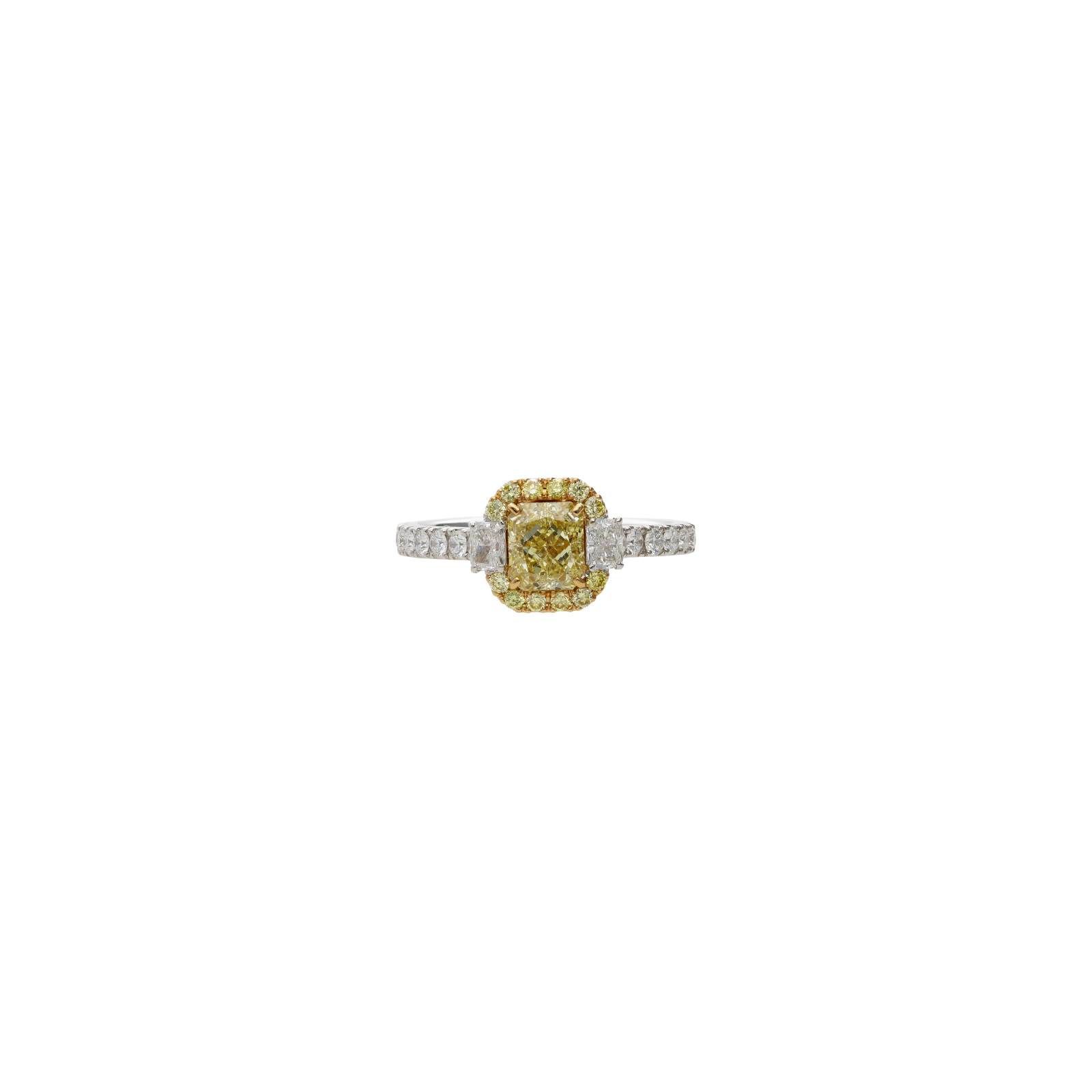 Anello in oro bianco 18 carati con diamante fancy yellow taglio radiant certificato e taglio brillante e diamanti bianchi taglio brillante e taglio radiant