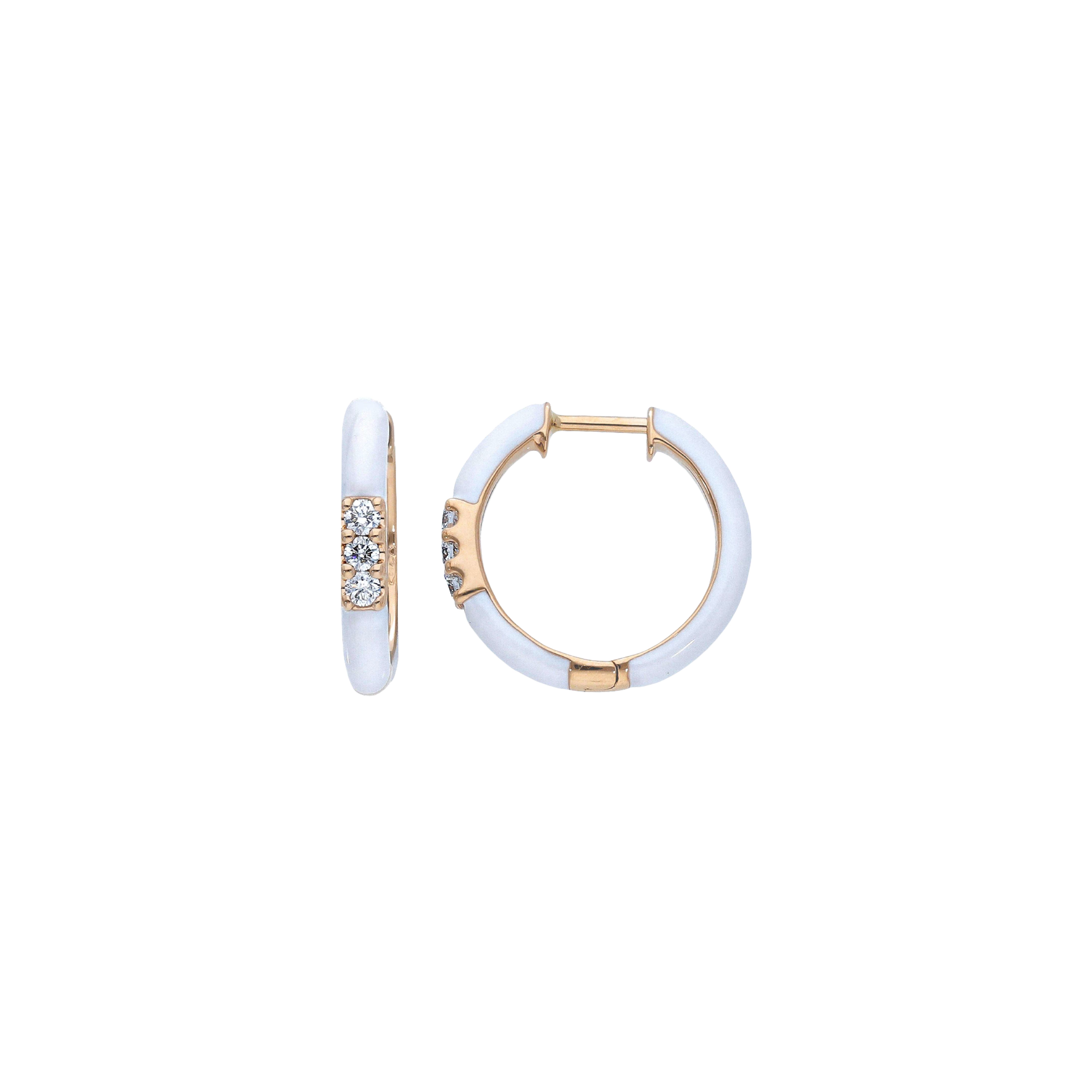 Orecchini a cerchio in oro rosa 18 carati, smalto bianco con diamanti bianchi taglio brillante