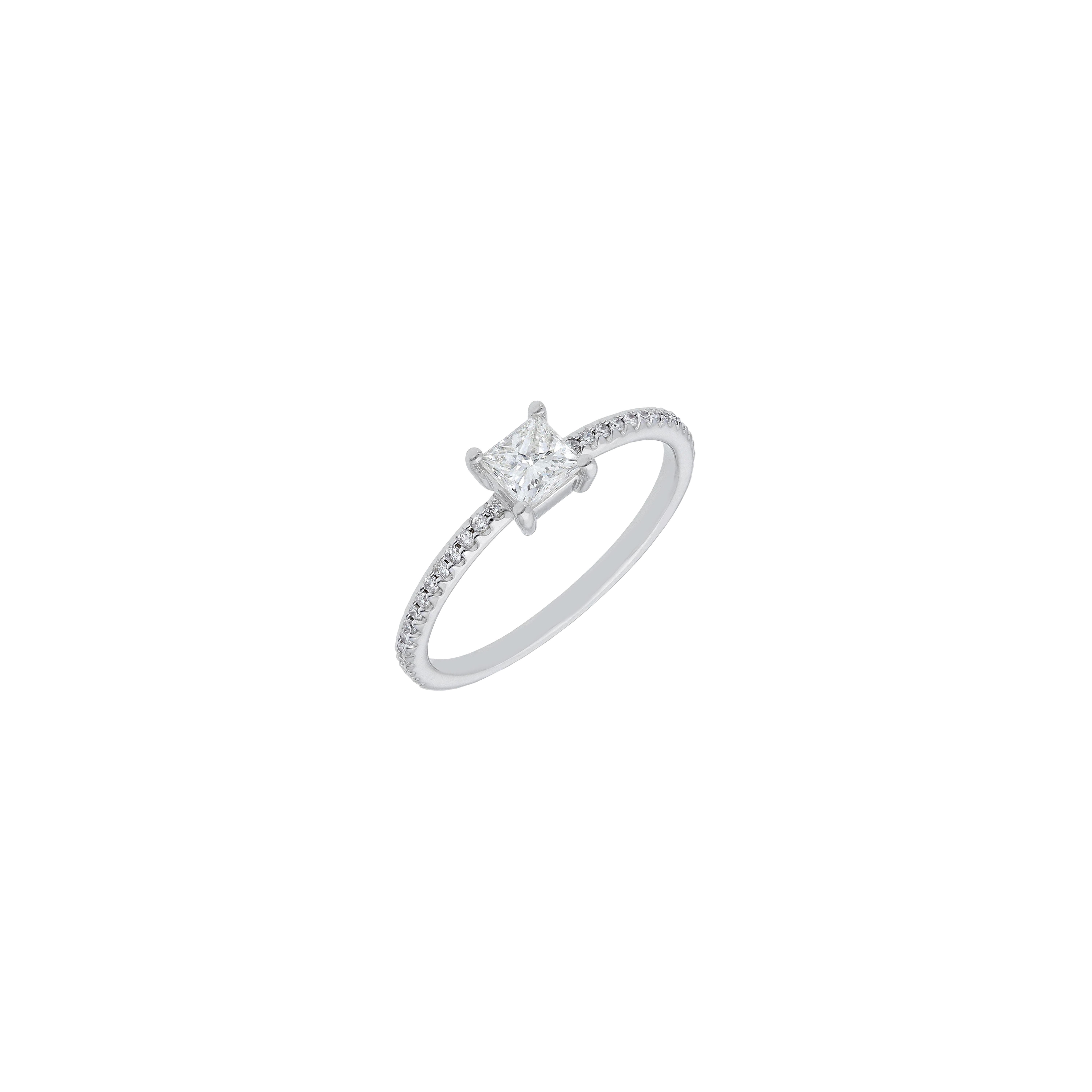 Anello solitario in oro bianco 18 carati con diamante bianco taglio princess e diamanti bianchi taglio brillante