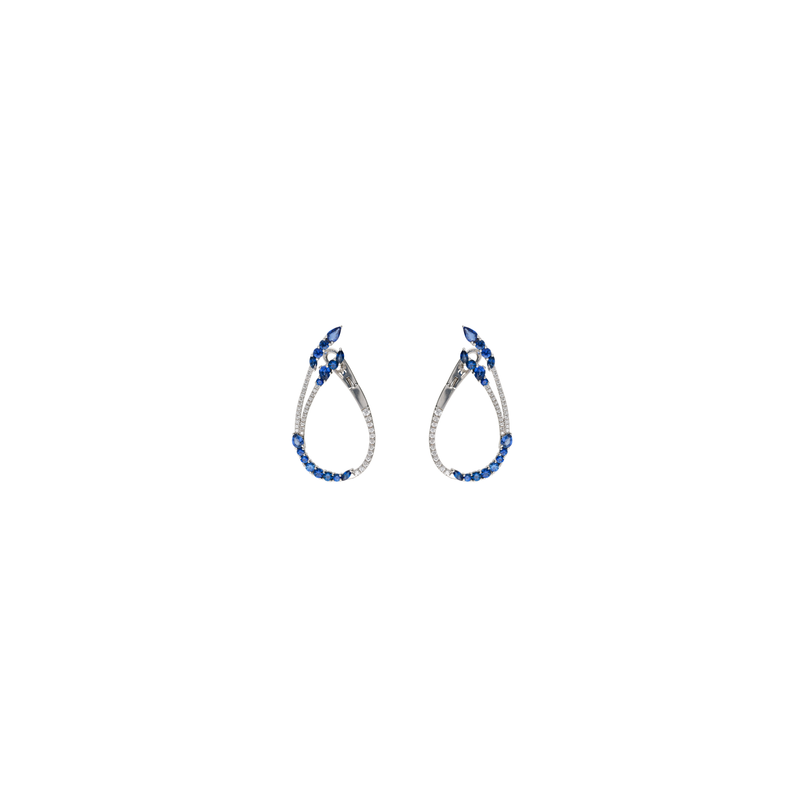 Orecchini in oro bianco 18 carati con diamanti bianchi taglio brillante, zaffiri blu taglio brillante, taglio goccia e taglio marquise