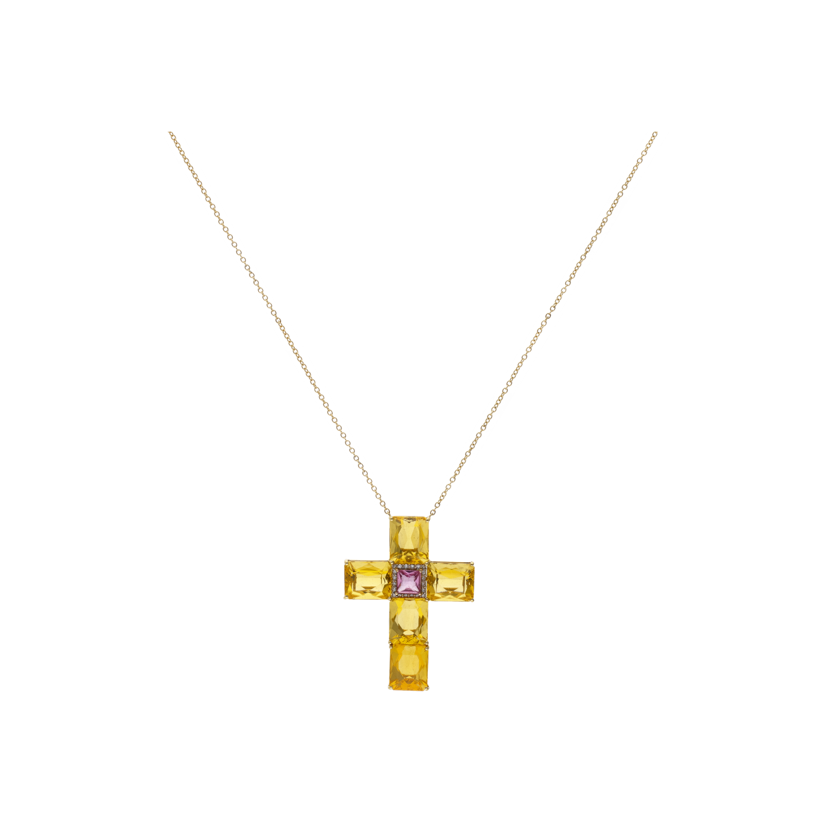 Collana in oro giallo 18 carati con opale giallo taglio ottagonale, zaffiro rosa taglio asscher e diamanti bianchi taglio brillante. Lunghezza regolabile a 40 e 42 cm.