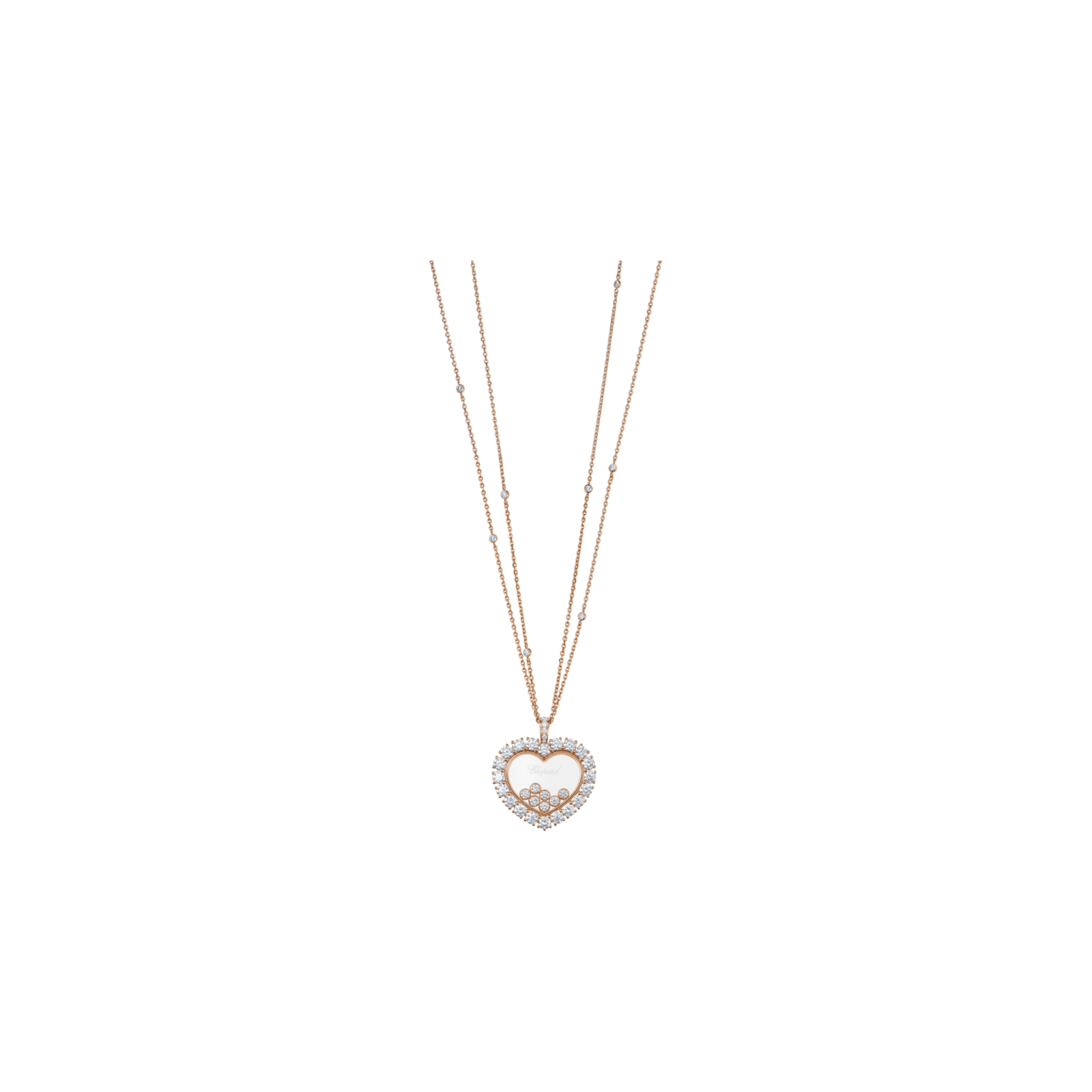 Il pendente a cuore in oro rosa e diamanti Happy Diamonds è tanto unico quanto ludico. I diamanti mobili sono lasciati completamente liberi di danzare tra due vetri zaffiro, senza restrizioni, e proprio questo movimento esalta la loro lucentezza intrinseca. Little diamonds do great things.