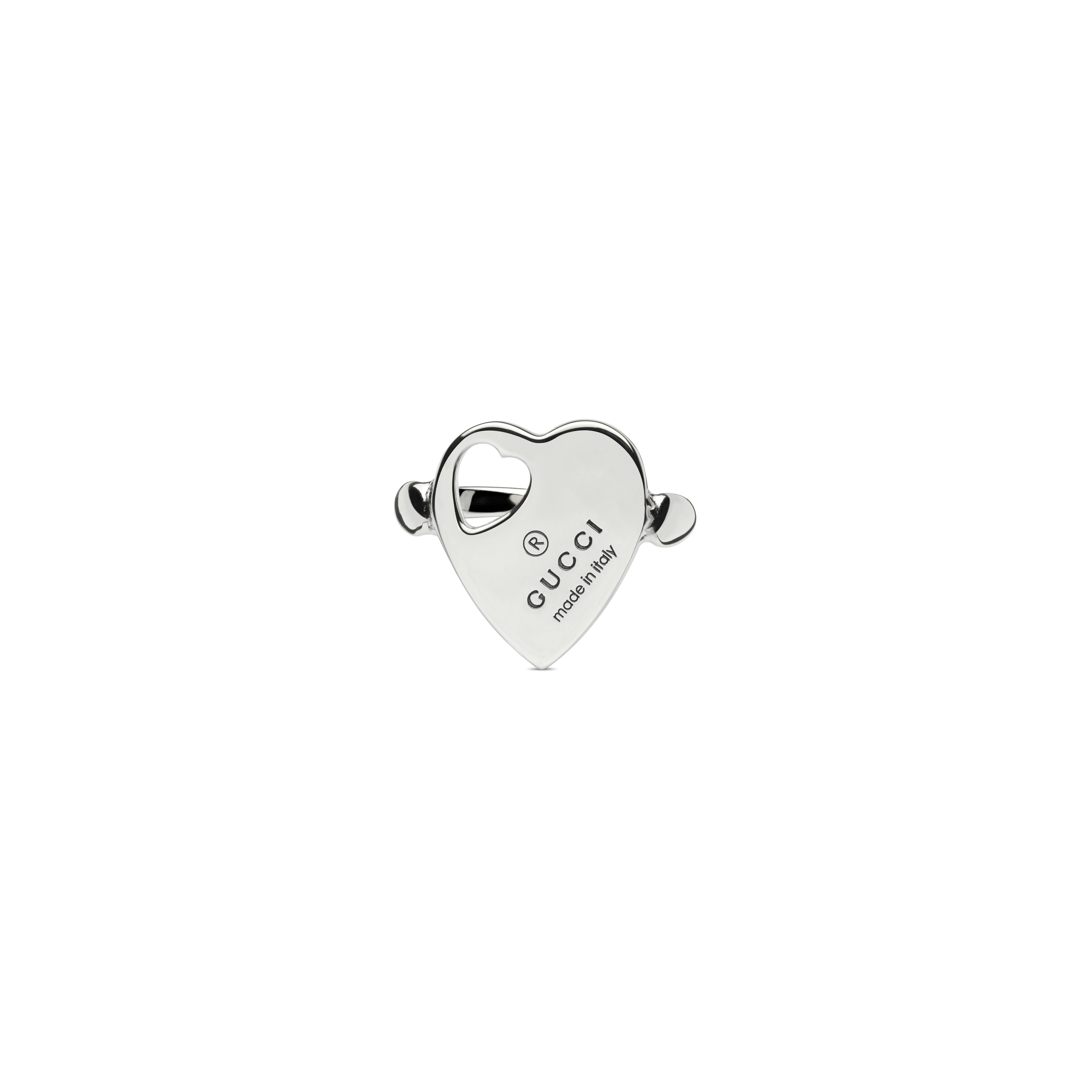 La linea Gucci trademark unisce motivi e dettagli esagonali con il nome della maison. Dal cuore cut-out al lucchetto, simboli divertenti continuano a caratterizzare una selezione di anelli, collane, bracciali e orecchini per la collezione pre-fall 2024. Questo anello presenta il caratteristico cuore con un dettaglio cut-out, anch'esso a forma di cuore.
