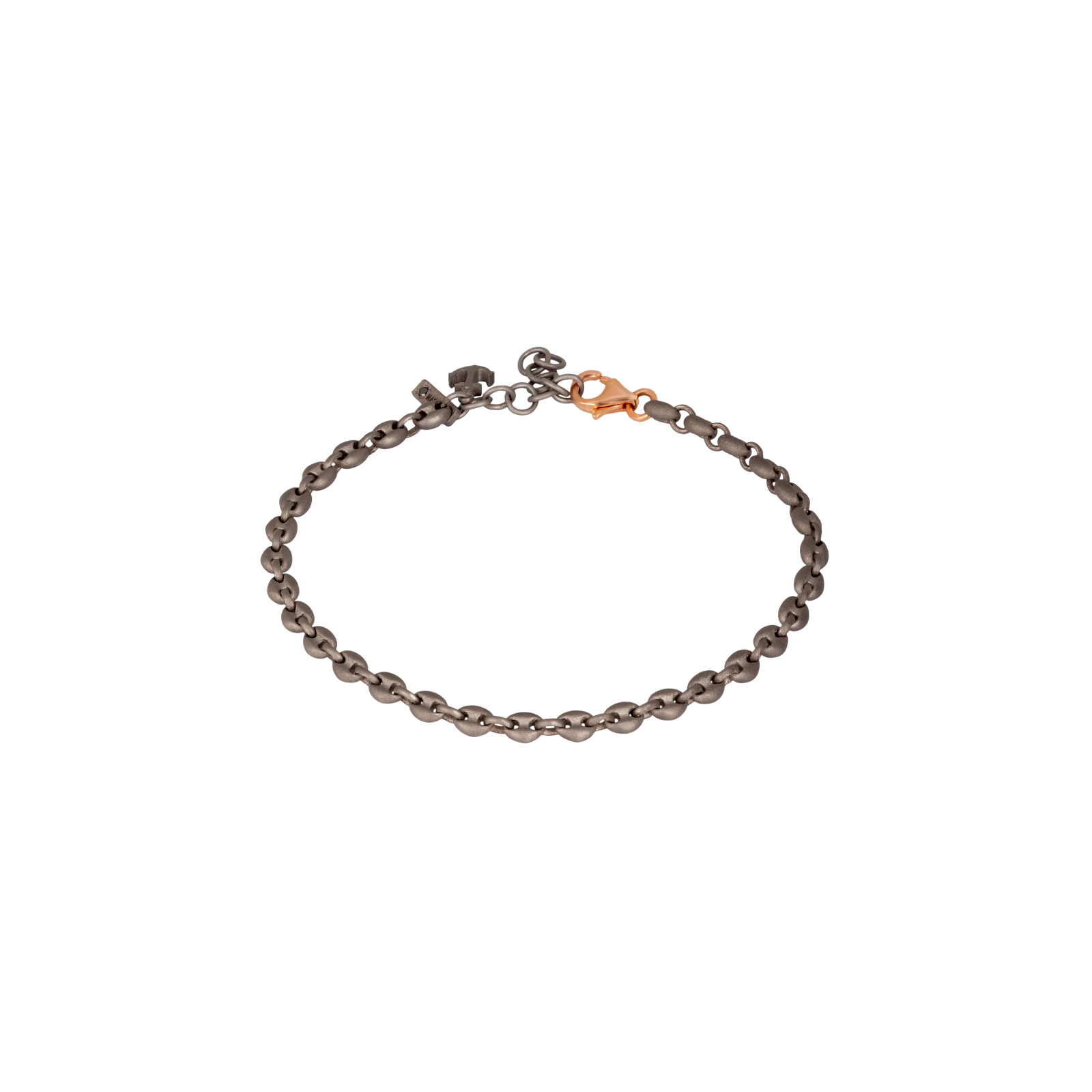 Bracciale uomo linea marine in titanio, diamante black e oro rosso 9 kt. Splendido bracciale con maglie marine in titanio e oro rosso 9kt. Le maglie marine, elementi principi del bracciale sono unite tramite anellini in titanio. Il bracciale termina con una chiusura a gancio in oro rosso 9 kt che insieme all'ancora in titanio donano un tocco di preziosità. Il testimonial del marchio MANO|J., il brillante black da 1 punto è incastonato sopra la targhetta in titanio pendente alla chiusura.