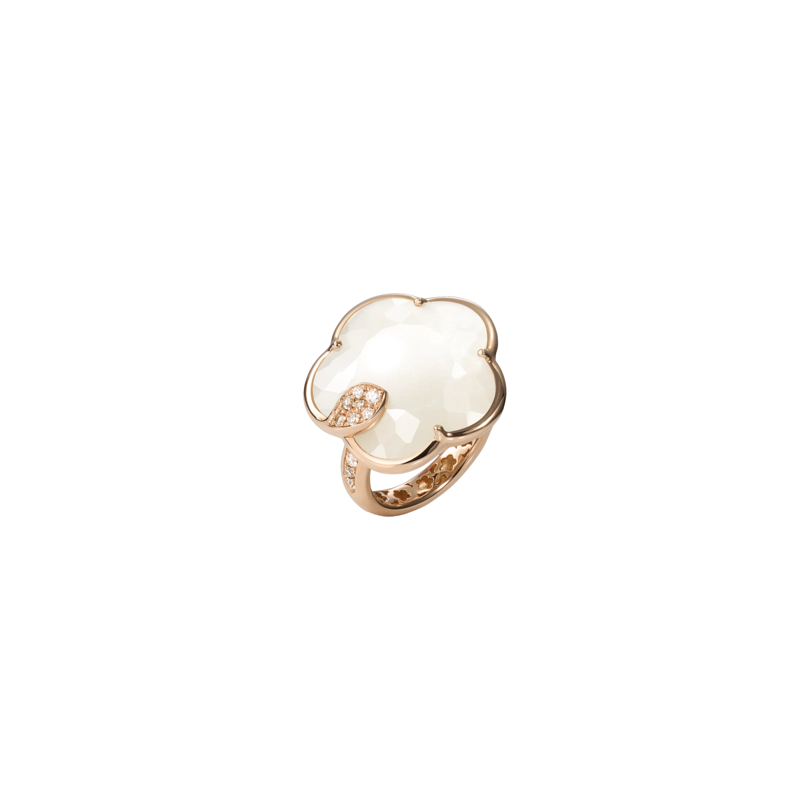 Ton Joli mantiene la delicata sfaccettatura del taglio bon ton, taglio esclusivo brevettato da Pasquale Bruni. La collezione reinterpreta l'iconico fiore a cinque petali della maison in nuove, sofisticate proporzioni. Le gemme si fondono in un fiore in oro rosa, avvolto da una foglia di diamanti bianchi e champagne.