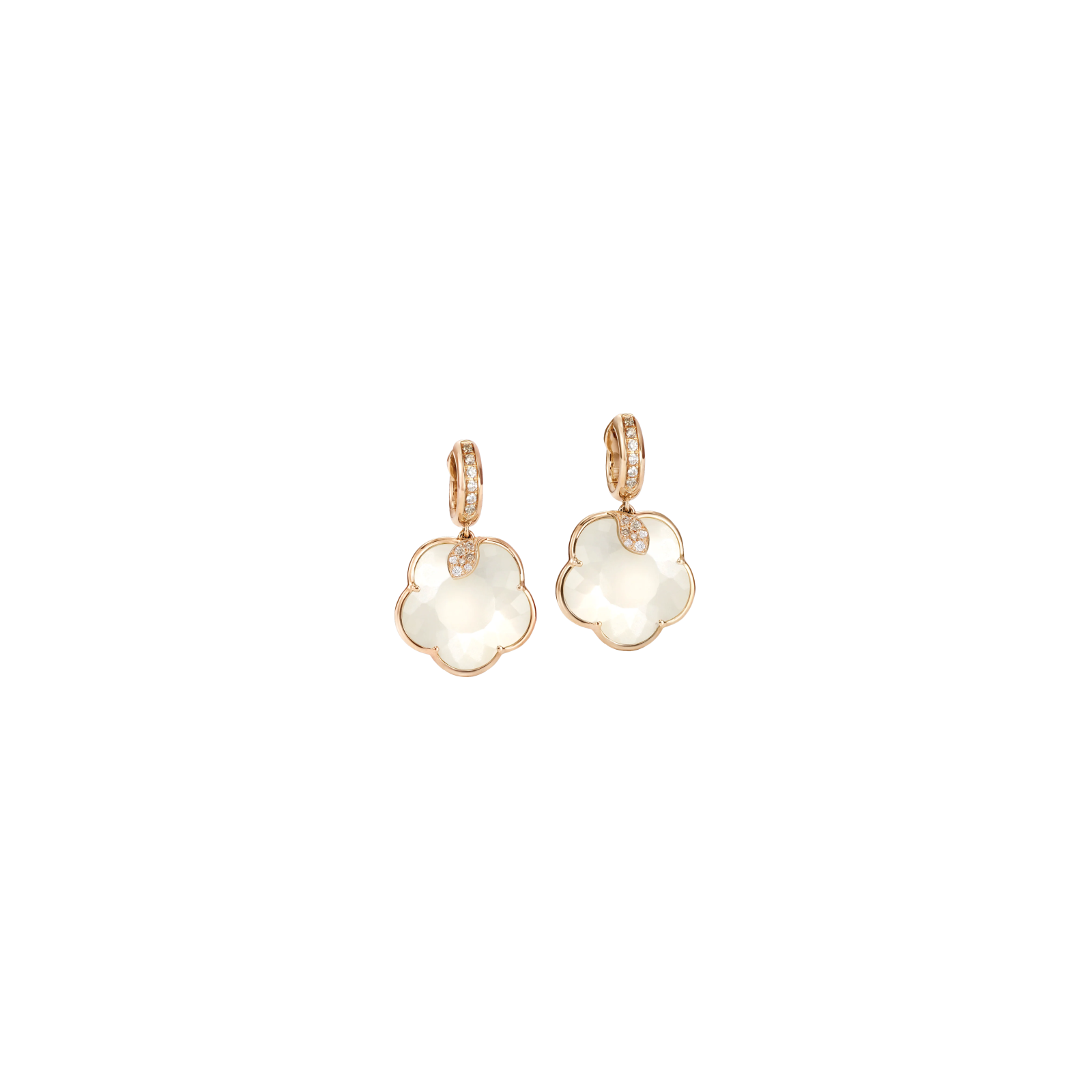 Ton Joli mantiene la delicata sfaccettatura del taglio bon ton, taglio esclusivo brevettato da Pasquale Bruni. La collezione reinterpreta l'iconico fiore a cinque petali della maison in nuove, sofisticate proporzioni. Le gemme si fondono in un fiore in oro rosa, avvolto da una foglia di diamanti bianchi e champagne.