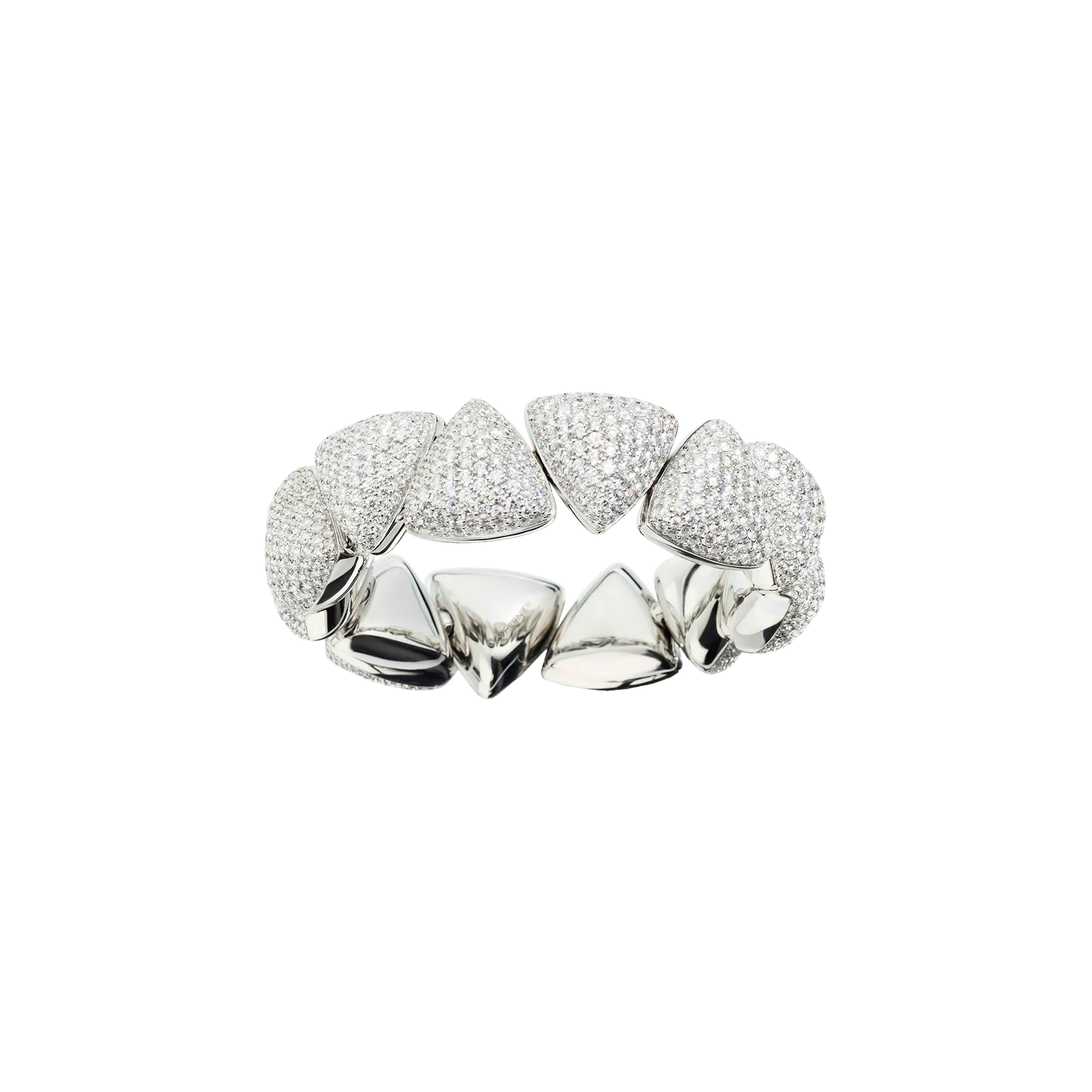 Con una luce magnifica, vellutato e compatto, questa versione del bracciale freccia propone i morbidi elementi triangolari in oro bianco ricoperti da bellissimi diamanti. Un esempio del famosissimo pavé di Vhernier.
