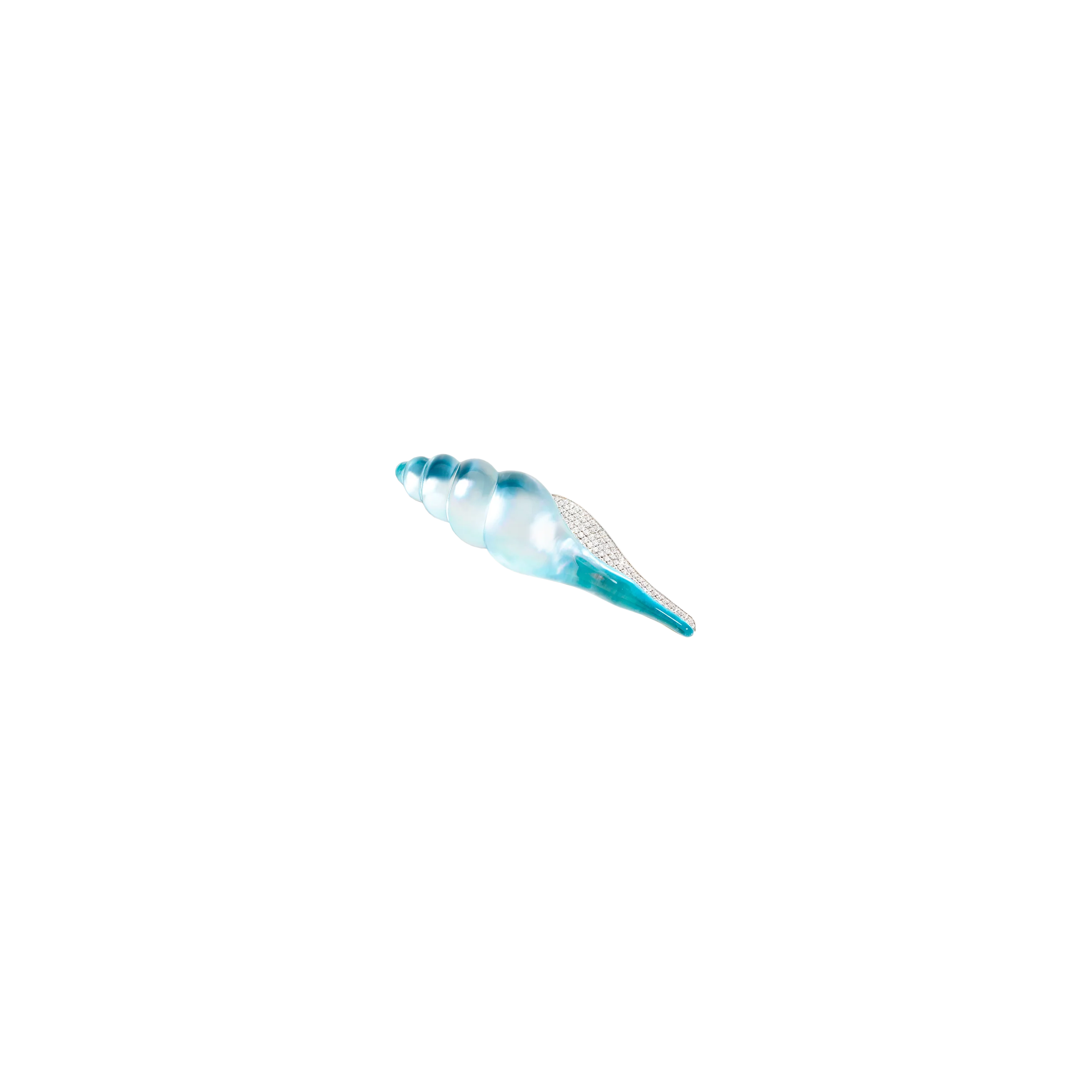 La conchiglia è una spilla scultorea che reinventa le forme della natura. Realizzata in oro bianco, presenta uno splendido pavé di diamanti e un colore unico creato dal turchese, dalla madreperla bianca e dal cristallo di rocca, che si combinano per creare le famose trasparenze di Vhernier.