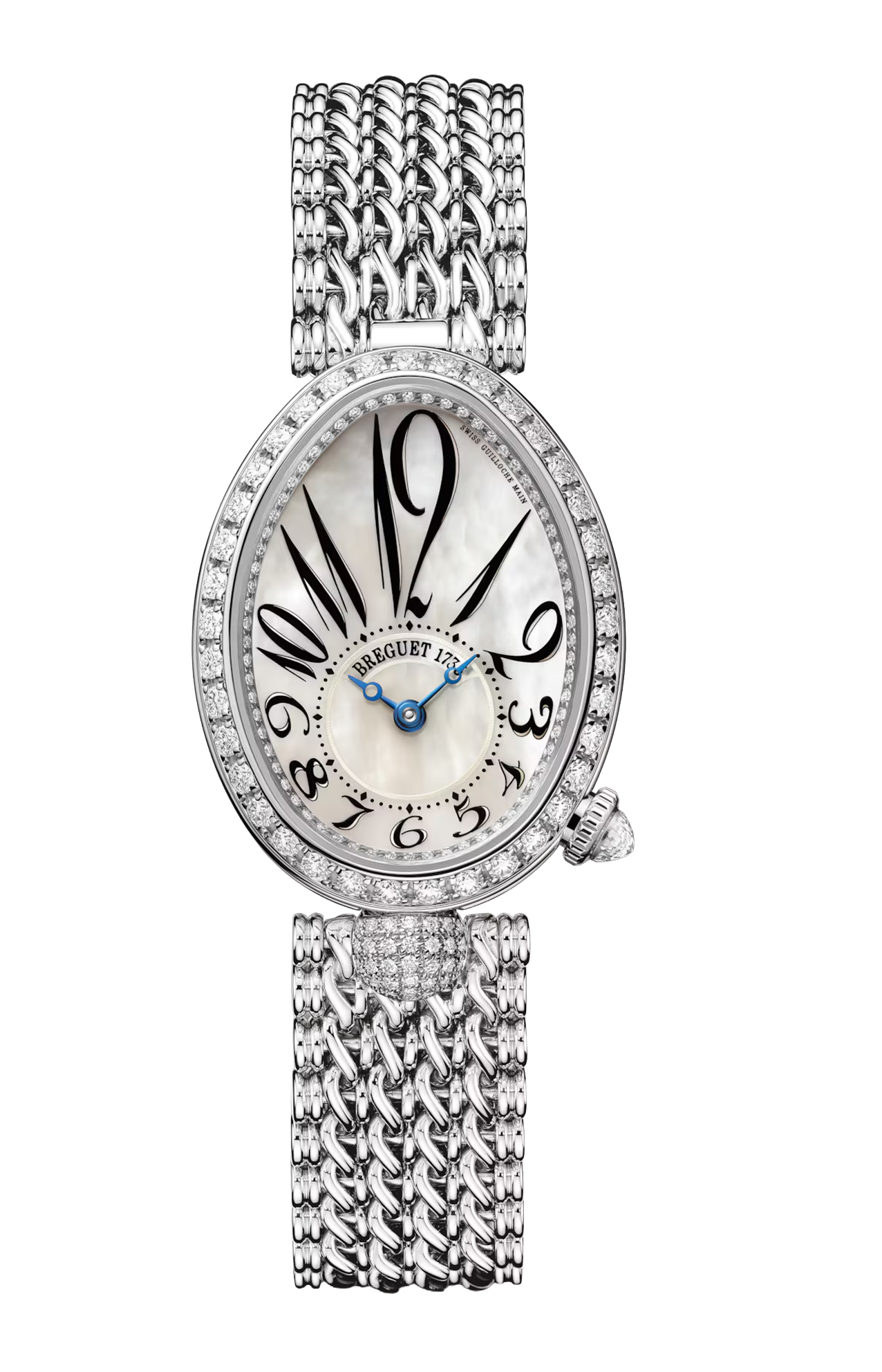 Il giro delle ore, situato nella parte inferiore del quadrante, presenta le celebri lancette azzurrate a “pomme excentrée”. L’ansa “boule” a ore 6 tempestate di diamanti, la corona di carica ornata da un diamante taglio briolette a ore 4 e la lunetta, il réhaut e il fermaglio decorati da diamanti taglio brillante costituiscono un capolavoro di incastonatura.