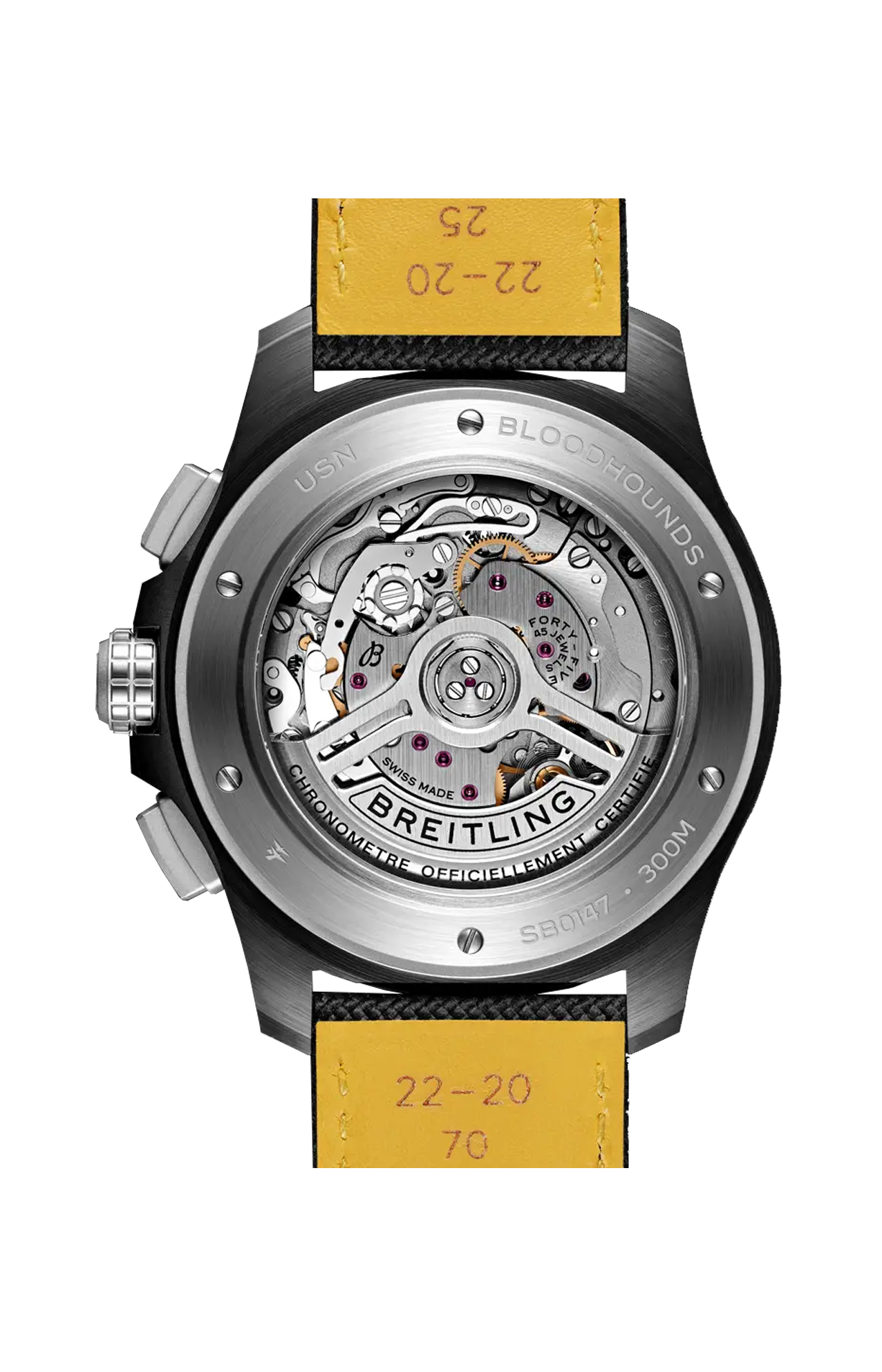 Ideato per i piloti di jet, l’Avenger è progettato per affrontare le cabine di pilotaggio più ardue, senza mai tirarsi indietro. Queste edizioni sono dedicate all’Accademia Navale degli Stati Uniti e a due delle squadriglie elitarie di collaudo aereo della marina statunitense: i Dust Devils e i Bloodhounds. Ma non serve essere un asso dell’aviazione per apprezzarne l’audace design, l’eccezionale resilienza e la funzionalità sempre un passo avanti. Ogni versione presenta l’emblema e lo schema cromatico dell’unità – rosso e nero per i Dust Devils, grigio e giallo per i Bloodhounds, blu e giallo per l’Accademia Navale degli Stati Uniti – nonché un’incisione dedicata che circonda la vista del fondocassa aperto del calibro di manifattura Breitling 01. Tutte e tre presentano casse in ceramica nera e minuteria in titanio, abbinate a cinturini in pelle militare con ricami a contrasto. Il tonneau a botte non sarà forse per tutti, ma chiunque apprezzerà ogni minimo dettaglio della loro impermeabilità fino a 300 m, la maneggevole funzionalità e la costruzione resistente alla corrosione.