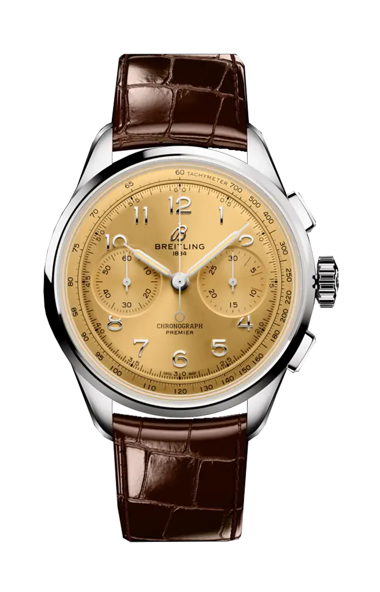 Rendendo omaggio a tre generazioni di inventori—Léon, Gaston e Willy Breitling—la collezione Premier incarna l’eredità di Breitling quale inventore del cronografo moderno. Per usare le parole di Willy Breitling, il Premier è un «segno inconfondibile di un gusto impeccabile». La moderna collezione Premier riporta in vita questa storia dando prova dell’elevato standard orologiero di Breitling. Presenta una gamma di complicazioni: il cronografo, la frazione di secondo Duograph, il calendario completo Datora e il tourbillon. Il design del cronografo Premier, rivisitato rendendo omaggio alla tradizione, mostra una varietà di dettagli di design eleganti come le scanalature sui lati della cassa, i pulsanti rettangolari, i numeri arabi applicati e le lancette di ispirazione vintage. È inoltre dotato di fondocassa aperto in vetro zaffiro che mette splendidamente in luce il calibro di manifattura Breitling B09 certificato COSC a carica manuale.