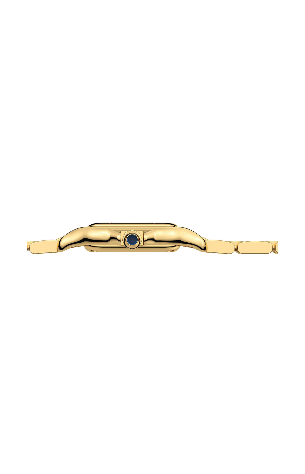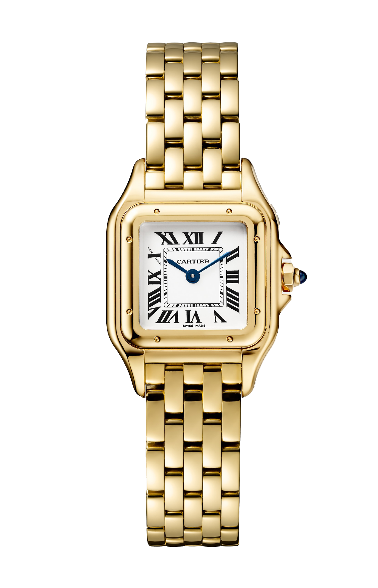 Orologio Panthère de Cartier, modello piccolo, movimento a quarzo. Cassa in oro giallo 750/1000, dimensioni 23 x 30 mm, spessore 6 mm, corona ornata di uno zaffiro blu, quadrante argentato, lancette a forma di gladio d'acciaio azzurrato, bracciale in oro giallo 750/1000, impermeabile fino a 30 metri.