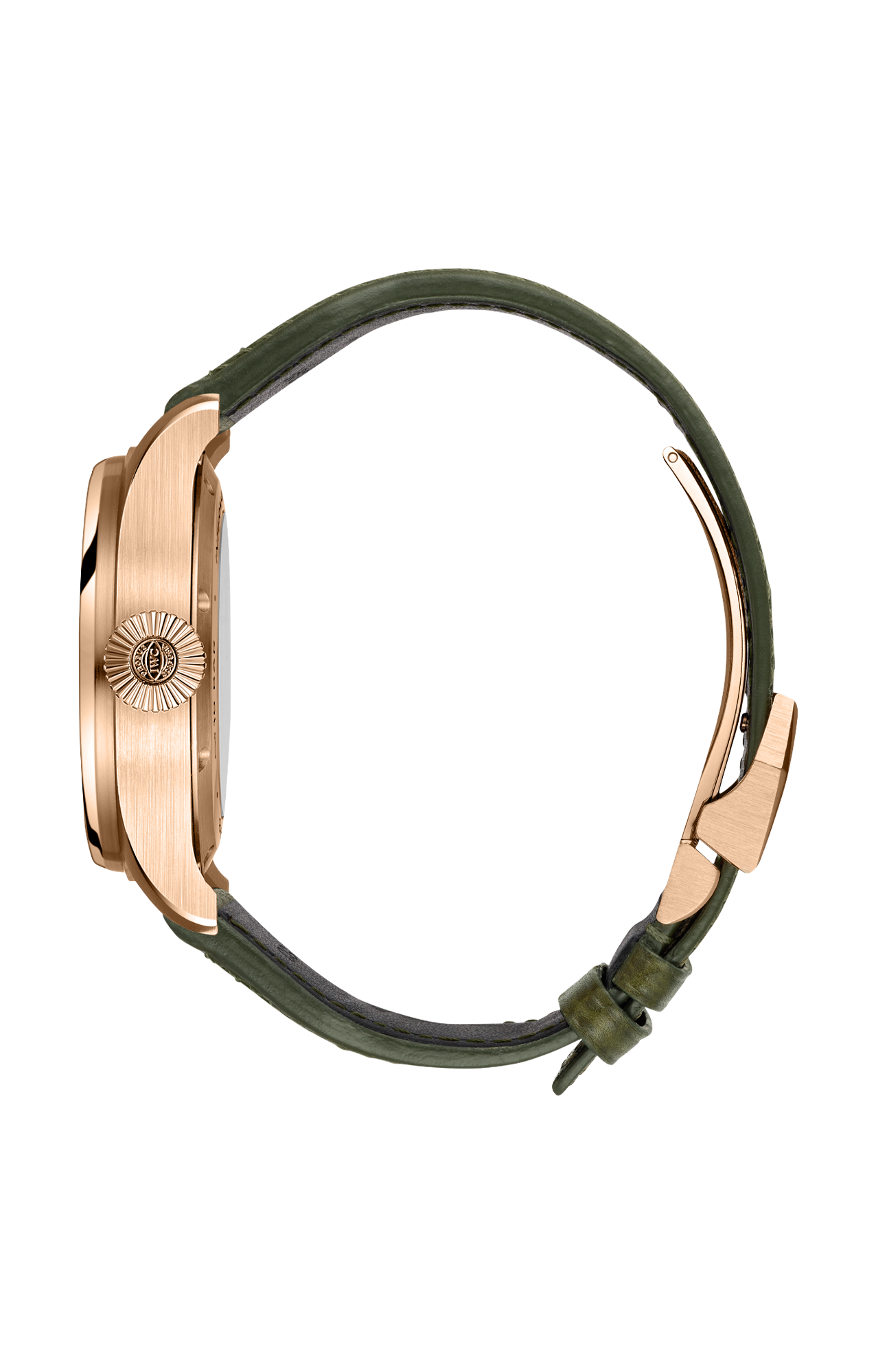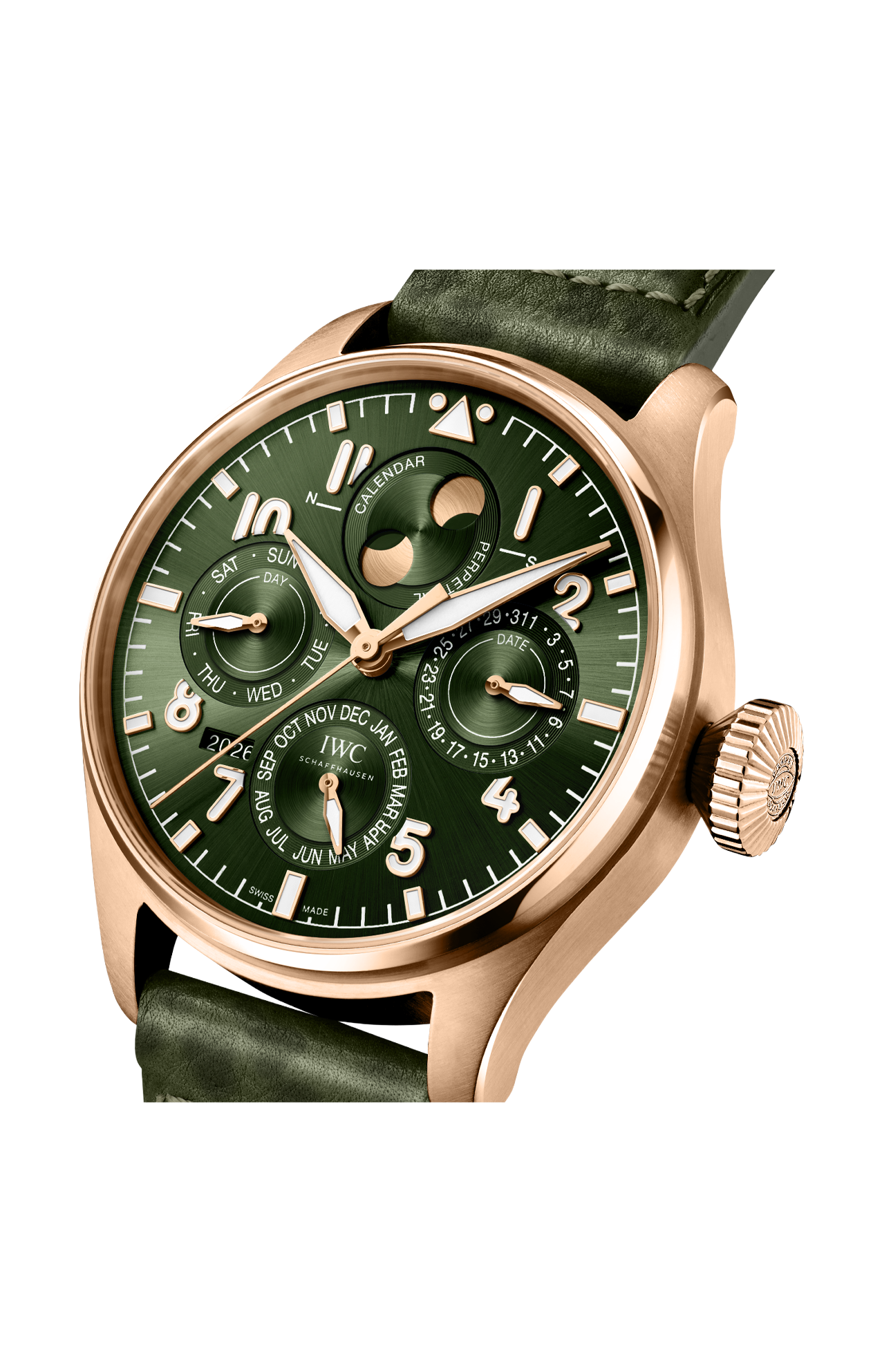 Il Big Pilot’s Watch Perpetual Calendar ProSet abbina una cassa e una corona in oro rosso 18 carati a un quadrante verde oliva con finitura soleil. Il Perpetual Calendar ProSet può essere regolato sia in avanti sia indietro tramite una singola posizione della corona, rendendo le correzioni del calendario semplici e intuitive come l’impostazione dell’ora.