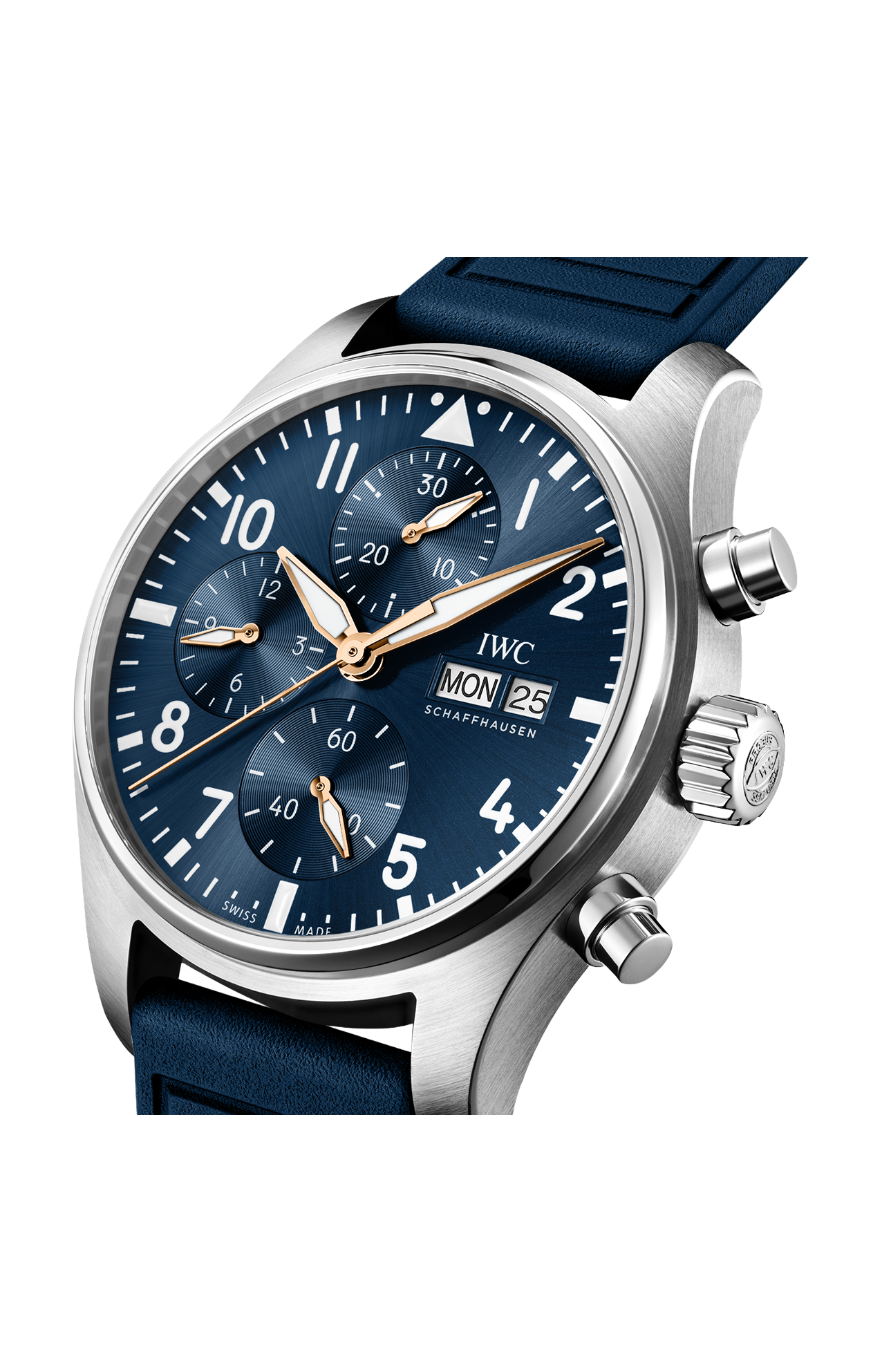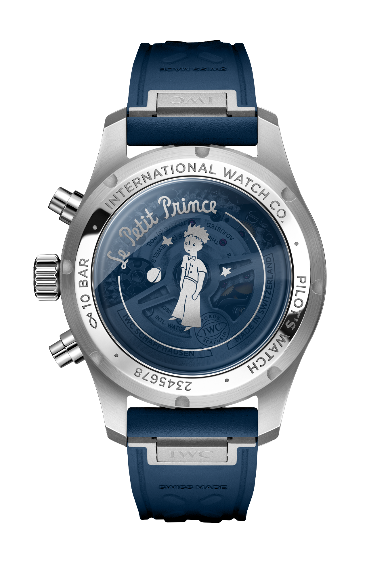 Il Pilot’s Watch Chronograph 41 Le Petit Prince coniuga la leggendaria tradizione degli orologi da pilota di IWC Schaffhausen con la magia dell’intramontabile racconto di Saint-Exupéry. Ispirata al Piccolo Principe, questa edizione speciale unisce funzionalità e ingegneria a un design poetico. La cassa in acciaio inossidabile misura 41 millimetri di diametro e crea un sorprendente contrasto con il quadrante blu intenso con finitura soleil, caratteristico di queste edizioni. Numeri e indici bianchi, insieme a lancette placcate oro riempite di Super-LumiNova®, conferiscono all’orologio un’estetica sportiva e raffinata allo stesso tempo. Il fondello in vetro zaffiro colorato rivela una delicata raffigurazione del Piccolo Principe, circondata dall’incisione “Le Petit Prince”, un pianeta e due stelle. A muovere il Pilot’s Watch Chronograph 41 Le Petit Prince è il calibro meccanico cronografico 69385 di manifattura IWC, un movimento cronografico meccanico caratterizzato da un classico design con ruota a colonne e da una riserva di carica di 46 ore. Il cinturino è realizzato in resistente caucciù blu e può essere sostituito con facilità grazie al pratico sistema EasX-CHANGE®, semplicemente premendo un bottone.