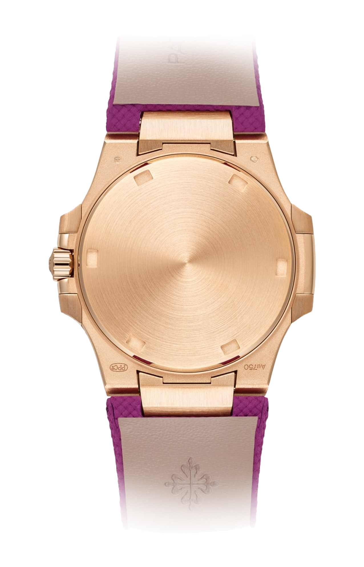 Patek Philippe reinterpreta il Nautilus da donna con movimento al quarzo, cassa in oro rosa di 32 mm e lunetta tempestata di gemme in una nuova versione originale e sofisticata. Il quadrante decorato con un motivo a piccole onde è ammantato da un elegante punto di viola laccato. La stessa nuance si ritrova anche sul cinturino in materiale composito ultrarresistente con motivo tessile e fermaglio déployant Nautilus in oro rosa. La piccola cassa, inconfondibile per la forma iconica ispirata alla sagoma di un oblò, sa catturare l’attenzione grazie alla sua alternanza di finiture satinate e lucide. La lunetta ottagonale è illuminata da 46 diamanti taglio brillante (0,8 ct).