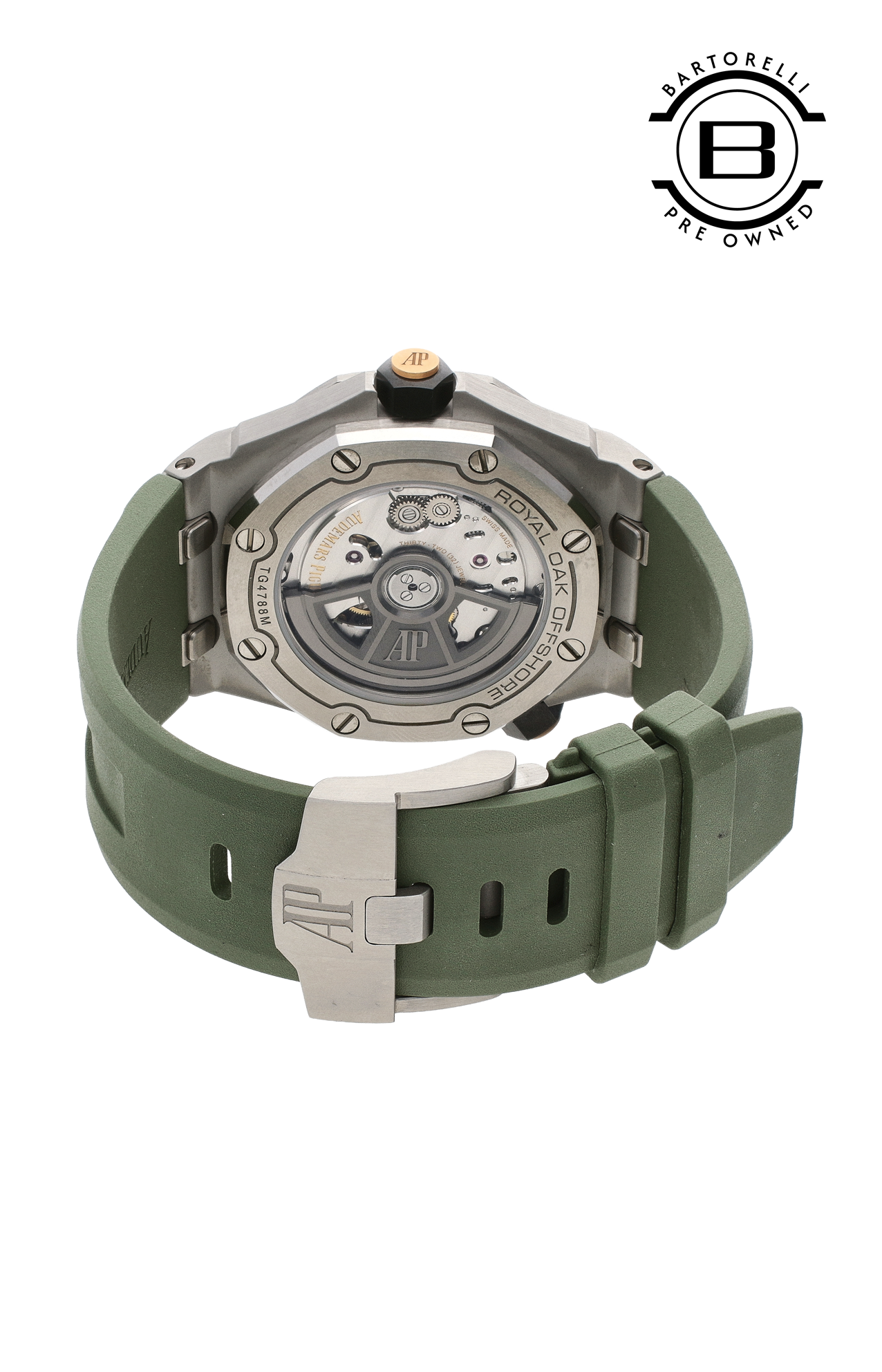 L’Audemars Piguet Royal Oak Offshore 15720ST.OO.A052CA.01 è un cronografo sportivo di alta orologeria che incarna lo spirito audace e dinamico della celebre collezione Offshore, pensato per chi ama prestazioni tecniche, estetica sportiva e lusso senza compromessi. La cassa da 42 mm in acciaio inossidabile offre robustezza e presenza al polso, con finiture satinate e lucidate che esaltano il caratteristico design ottagonale della lunetta con otto viti esagonali a vista, simbolo riconoscibile del Royal Oak. Il quadrante “Mégа Tapisserie” grigio-antracite è caratterizzato da contatori cronografici ben leggibili, indici applicati luminescenti e lancette tonde con rivestimento luminescente per una visibilità ottimale in ogni condizione di luce, mentre la finestrella della data è integrata con discrezione tra i contatori. Il movimento cronografo automatico di manifattura, con funzione cronografica a 12 ore, garantisce precisione e affidabilità, abbinando performance tecniche a un’esperienza d’uso quotidiana di alto livello. Protetto da vetro zaffiro antigraffio con trattamento antiriflesso e garantendo impermeabilità fino a 300 metri, questo segnatempo è progettato per resistere alle sollecitazioni della vita attiva senza rinunciare allo stile. Il cinturino in caucciù verde cachi intercambiabile, con fibbia ad ardiglione in acciaio, e il cinturino supplementare in caucciù nero uniscono comfort e sportività, rendendo l’orologio perfetto sia per l’uso quotidiano sia per occasioni più dinamiche. Il Royal Oak Offshore 15720ST.OO.A052CA.01 è una scelta ideale per chi cerca un cronografo che unisca lusso, sportività e prestazioni tecniche in un design iconico e riconoscibile.