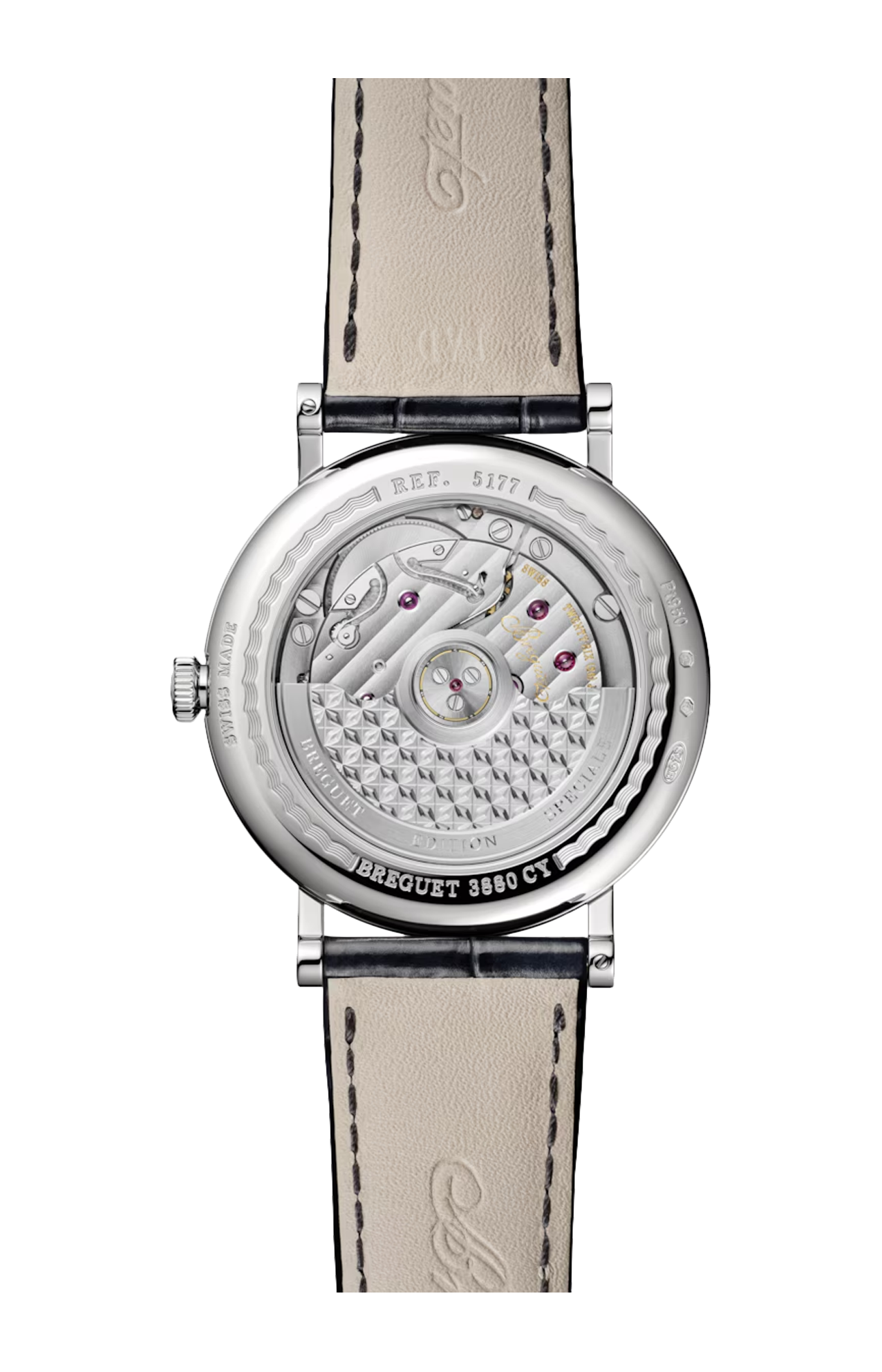 Prodotto Breguet puro, questo modello presenta tutte le raffinatezze di un orologio della collezione Classique: una cassa scanalata, fondello trasparente, anse, un quadrante disponibile in smalto "grand feu" o finitura guilloché e lancette Breguet con le loro caratteristiche punte aperte.