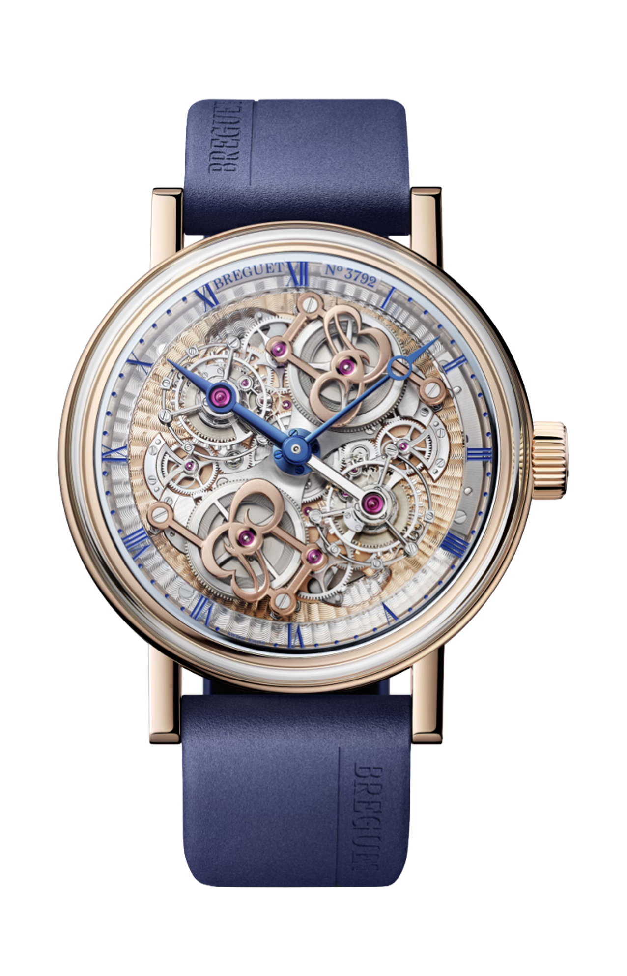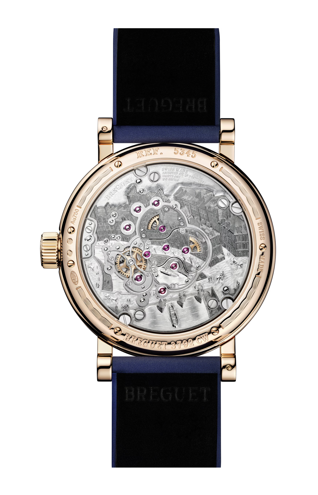 Il complesso del meccanismo, esposto allo sguardo, compie una rivoluzione completa ogni 12 ore. Ciascuno dei due tourbillon ruota indipendentemente dall’altro, effettuando una rotazione completa in un minuto. Gli organi di regolazione, connessi tra di loro, compiono a loro volta una doppia rivoluzione, mettendo in moto il ponte dei tourbillon e dunque l’audace lancetta delle ore. La maestria orologiera di Breguet procede di pari passo con il virtuosismo estetico: ciascuna componente è rifinita a mano, mentre sul fondello è incisa una raffigurazione della “Maison du Quai de l’Horloge”, l’edificio parigino in cui A. L. Breguet diede vita al complesso della sua opera.