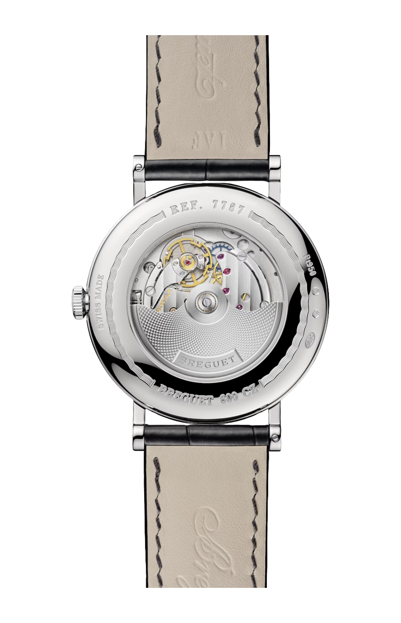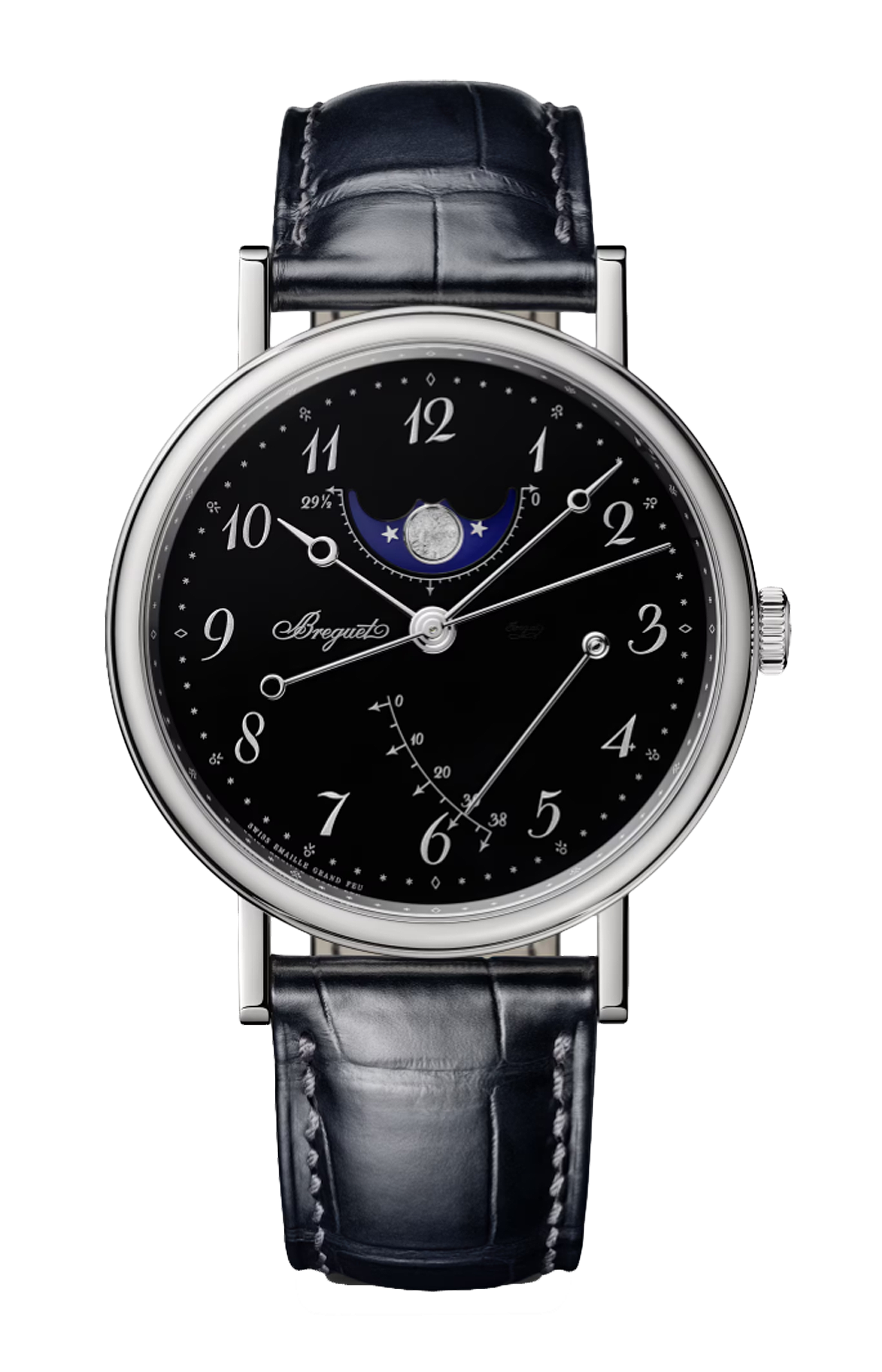 Questo orologio con quadrante in smalto “Grand Feu” è un fedele riflesso delle tecniche, dell’arte orologiera e dei valori tradizionali di Breguet. Con ore, minuti e secondi al centro, questo modello presenta anche due complicazioni: una fase lunare situata a ore 12 e una riserva di carica a ore 3. Quest’ultima può essere letta grazie a una lancetta particolarmente lunga, leggibile ed elegante.