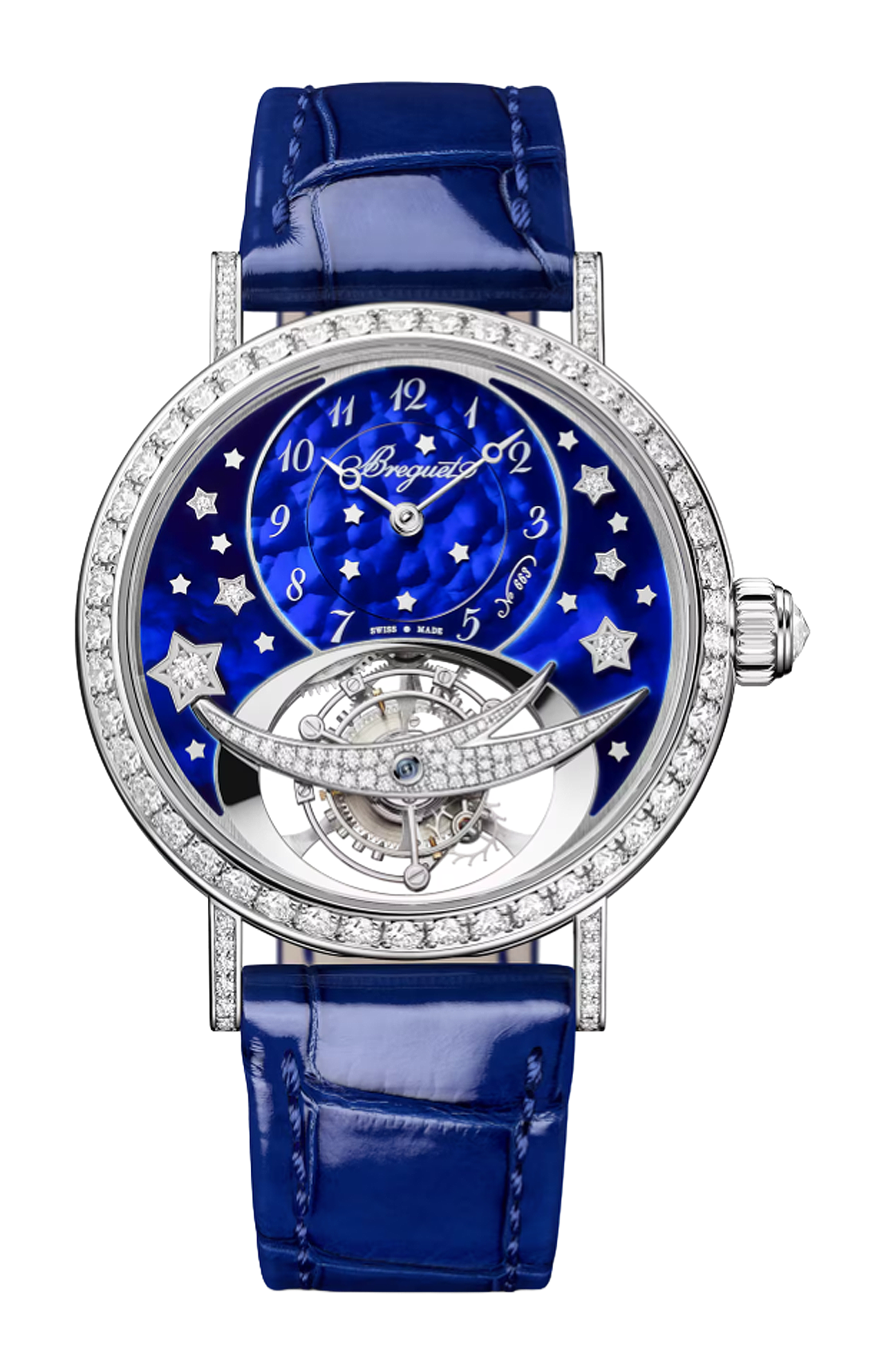 Madreperla e diamanti circondano il tourbillon posto all’interno di un’ampia apertura curva e ovale. La versione in oro rosa mostra l’ora su un giro delle ore in madreperla naturale bianca con al centro dei diamanti incastonati a neve. Sul modello in oro bianco, il quadrante in madreperla perlata e verniciata blu notte è costellato di stelle che richiamano un cielo notturno. Il ponte del tourbillon rievoca una stella cadente composta da diamanti con incastonatura a neve.