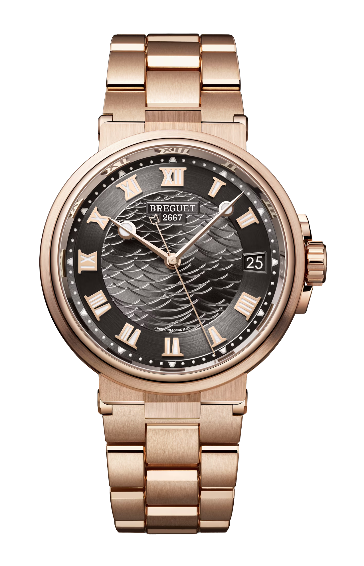 Numerosi dettagli esprimono lo spirito della collezione Marine, tra cui la lancetta dei secondi che si conclude con la bandiera nautica con iniziale Breguet. La corona di questo segnatempo da 40 mm è decorata da un motivo a forma di onda. Sul retro, il fondello in vetro zaffiro svela allo sguardo un meccanismo automatico con massa automatica che ricorda un timone.