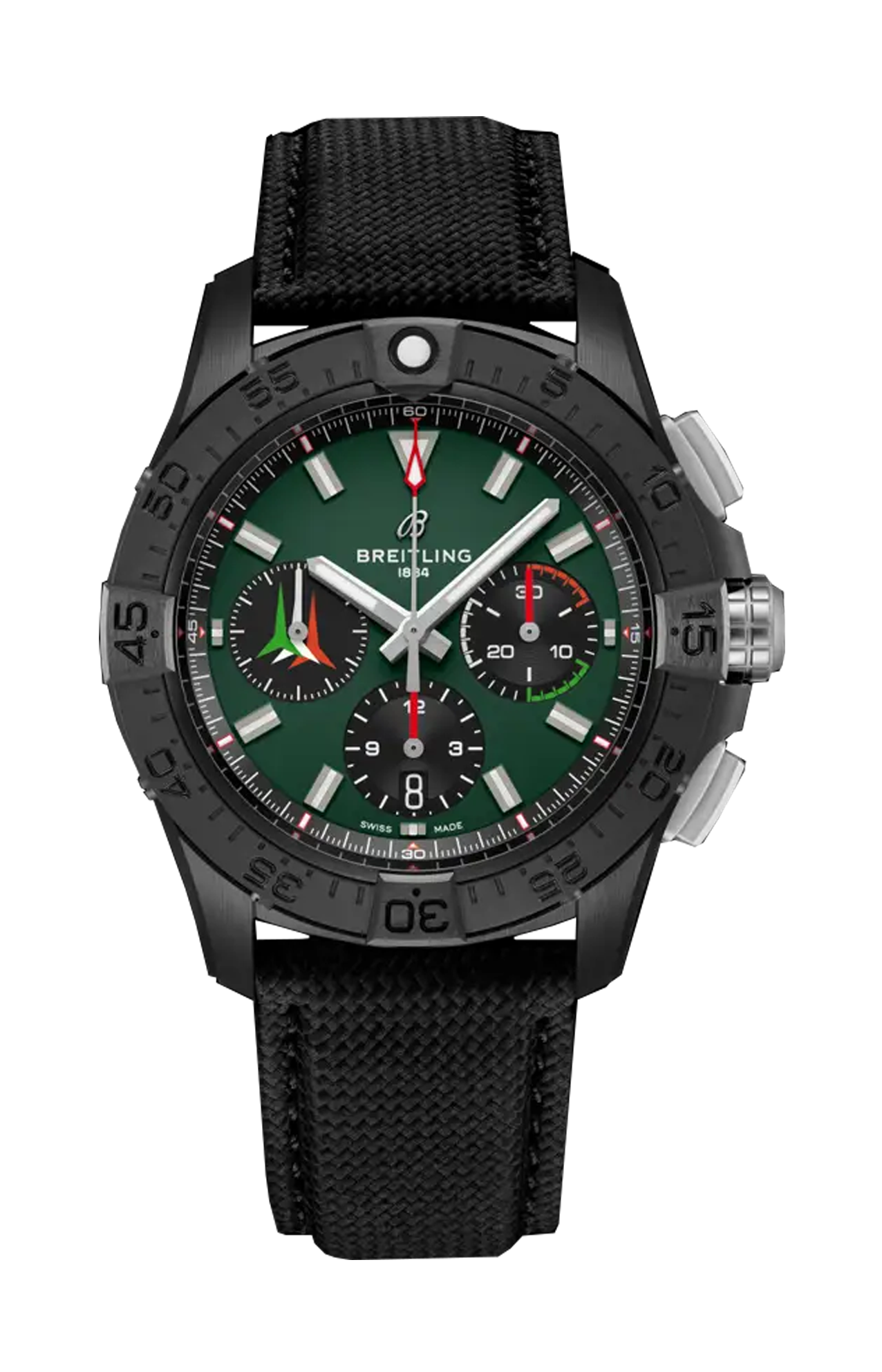 Ideato per i piloti di jet, l’Avenger è progettato per affrontare le cabine di pilotaggio più ardue, senza mai tirarsi indietro. Questa edizione è dedicata alle Frecce Tricolori, la famosa pattuglia di volo acrobatica italiana che affascina il pubblico di tutto il mondo con le sue esibizioni mozzafiato di abilità e precisione. Ma non serve essere un asso dell’aviazione militare per apprezzarne l’audace design, l’eccezionale resilienza e la funzionalità sempre un passo avanti. Questa versione presenta un quadrante verde opaco ornato dall’emblema delle Frecce Tricolori e un’incisione dedicata che circonda il fondello a vista del calibro di manifattura Breitling 01. Si contraddistingue inoltre per una cassa in ceramica nera e una minuteria in titanio, corredate da un cinturino in pelle militare. Il tonneau a botte non sarà forse per tutti, ma chiunque apprezzerà ogni minimo dettaglio della sua impermeabilità fino a 300 m, la maneggevole funzionalità e la costruzione resistente alla corrosione.