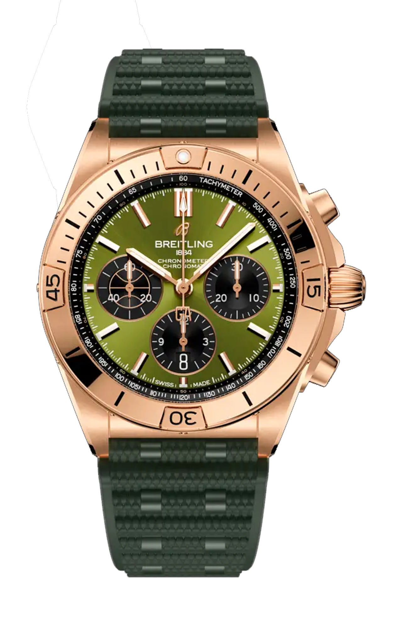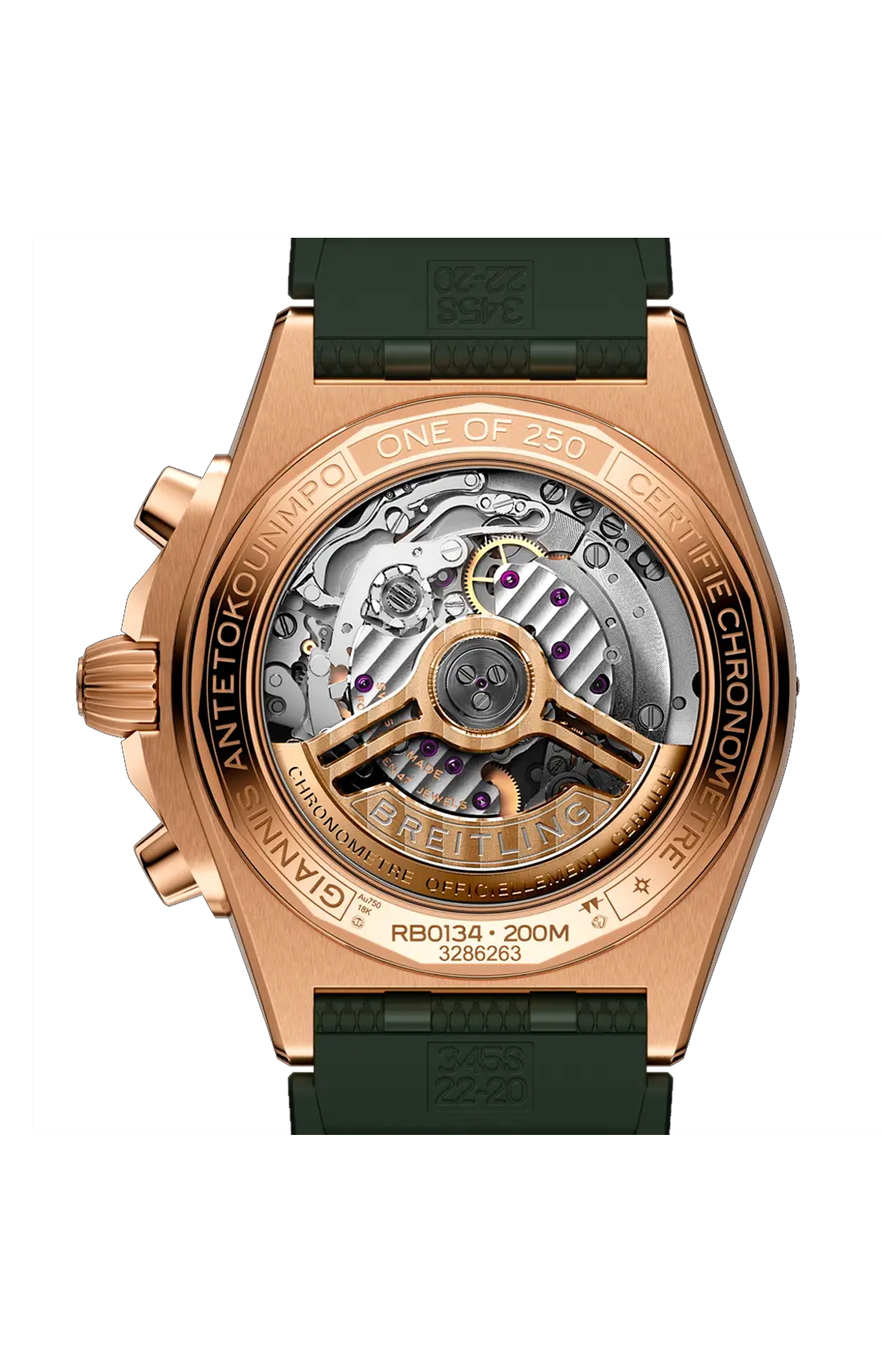 Il versatile Chronomat di Breitling in edizione limitata in collaborazione con Giannis Antetokounmpo. Limitata a soli 2000 pezzi, la collezione di Chronomat firmata da Giannis Antetokounmpo combina la nostra maestria artigianale senza tempo con lo stile disinvolto del giocatore di basket professionista. È caratterizzata da colorazioni verdi scelte da Giannis stesso e conserva nel contempo elementi di design classici del Chronomat come il bracciale «Rouleaux», in metallo o in caucciù, e i cavalieri rialzati ai 15 minuti. Da notare il contrappeso sulla lancetta centrale che riporta le iniziali dell’atleta «GA» e il profilo del pallone da basket sul contatore dei secondi del cronografo, in omaggio alla sua professione e passione. L’indicazione di edizione limitata, «One of 1750» per l’automatic GMT in acciaio inossidabile da 40 mm oppure «One of 250» per il cronografo in oro rosso oro 18 carati da 42 mm, è incisa sul fondello. Ogni orologio viene venduto in una confezione speciale con una nota di Giannis. Appassionato di orologi, Giannis ha anche disegnato il suo esclusivo Chronomat, caratterizzato da un quadrante panda inverso verde e da numeri arabi orientali, ma questo esemplare unico si può vedere solo a bordo campo. La collezione di Chronomat Giannis Antetokounmpo è destinata a coloro che si riconoscono nella potenza, nella precisione e nelle prestazioni performance dell’MVP del basket, tratti condivisi dai nostri segnatempo.