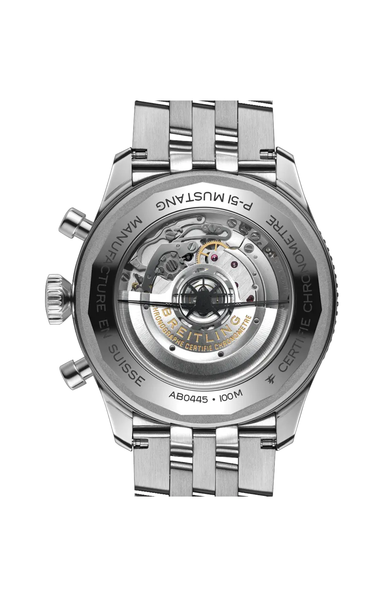 Dai coraggiosi decolli, i primi nella storia, fino alla nascita dei viaggi aerei commerciali, la storia di Breitling è inscindibile da quella del volo. Negli anni '30, l’Huit Aviation Department di Breitling diventa famoso grazie all’invenzione di orologi di precisione per la cabina di pilotaggio. Vent’anni dopo, Breitling presenta un altro strumento per il volo, questa volta indossabile: il Ref. 765 AVI. Questo orologio pionieristico per piloti ha fornito la base tecnica per l’attuale Super AVI, una collezione ispirata allo spirito vigoroso dei primi celebri aeroplani. Il Super AVI P-51 Mustang rende omaggio a una di queste leggende. Alla sua costruzione, avvenuta in soli 120 giorni, persino la North American Aviation, che l’aveva progettato, non si aspettava di avere tra le mani un velivolo tanto potente. Le ali a bassa inerzia e il sistema di raffreddamento del motore del P-51, sperimentali quando il caccia monoposto spicca il volo per la prima volta nel 1940, gli permettono di raggiungere una velocità e una versatilità senza precedenti. L’aggiunta di un motore Merlin porta tutte le prestazioni del velivolo ad altitudini superiori, rendendolo il caccia più versatile della sua epoca. Essendo un vero orologio da pilota progettato per resistere alle asprezze della cabina di pilotaggio dell’epoca, il Super AVI P-51 Mustang presenta grandi numeri arabi facilmente leggibili su quadrante e lunetta. La corona sovradimensionata e la lunetta zigrinata su questa robusta cassa da 46 mm forniscono una presa ottimale anche per le mani di un pilota che indossa i guanti. I cinturini in pelle di vitello impunturata sono un richiamo alle cuciture sui rivestimenti delle cabine di pilotaggio classiche, mentre l’opzionale bracciale in acciaio inossidabile offre un’elegante alternativa. Piloti e viaggiatori apprezzeranno la possibilità di visualizzare un secondo fuso orario grazie all’indicatore delle 24 ore sulla lunetta interna e alla lancetta GMT con la sua punta rossa. Il meccanismo del movimento del Super AVI è il calibro di manifattura Breitling B04 certificato COSC che offre circa 70 ore di riserva di carica.