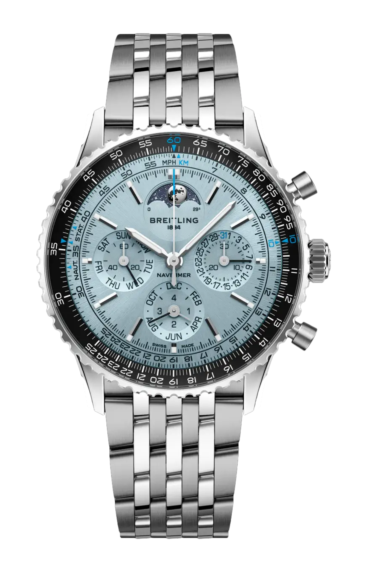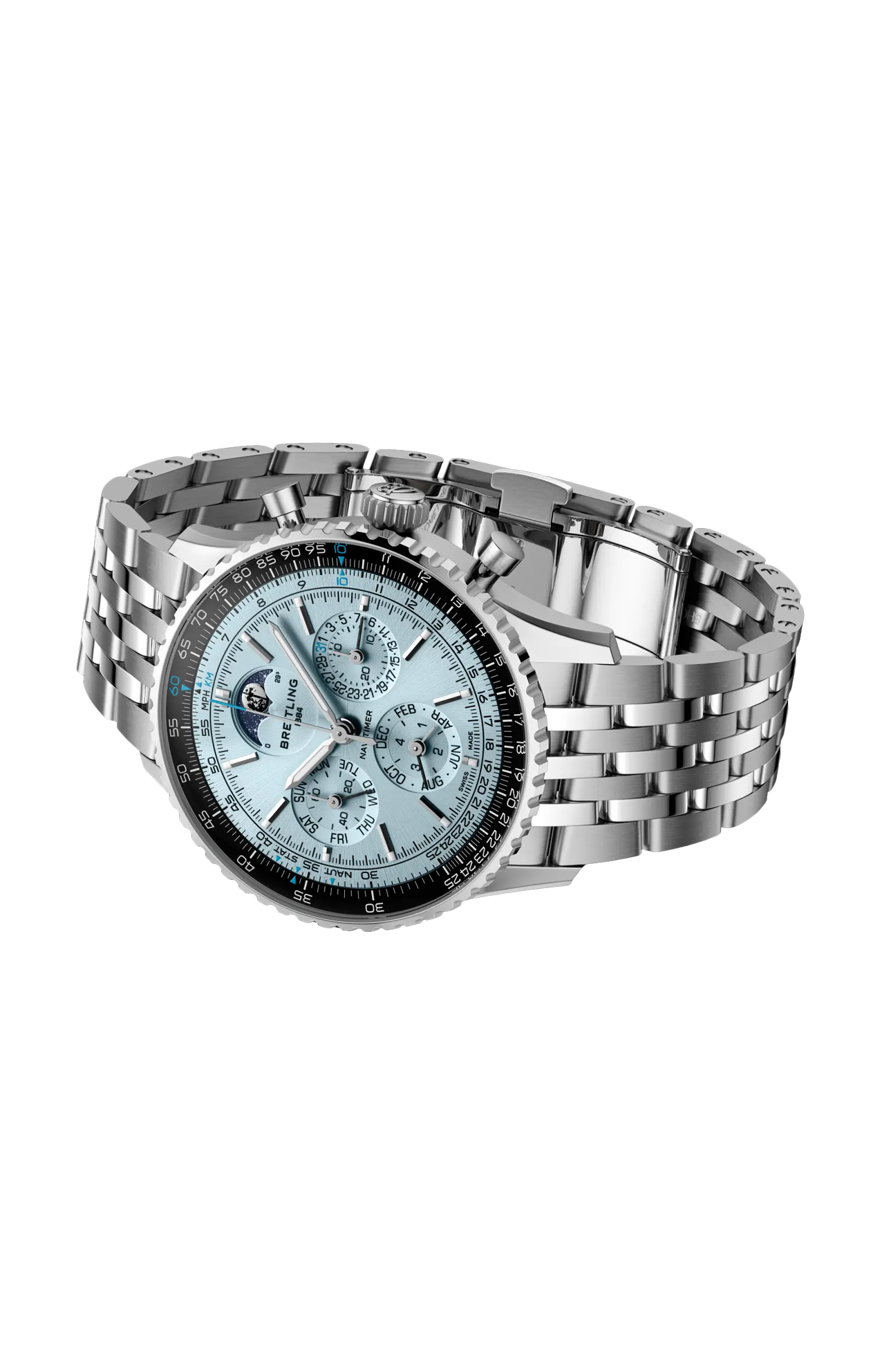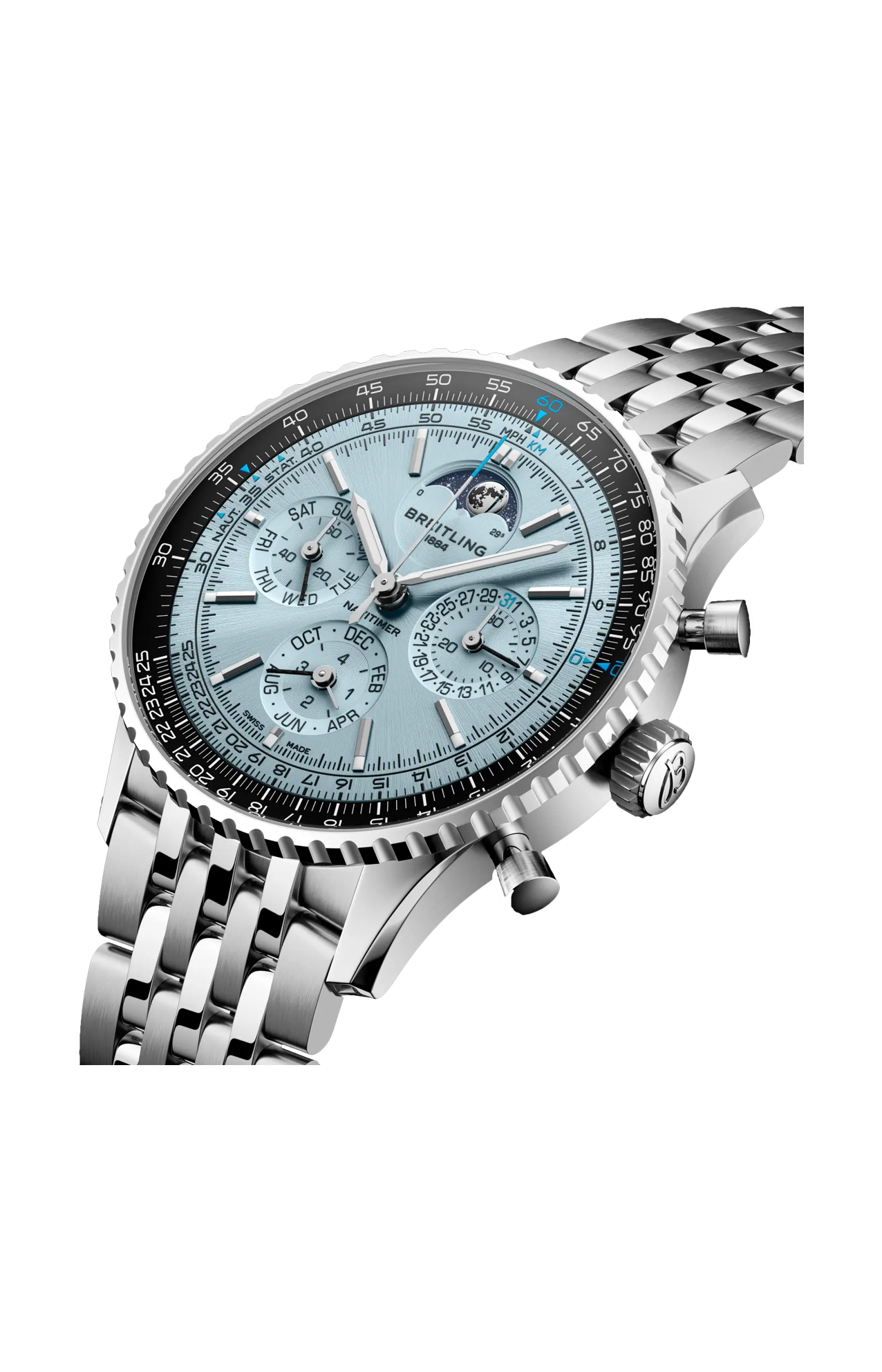 In occasione del 140° anniversario abbiamo introdotto il calibro B19, il primo esclusivo movimento cronografico con calendario perpetuo di Breitling. E proprio questo importante traguardo è il motore del nuovo Navitimer in edizione speciale, un orologio dalla storia leggendaria. Creato per la prima volta nel 1952 per la Aircraft Owners and Pilots Association (AOPA), il Navitimer fu progettato per garantire precisione nella cabina di pilotaggio, combinando un movimento cronografico con il regolo calcolatore circolare brevettato da Breitling. Amato dai piloti per la sua funzionalità di computer di volo, trovò presto un seguito anche al di fuori del mondo dell'aviazione, conquistando atleti, musicisti e persino astronauti. Nel 1962 fu il primo orologio da polso svizzero a essere utilizzato nello spazio. Questa edizione collega passato e futuro: cassa in acciaio, lunetta in platino, quadrante blu ghiaccio e lo straordinario movimento B19, un cronografo automatico con calendario perpetuo. Un orologio ispirato alla tradizione e realizzato per la vita di oggi.