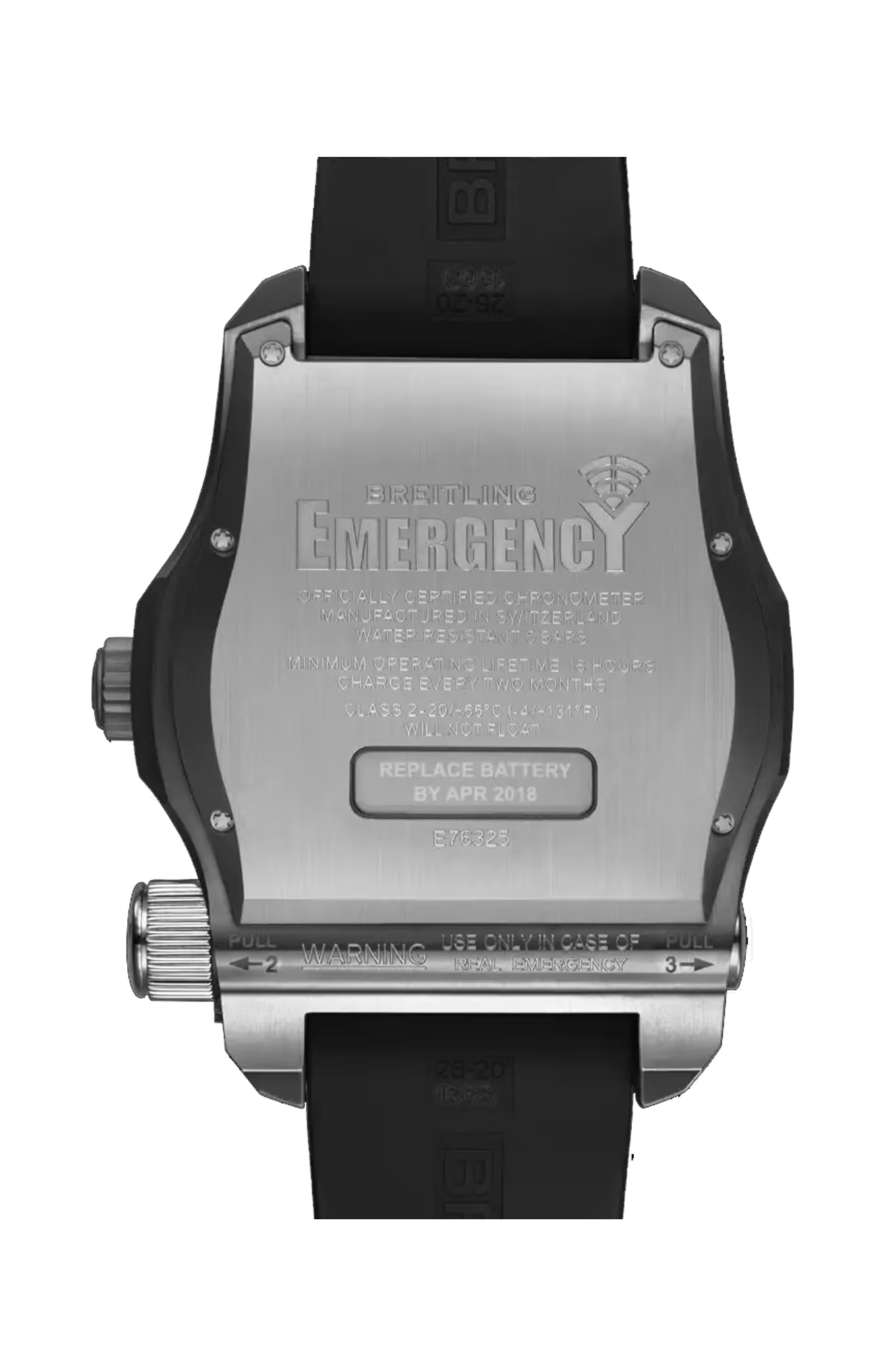 L’EMERGENCY è il primo orologio da polso al mondo dotato di un autentico segnalatore d’urgenza a doppia frequenza. Si tratta di uno strumento di sicurezza e di sopravvivenza indispensabile per gli avventurieri impegnati in una determinata missione. Creando l’EMERGENCY, BREITLING ha acquisito una posizione di prim’ordine in tema di innovazione. Capolavoro di miniaturizzazione e sofisticatezza tecnica, l’EMERGENCY è il primo orologio da polso dotato di un autentico segnalatore d’urgenza a doppia frequenza. Una volta attivato, il segnalatore d’urgenza emetterà un segnale di allarme in grado di guidare le operazioni di salvataggio. Disponibile sia in titanio che in titanio con rivestimento DLC, l’EMERGENCY è dotato di un quadrante nero abbinato a un bracciale in titanio coordinato, oppure a un cinturino in caucciù con fibbia deployante. Alimentato dal calibro BREITLING 76, un cronografo SuperQuartz™ certificato COSC, l’EMERGENCY dispone di una batteria ricaricabile, di un trasmettitore miniaturizzato e di un originale sistema ad antenna integrata.