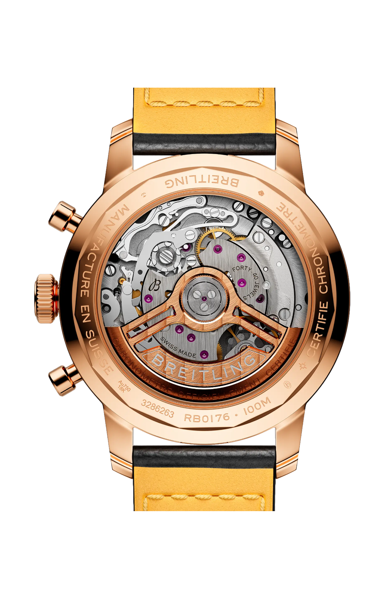 Gli anni ’60 sono stati un decennio di sperimentazione, divertimento, libertà ed energia. La parola d’ordine per quei giorni era vivere la vita alla massima velocità: in sella a una moto per lunghi viaggi, o a bordo di un’auto sportiva. Willy Breitling percepì questo cambio di passo e decise di progettare un cronografo non convenzionale che avrebbe catturato la verve del periodo. E lo chiamò Top Time. Questa grande tradizione continua oggi con il Top Time B01 che sfoggia un cinturino in stile racing in pelle traforata, la scala tachimetrica per la misurazione della velocità e i contatori a contrasto «Squircle» (non proprio quadrati, non proprio tondi) che ricordano il contagiri vintage dei cruscotti. Sotto il cofano, ha anche un nuovo motore di cui vantarsi: lo straordinario calibro di manifattura Breitling 01.
