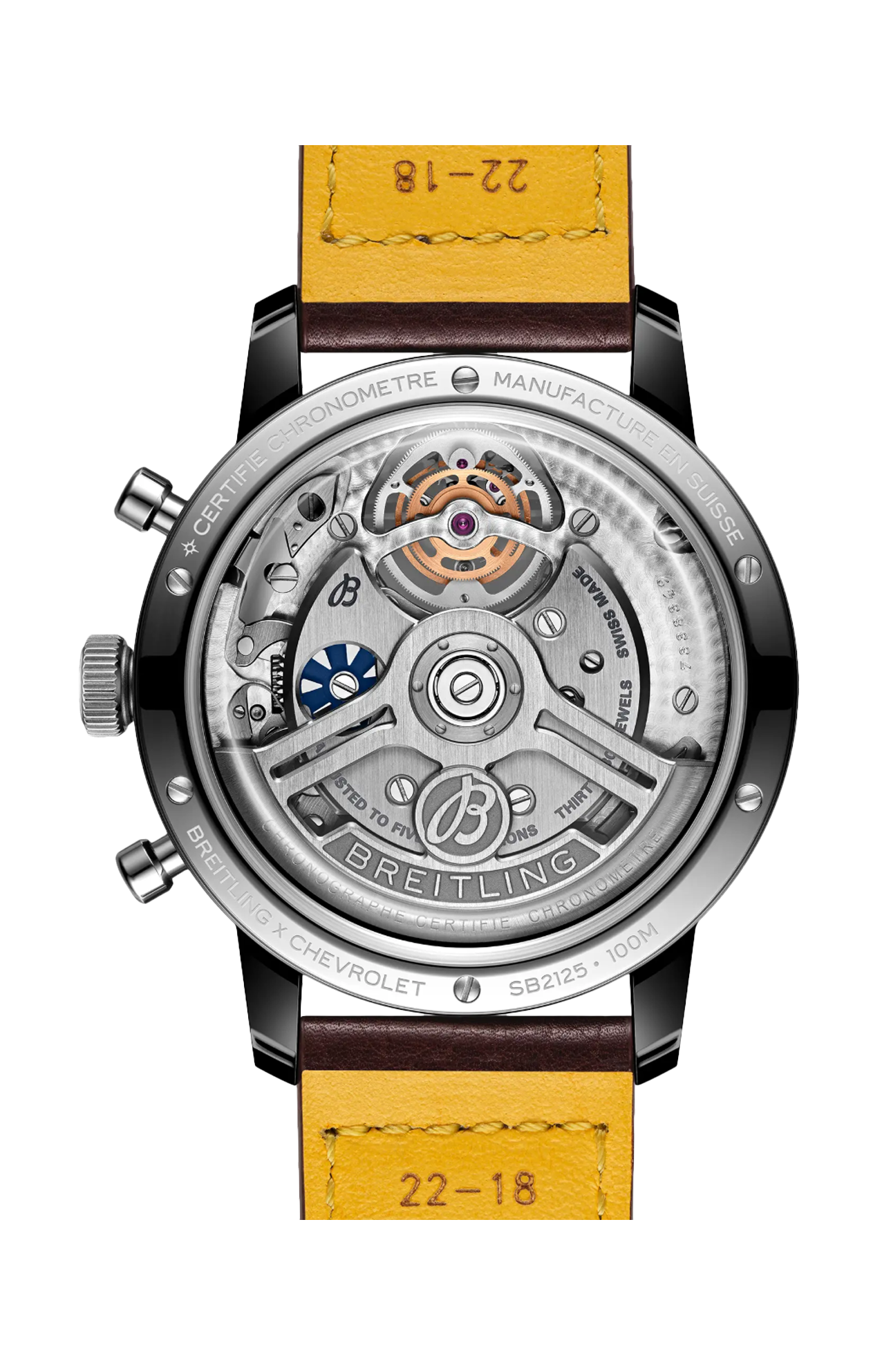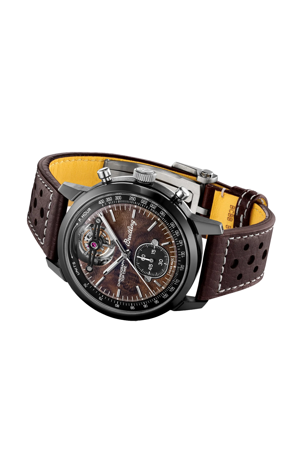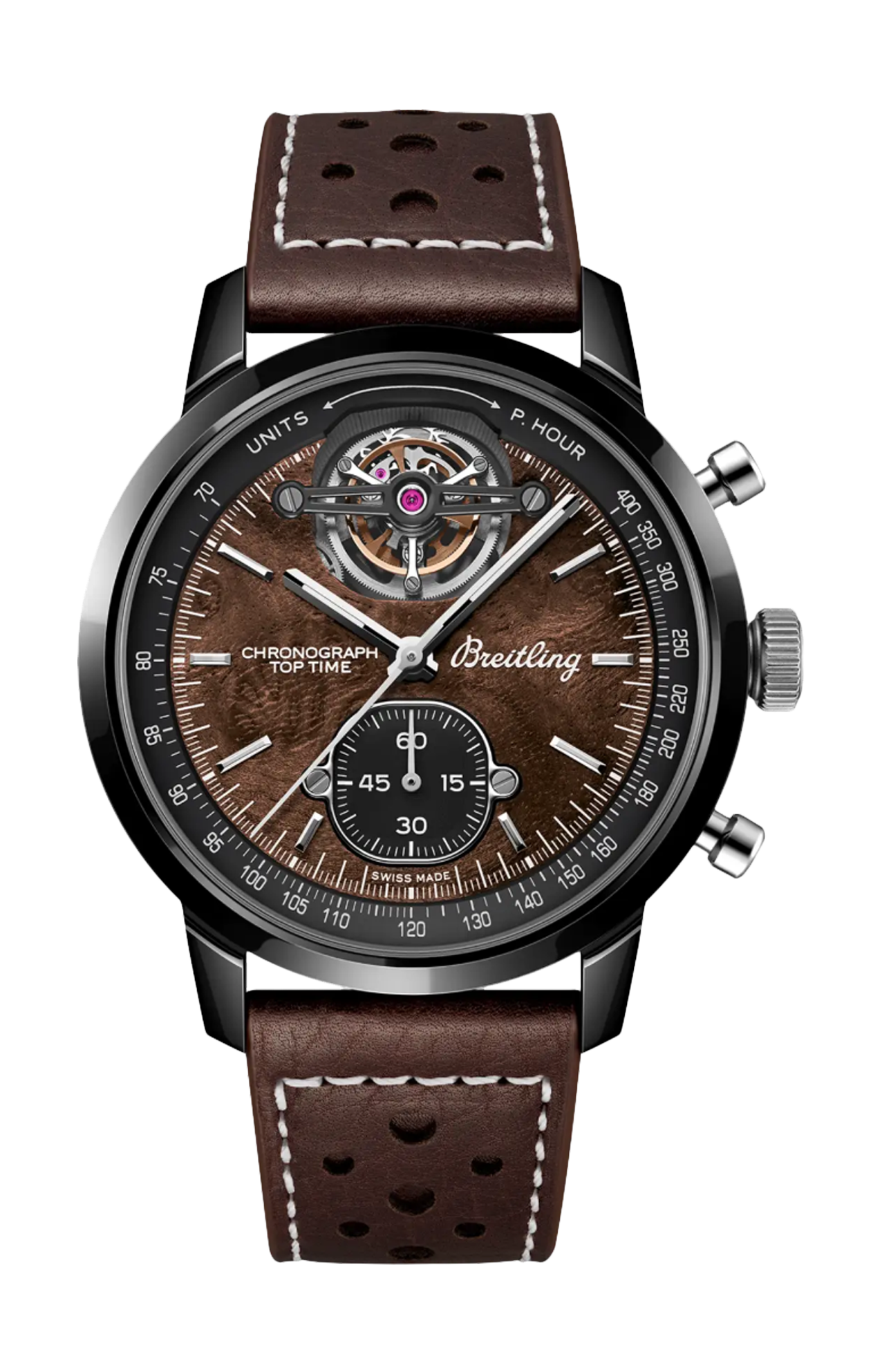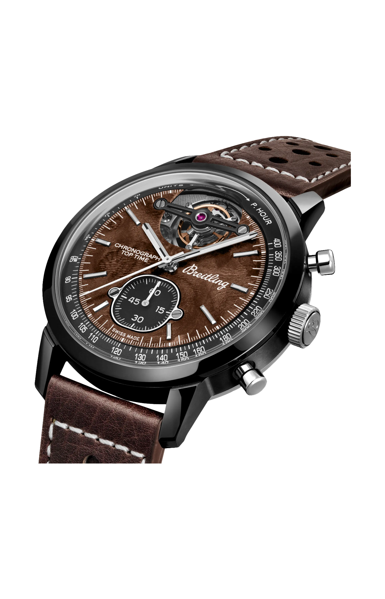 Gli anni ’60 sono stati un decennio di sperimentazione, divertimento, libertà ed energia. La parola d’ordine di quei giorni era vivere la vita alla massima velocità: in sella a una moto per lunghi viaggi o a bordo di un’auto sportiva. Willy Breitling percepì questo cambio di passo e decise di progettare un cronografo non convenzionale che avrebbe catturato la verve del periodo. E lo chiamò Top Time. Quella tradizione ricca di spirito continua ancora oggi. Breitling collabora con alcuni dei nomi più cool del mondo dei motori per creare i propri design Top Time. La Chevrolet Corvette di seconda generazione, distribuita tra il 1963 e il 1967, è la versione più ricercata di questa leggenda americana. Il cosiddetto modello «Sting Ray» si ispirò a un prototipo di vettura da corsa del 1959. Per 60 anni, ha catturato l’immaginazione degli amanti delle auto di tutto il mondo con la sua perfetta combinazione di carrozzeria a basso profilo e motore potente, che garantisce prestazioni sia in strada sia su pista. Il Top Time B21 Chevrolet Corvette presenta un quadrante in radica (che ricorda il volante dell’auto classica), nonché un cinturino in stile racing in pelle traforata, la scala tachimetrica per la misurazione della velocità e i contatori a contrasto «Squircle» (non proprio quadrati, non proprio tondi) che ricordano i contagiri vintage dei cruscotti. All’interno del suo telaio in ceramica e titanio ruggisce un motore di cui vantarsi: l’eccezionale Chronograph Tourbillon B21 di La Joux-Perret.