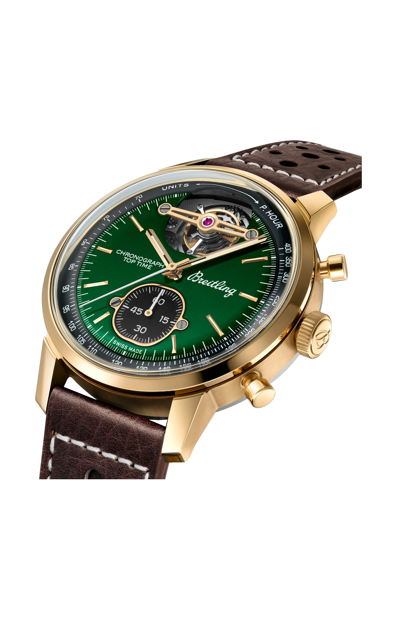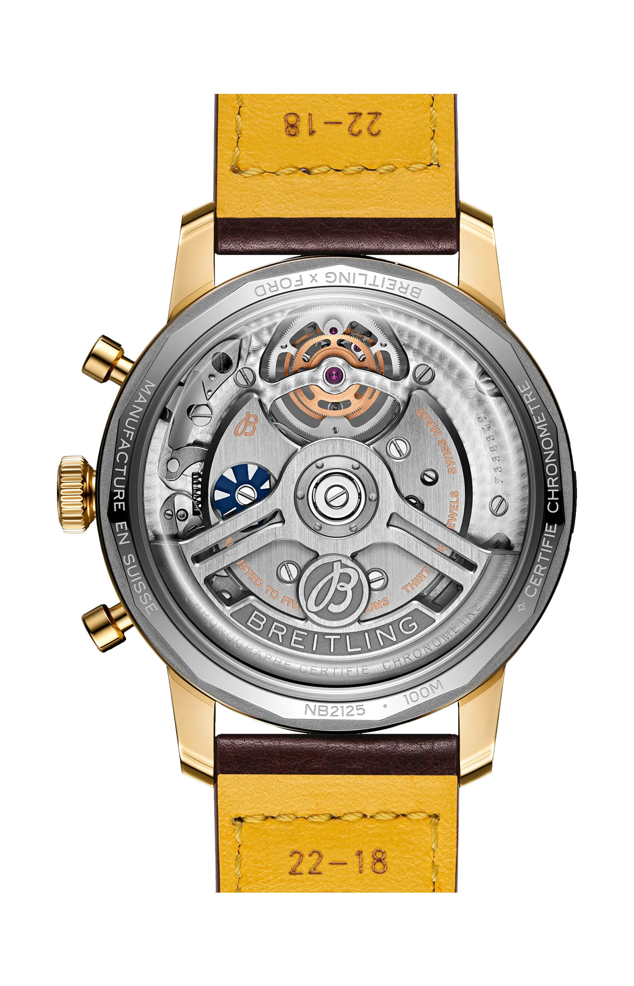 Gli anni '60 sono stati un decennio di sperimentazione, divertimento, libertà ed energia. La parola d’ordine di quei giorni era vivere la vita alla massima velocità: in sella a una moto per lunghi viaggi o a bordo di un’auto sportiva. Willy Breitling percepì questo cambio di passo e decise di progettare un cronografo non convenzionale che avrebbe catturato la verve del periodo. E lo chiamò Top Time. Quella tradizione ricca di spirito continua ancora oggi. Breitling collabora con alcuni dei nomi più cool del mondo dei motori per creare i propri design Top Time. La Ford Mustang di prima generazione, prodotta dal 1964 al 1974, divenne l’auto più amata per viaggiare in America nei fantastici anni '60. Un’autentica leggenda ancora in produzione, anche se gli esperti sanno che le Mustang migliori furono quei primissimi modelli che contribuirono a catturare lo spirito libero degli anni '60. Il Top Time B21 Ford Mustang presenta i colori dell’omonima auto classica, nonché un cinturino in stile racing in pelle traforata, la scala tachimetrica per la misurazione della velocità e i contatori a contrasto «Squircle» (non proprio quadrati, non proprio tondi) che ricordano i contagiri vintage dei cruscotti. All’interno del suo telaio in bronzo e titanio ruggisce un motore di cui vantarsi: l’eccezionale Chronograph Tourbillon B21 di La Joux-Perret.
