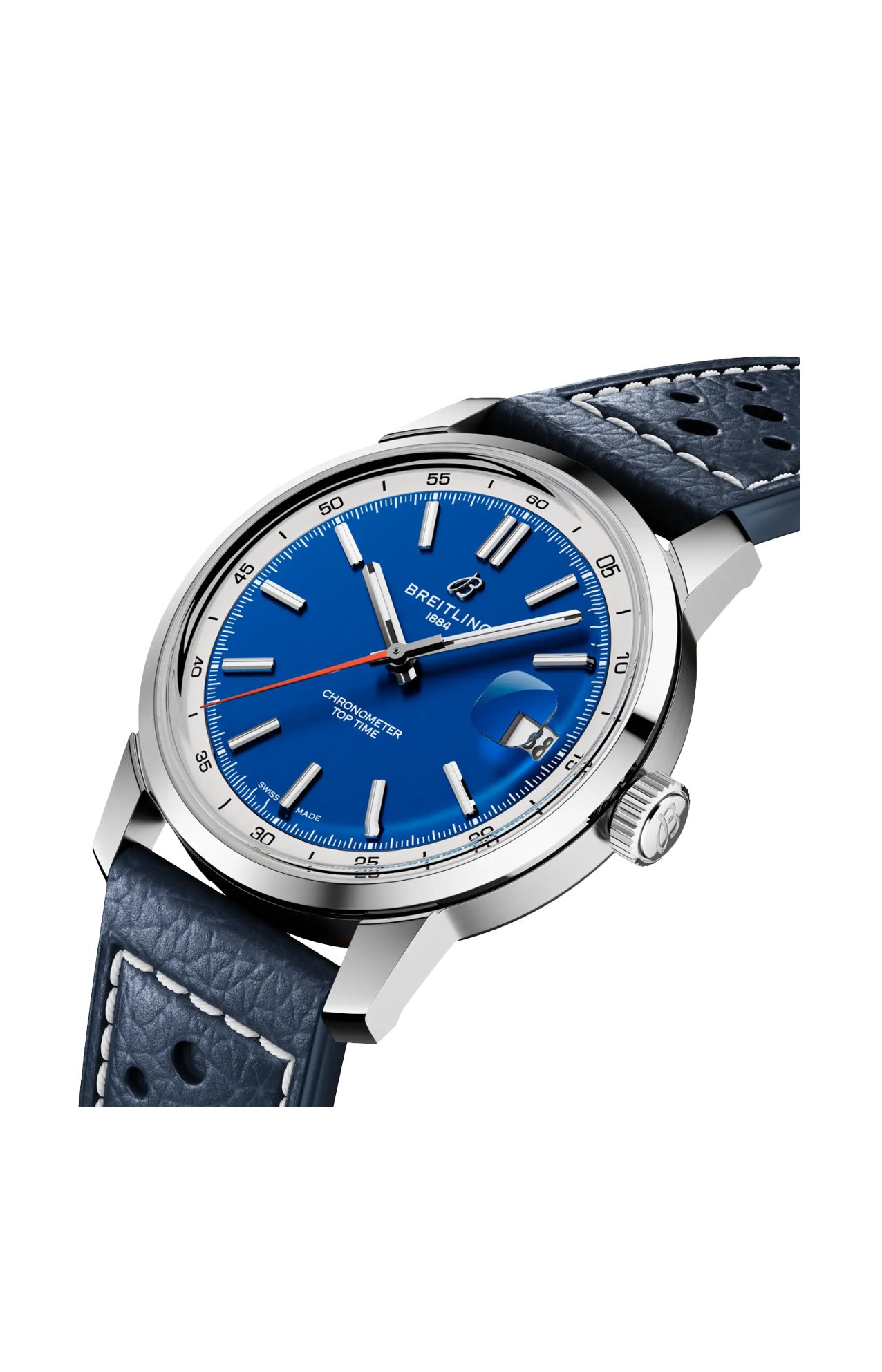 Il Top Time B31, novità del 2025, segna il debutto del movimento di manifattura Breitling B31. La cassa da 38 mm, fedele al DNA della linea, gli conferisce uno stile impeccabile, adatto a qualsiasi polso. Il Top Time B31 combina l'estetica retrò con il fascino contemporaneo. Il quadrante trae ispirazione dai cruscotti delle auto d’epoca, mentre la cassa da 38 mm coniuga proporzioni vintage e design contemporaneo, in una dimensione universale perfetta per qualsiasi polso. Il modello è disponibile in tre diverse colorazioni—verde, blu o bicolore bianco e azzurro—con bracciale in acciaio a tre file o cinturino in pelle di vitello traforata ispirato ai guanti da corsa. Dai viaggi on the road alla vita quotidiana, il Top Time B31 rende omaggio all’individualità e all’avventura, sempre e dovunque.