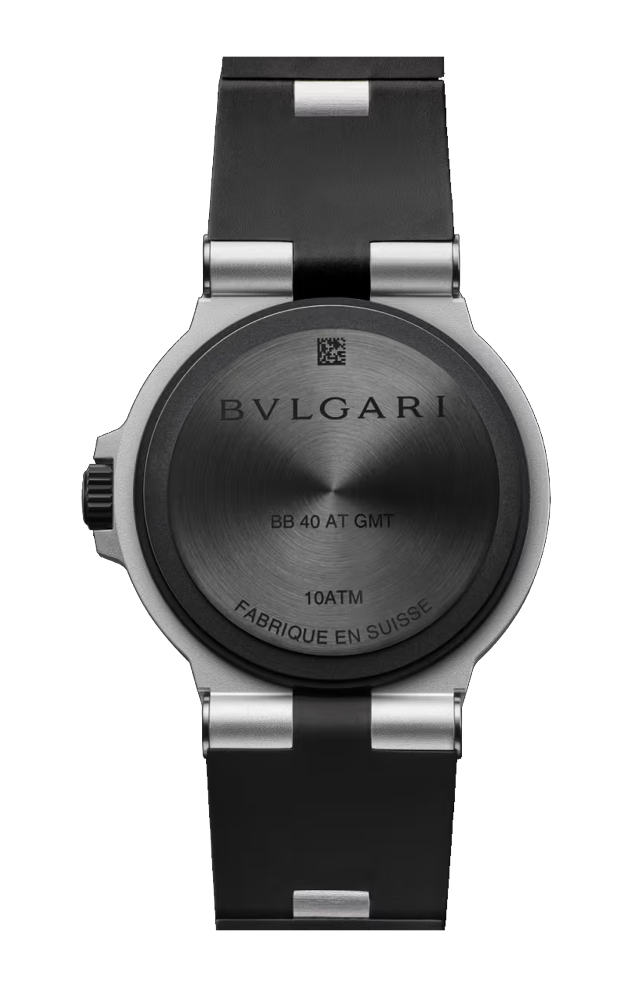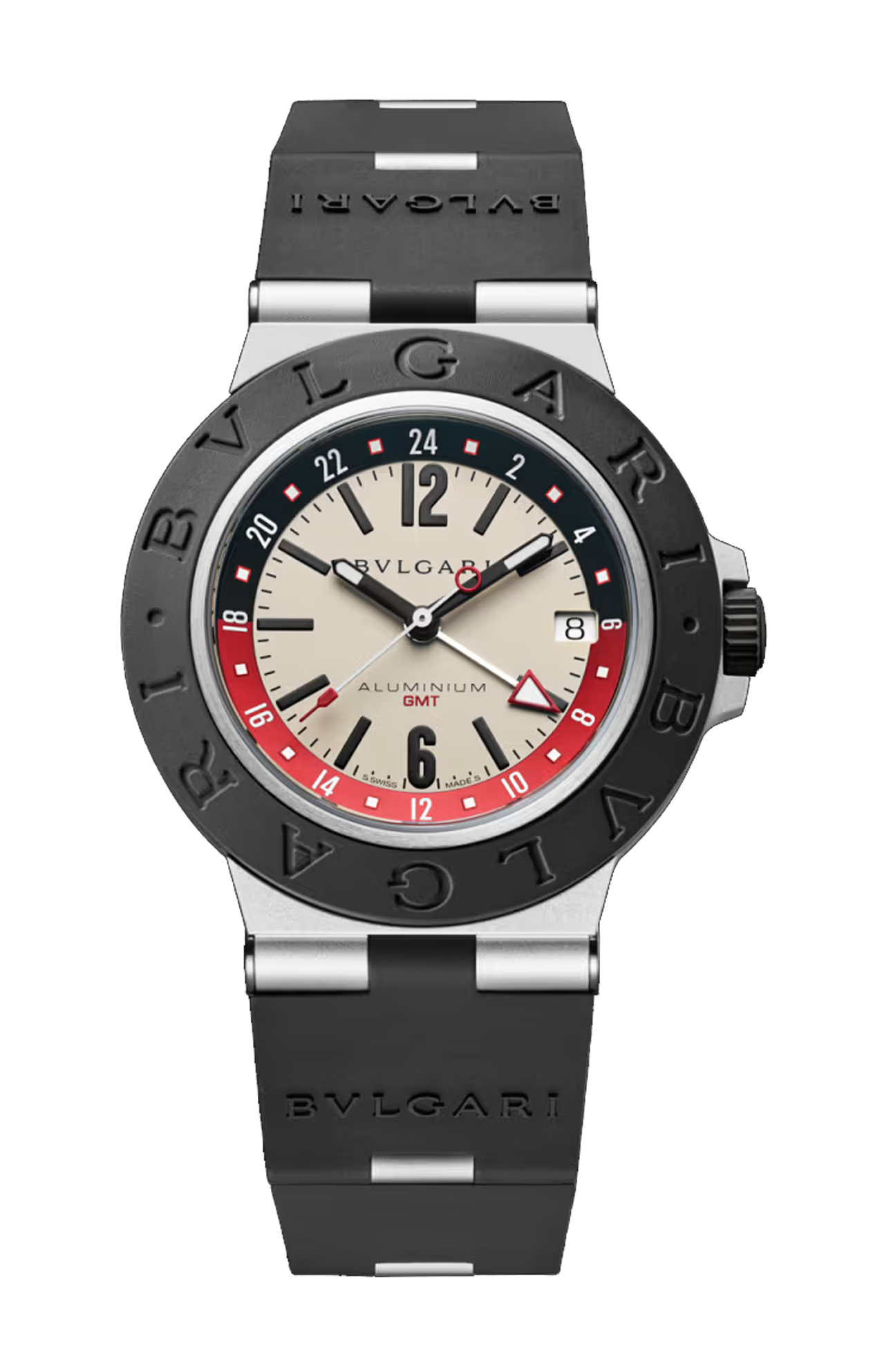 Orologio BVLGARI ALUMINIUM GMT con movimento meccanico a carica automatica, funzioni ore, minuti, secondi, data e GMT 24H, riserva di carica di 42 ore. Calibro B192, cassa di 40 mm in alluminio con trattamento DLC, lunetta in caucciù nero con doppio logo, quadrante bianco con scala 24 ore nera e rossa, lancette e indici neri con SLN™, lancetta 24 ore con punta bianca e rossa, finestrella della data a ore 3, fondello in titanio, anse in alluminio e cinturino in caucciù nero con fibbia ad ardiglione in alluminio. Impermeabile fino a 100 metri.
