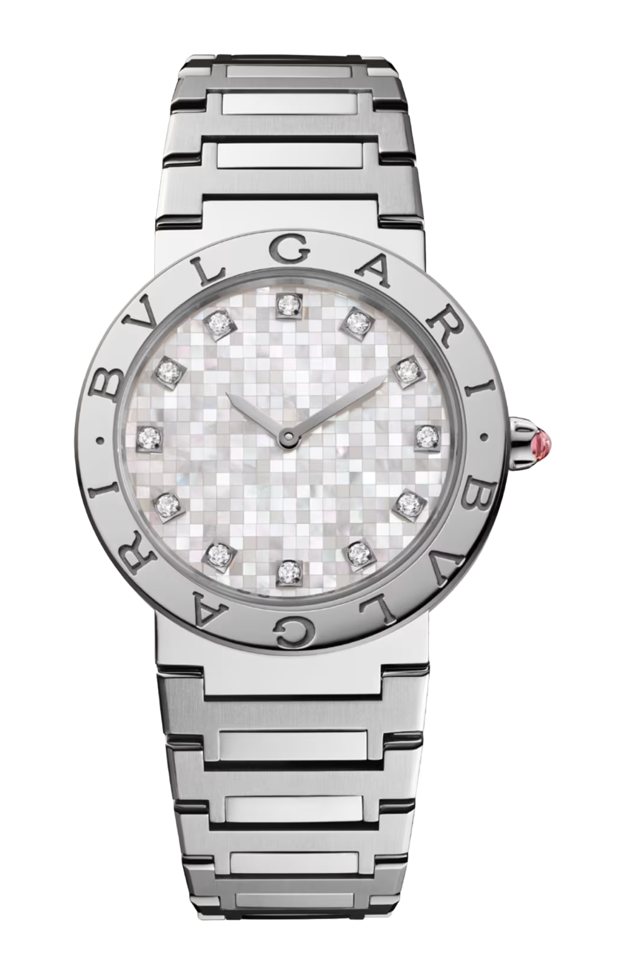Orologio BVLGARI BVLGARI con movimento al quarzo, funzioni ore e minuti, cassa di 33 mm in acciaio inossidabile lucido e lunetta con doppio logo, quadrante a mosaico in madreperla bianca, indici con 12 diamanti tondi taglio brillante, corona in acciaio inossidabile con rubellite rosa taglio cabochon e bracciale con fibbia DÉPLOYANTE in acciaio inossidabile lucido e satinato-spazzolato. Impermeabile fino a 30 metri.