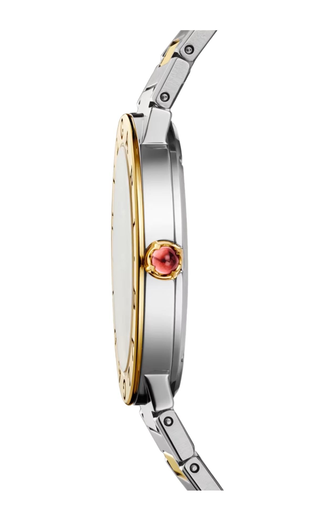 Orologio BVLGARI BVLGARI con movimento al quarzo, funzioni ore e minuti, calibro B043 con logo BVLGARI, cassa di 33 mm in acciaio inossidabile, lunetta in oro giallo 18 kt con doppio logo, quadrante soleil antracite, indici con 12 diamanti, corona in oro giallo 18 kt con rubellite rosa taglio cabochon e bracciale con fibbia déployante in oro giallo 18 kt e acciaio inossidabile lucido e satinato-spazzolato. Impermeabile fino a 30 metri.