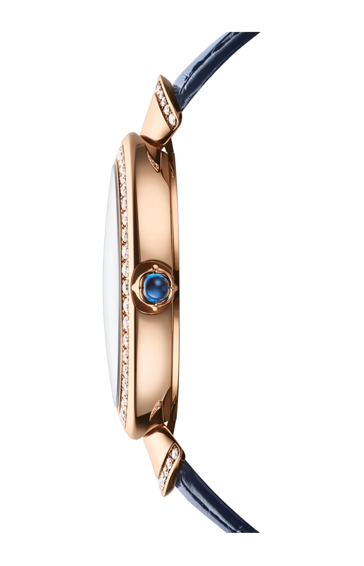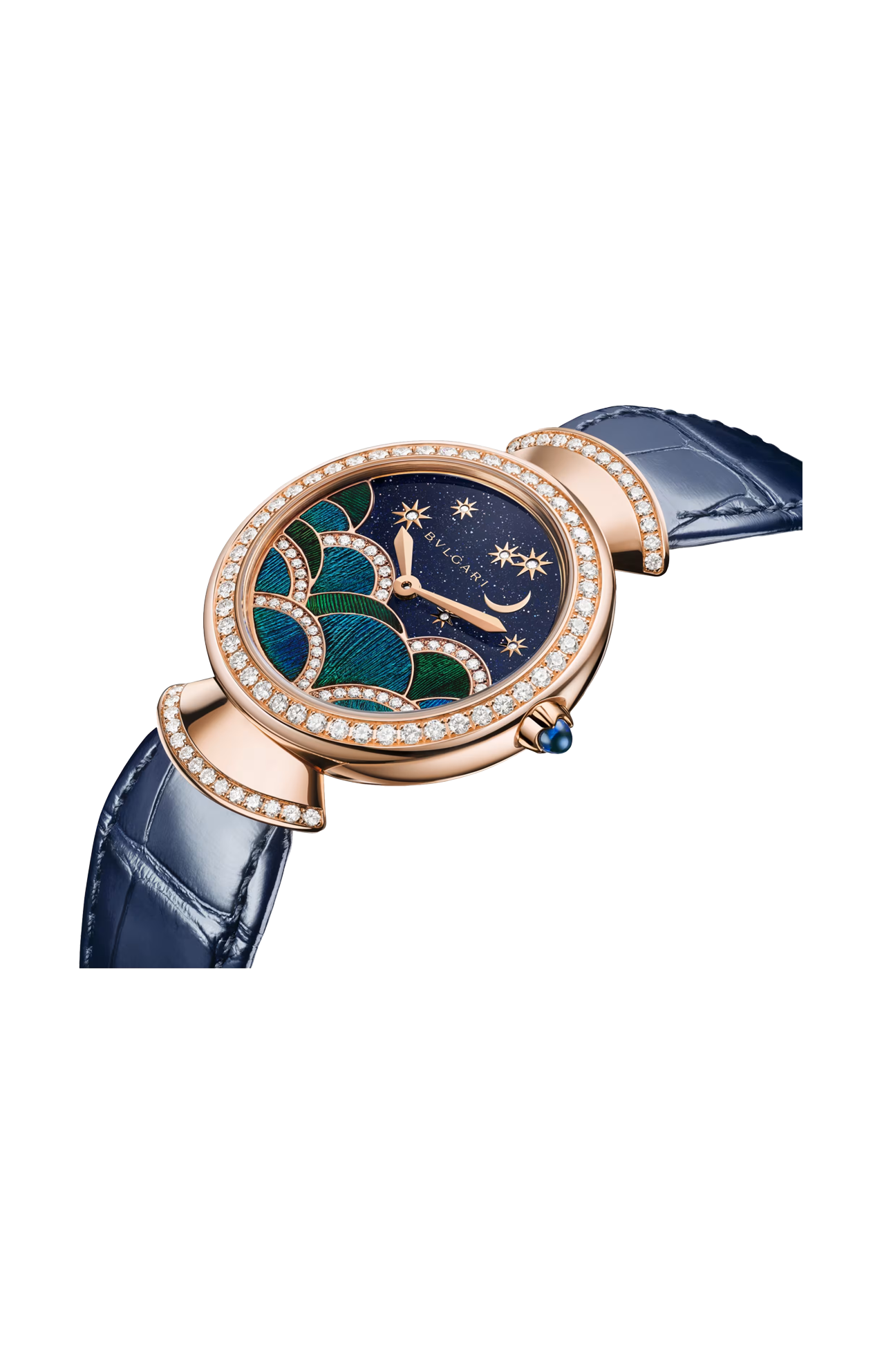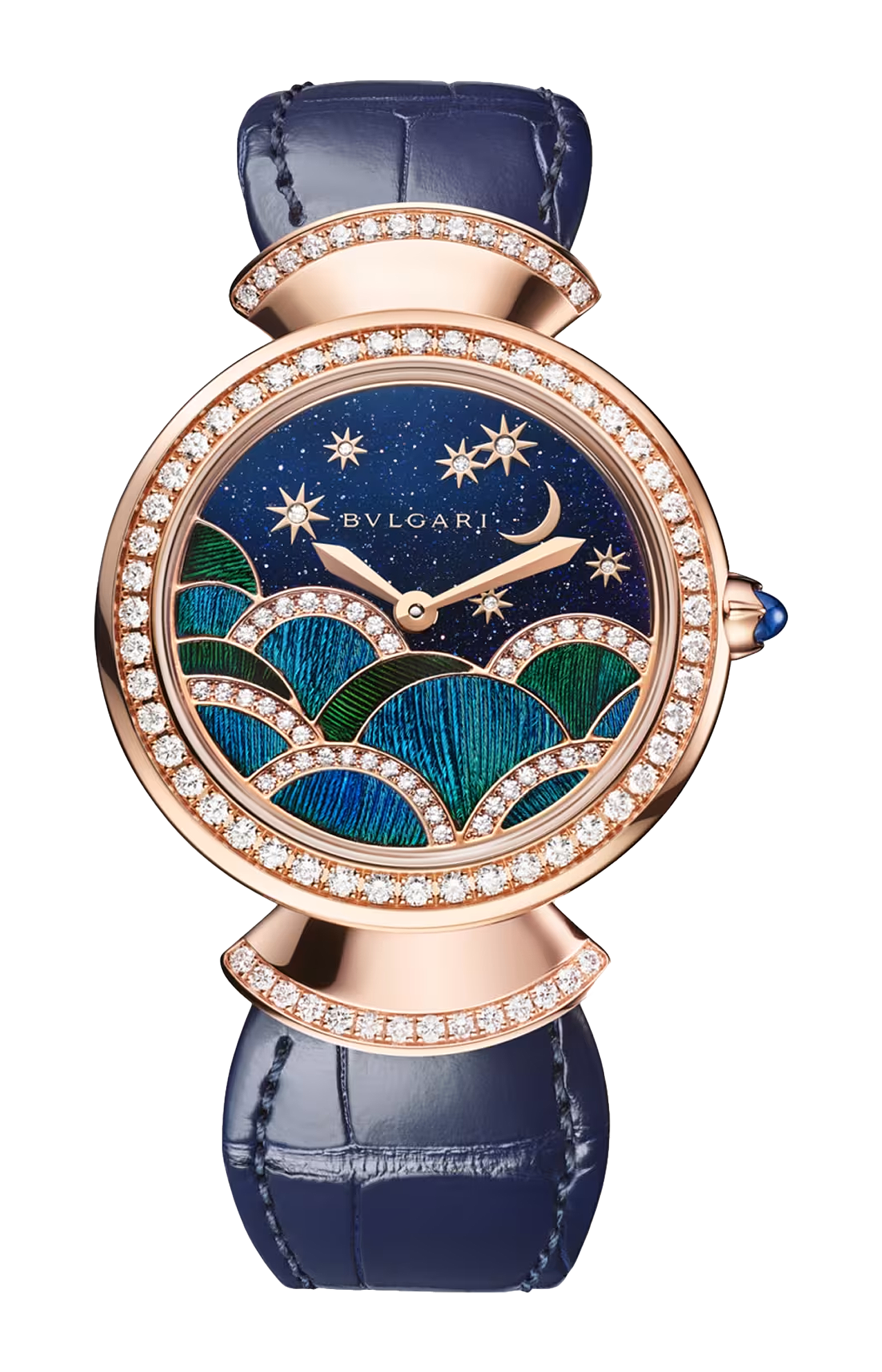 Orologio Divas' Dream con movimento al quarzo, funzioni ore e minuti, cassa di 33 mm e lunetta in oro rosa 18 kt con 48 diamanti taglio brillante (~0,92 ct), anse in oro rosa 18 kt con 28 diamanti taglio brillante (~0,30 ct), corona in oro rosa 18 kt con zaffiro blu taglio cabochon (~ 0,20 ct), quadrante intarsiato in avventurina blu con piuma di pavone, diamanti taglio brillante, luna e stelle in oro rosa 18 kt con 45 diamanti taglio brillante (~0,20 ct) e cinturino in alligatore blu con fibbia ad ardiglione in oro rosa 18 kt. Impermeabile fino a 30 metri.