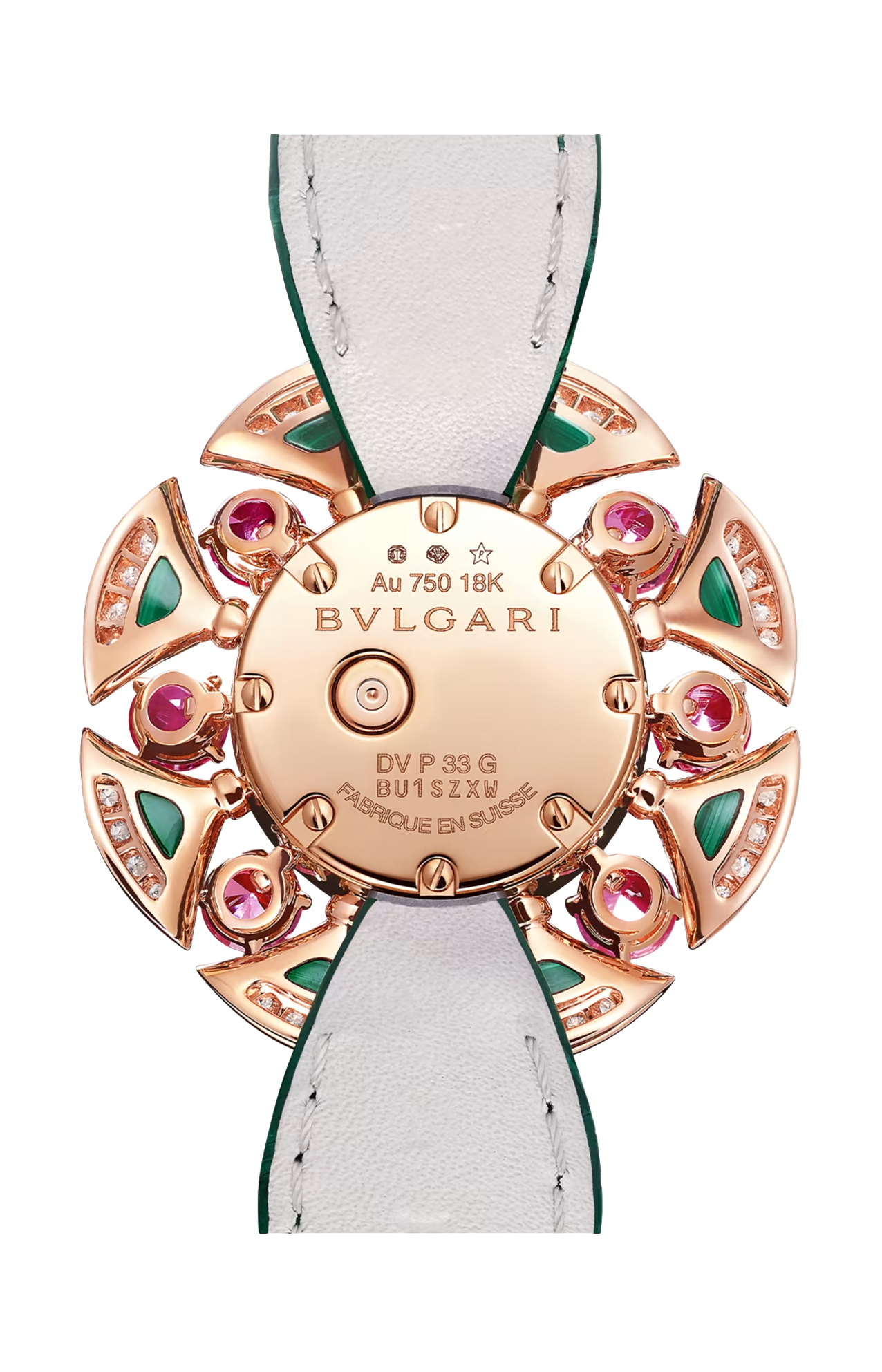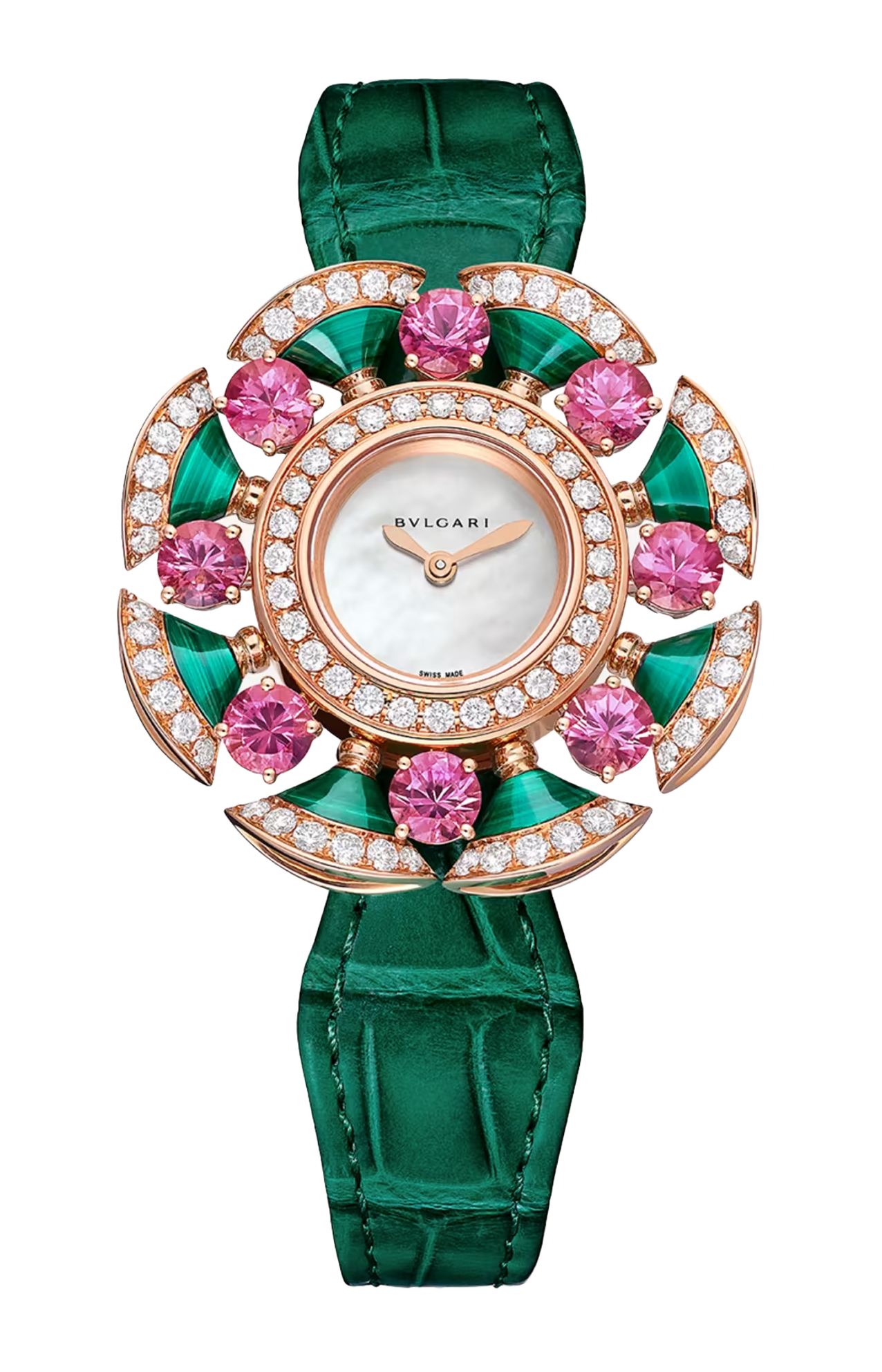 Orologio di alta gioielleria Divas' Dream con movimento al quarzo, cassa di 33 mm e petali in oro rosa 18 kt con diamanti tondi taglio brillante (circa 1,37 ct), inserti in malachite (circa 3,20 ct) e tormaline rosa (circa 2,82 ct), quadrante in madreperla, cinturino in alligatore verde e fibbia déployante in oro rosa 18 kt con diamanti.