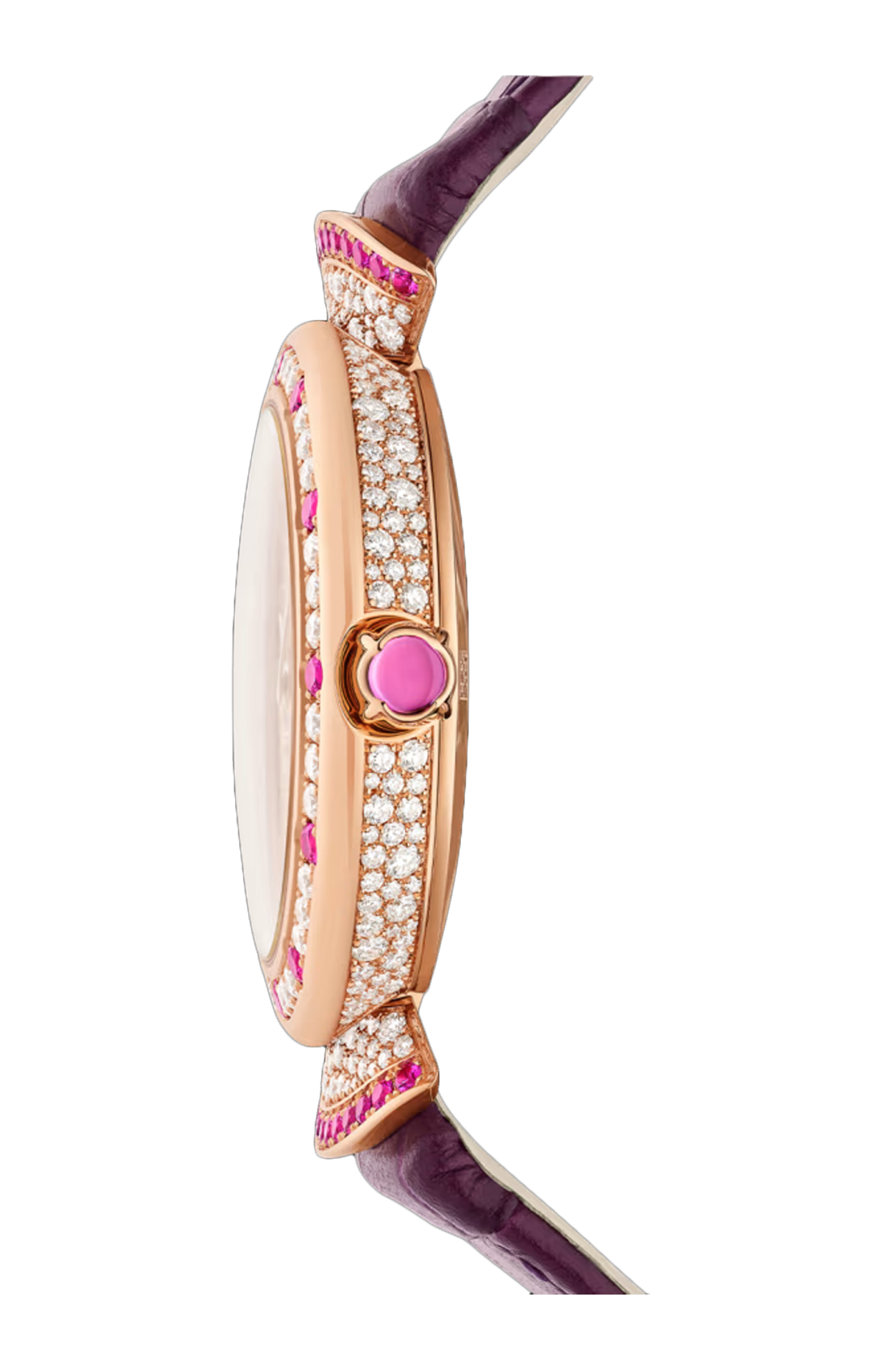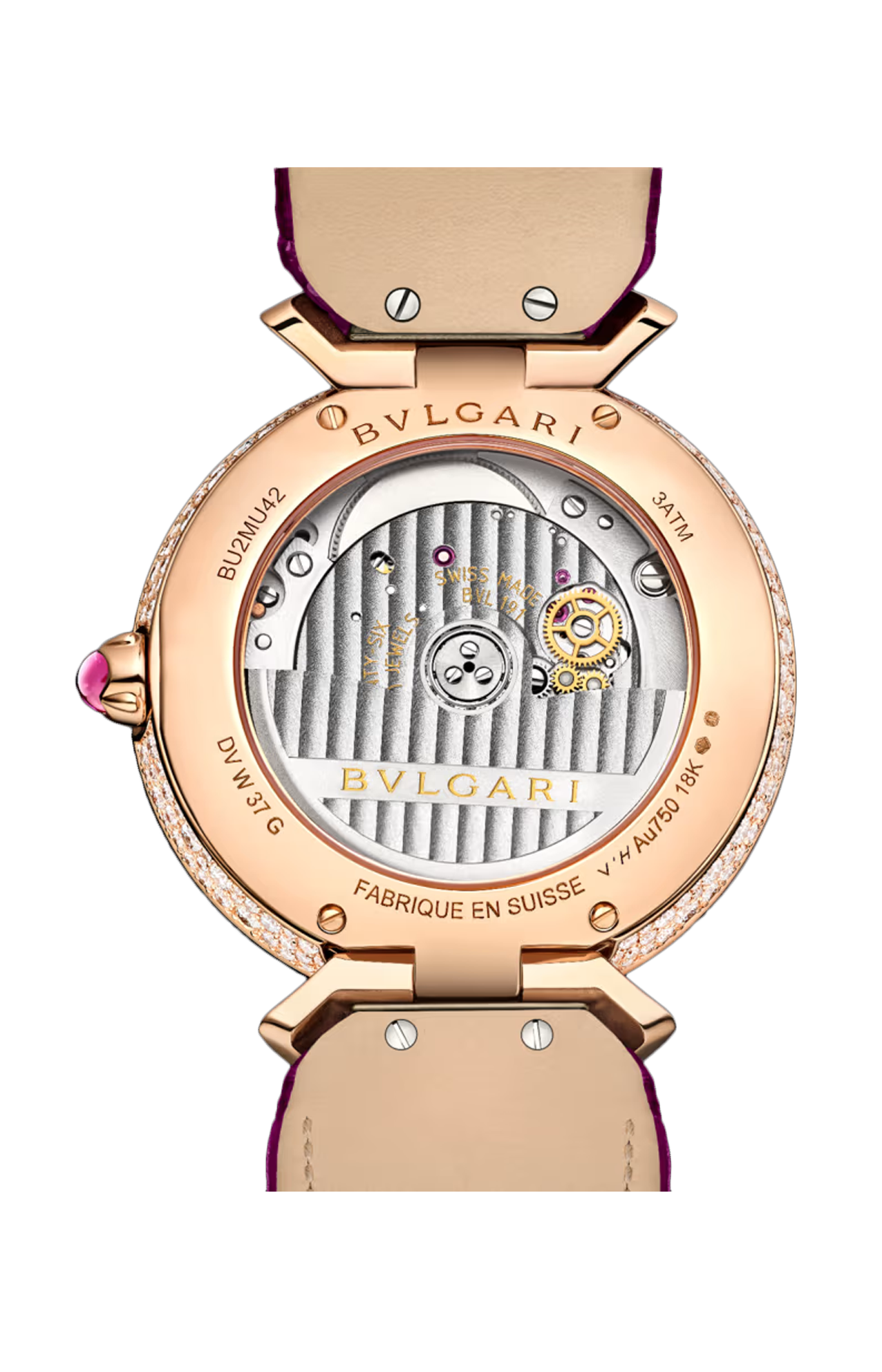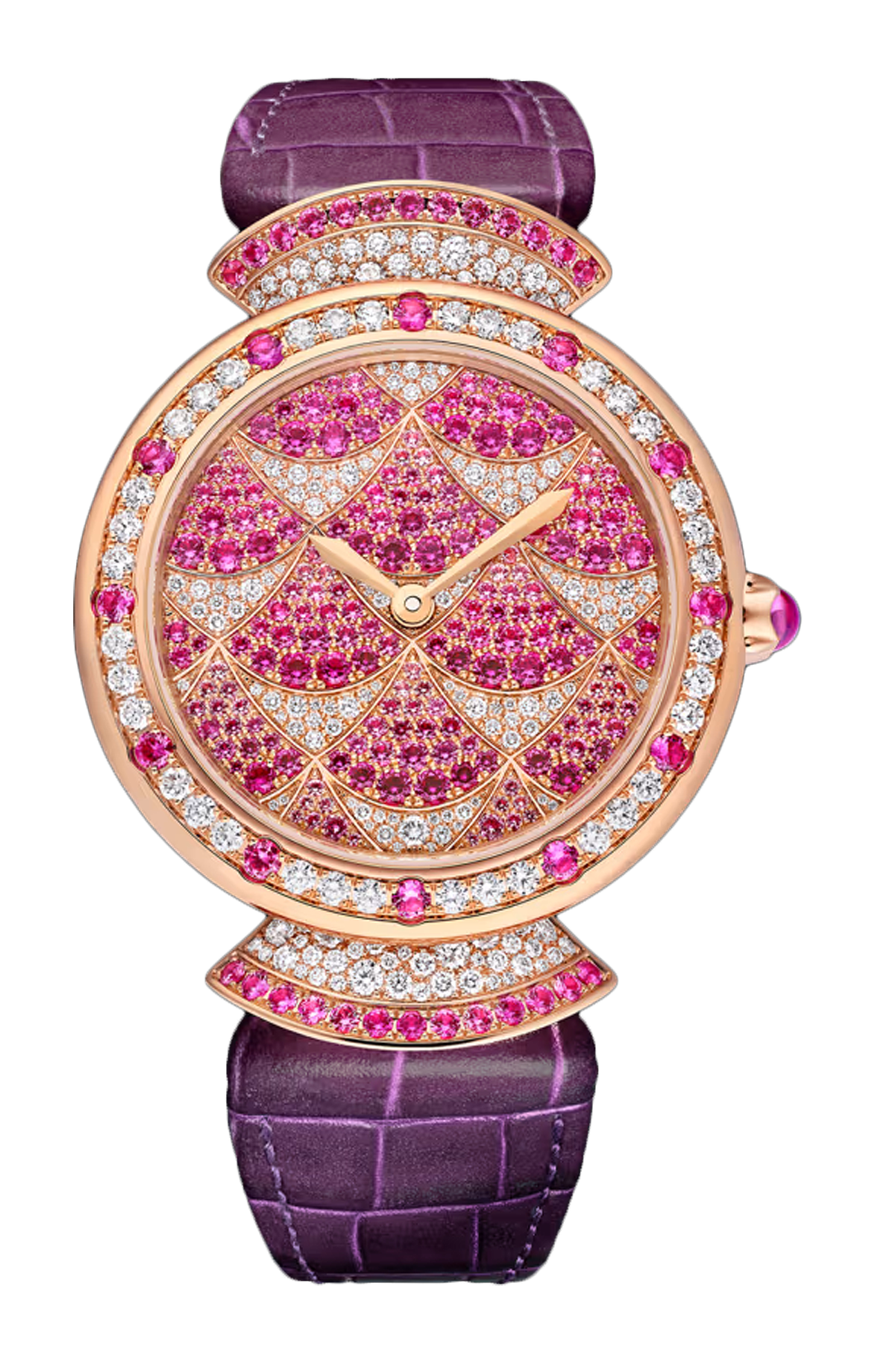 Orologio di alta gioielleria Divas' Dream Mosaica con movimento meccanico di manifattura a carica automatica, calibro BVL191 (spessore 3,8 mm), riserva di carica di 42 ore, frequenza 28.800 vph (4 hz), cassa di 37 mm e lunetta in oro rosa 18 kt con diamanti taglio brillante (~2,2 ct) e zaffiri rosa (~0,4 ct), quadrante con motivi a ventaglio con diamanti incastonati a neve (~0,4 ct) e zaffiri rosa (~2,10 ct), lancette in oro rosa, anse in oro rosa 18 kt con diamanti taglio brillante (~0,3 ct) e zaffiri rosa (~0.3 ct), corona in oro rosa 18 kt con zaffiro rosa taglio cabochon (~0,3 ct), cinturino in alligatore rosa e fibbia déployante in oro rosa 18 kt con diamanti (~0,5 ct). Impermeabile fino a 30 metri.