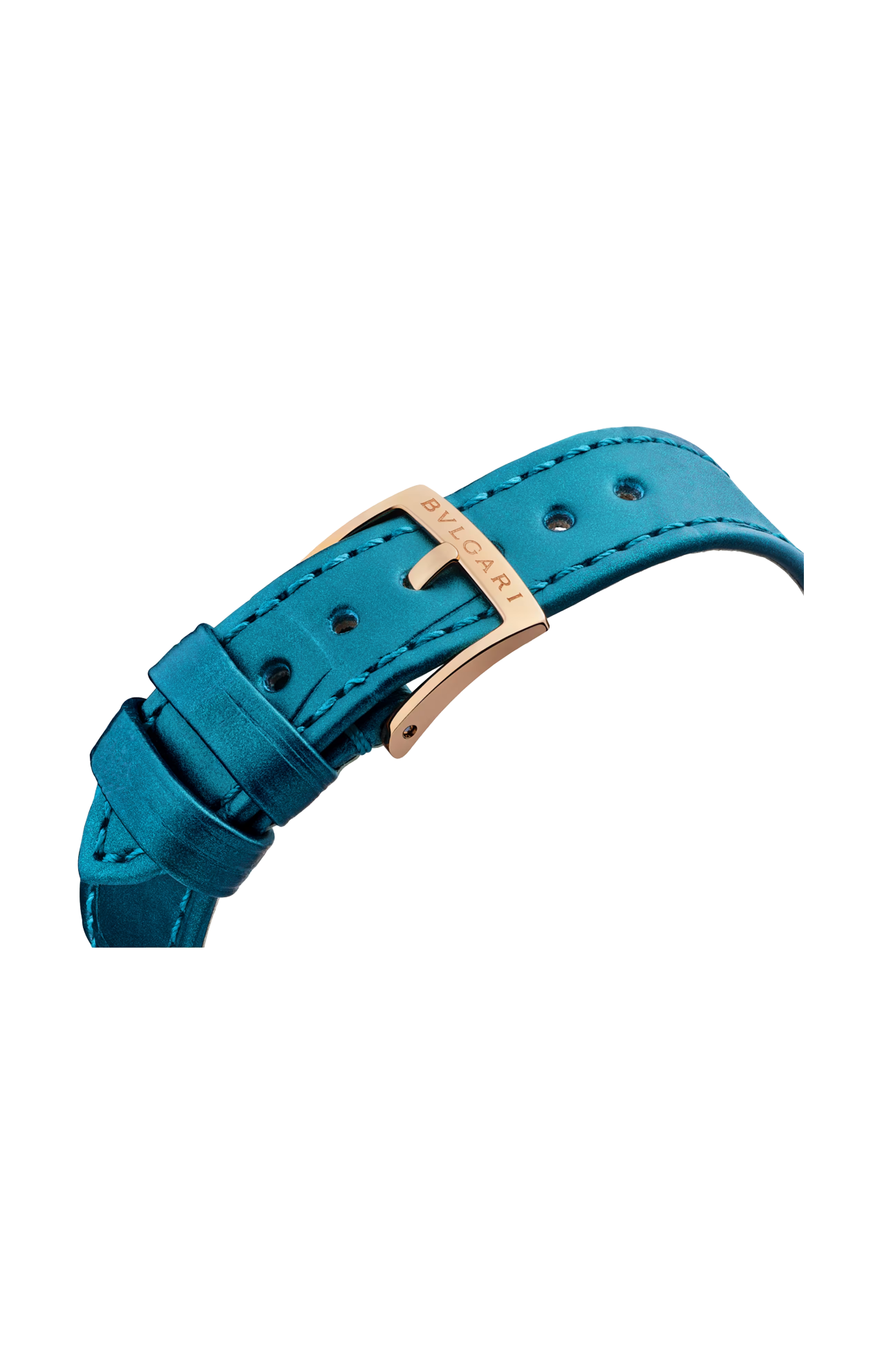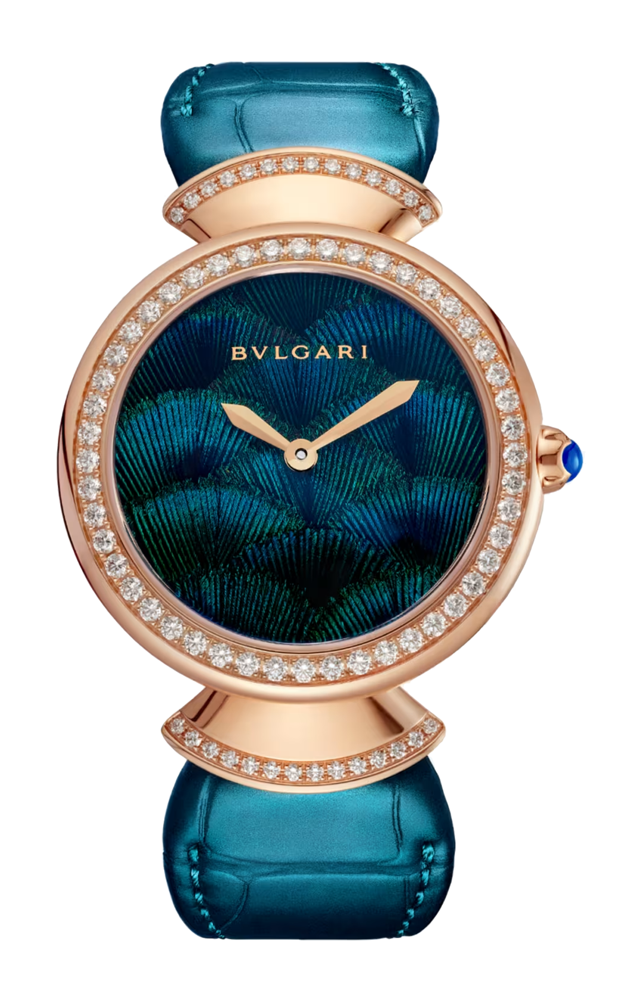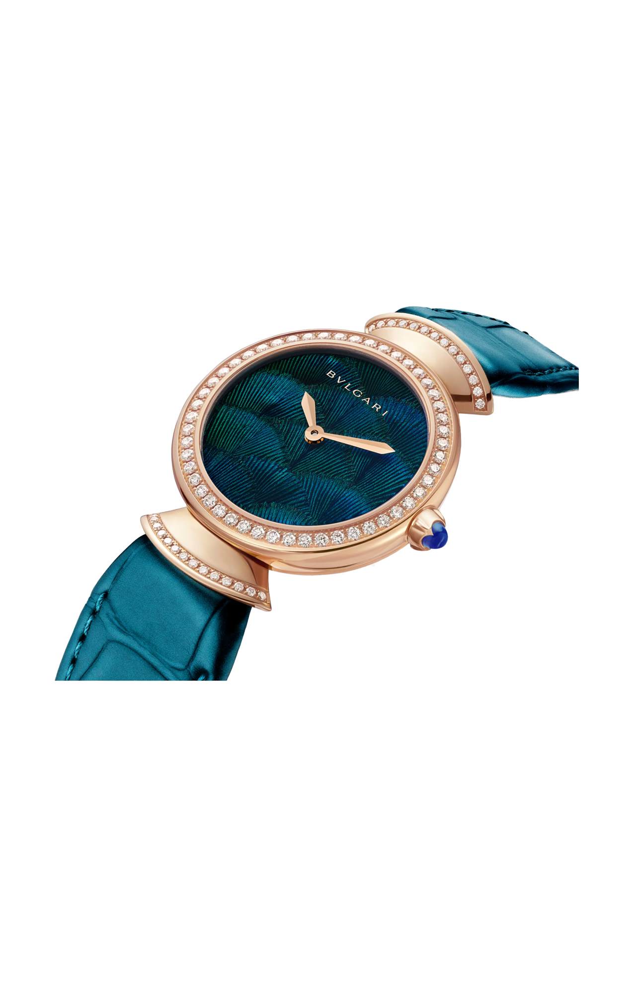 Orologio Divas' Dream con movimento al quarzo personalizzato con logo BVLGARI, funzioni ore e minuti, cassa di 33 mm in oro rosa 18 kt, lunetta e anse in oro rosa 18 kt con diamanti taglio brillante, corona in oro rosa 18 kt con zaffiro blu taglio cabochon, quadrante con piuma di pavone e cinturino in alligatore verde con fibbia ad ardiglione in oro rosa 18 kt. Impermeabile fino a 30 metri.