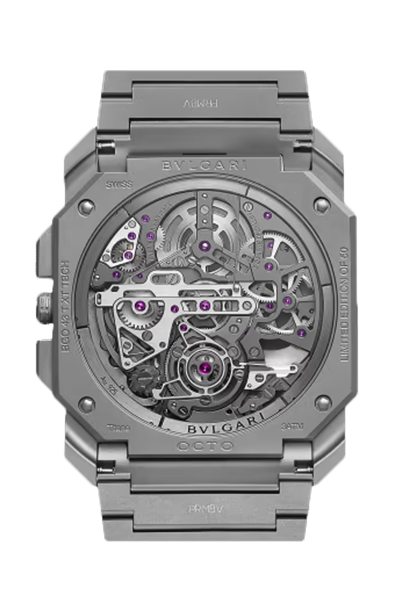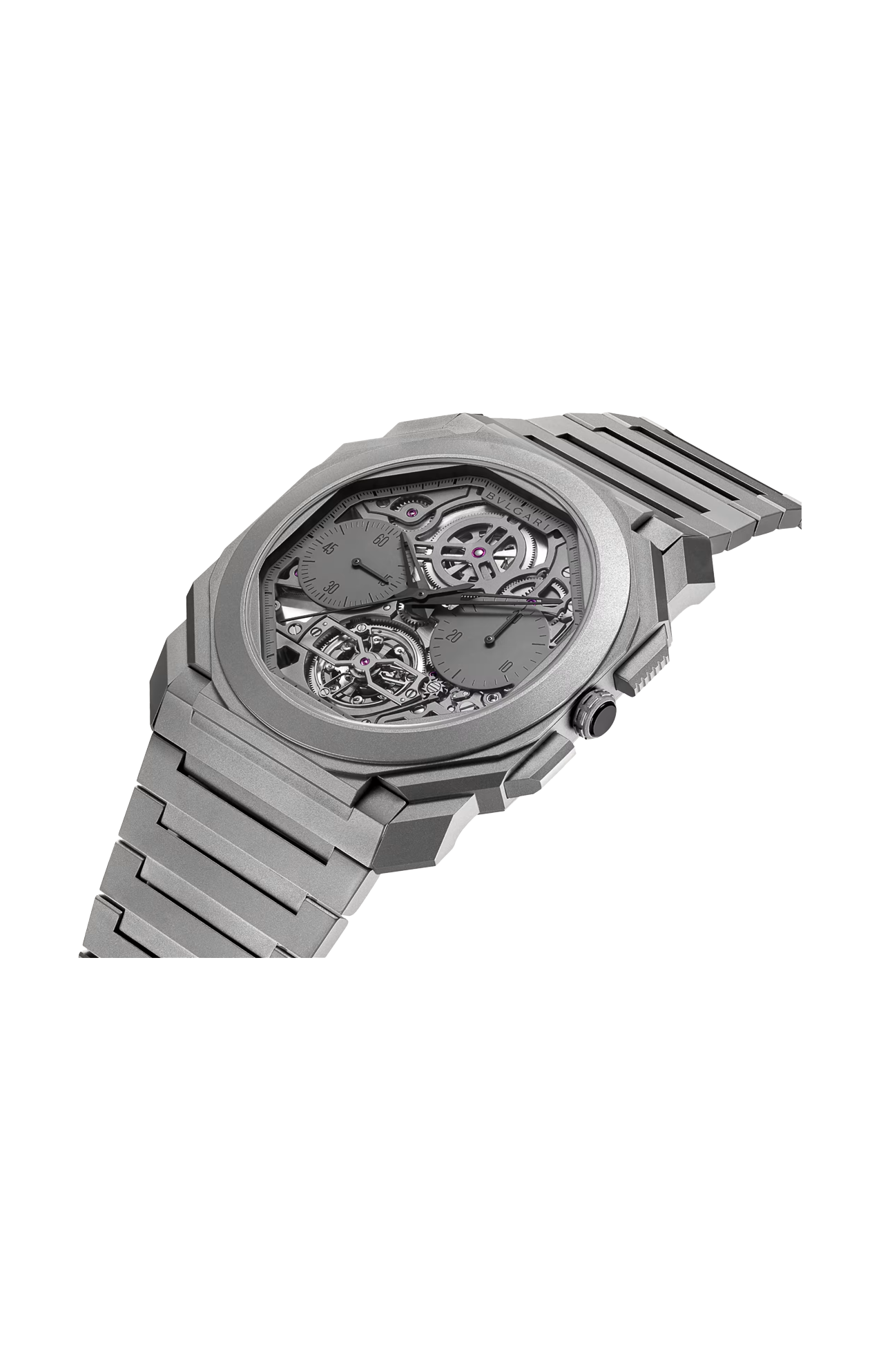 Orologio OCTO FINISSIMO TOURBILLON CHRONOGRAPHE LIMITED EDITION con movimento meccanico di manifattura scheletrato ultrasottile a carica automatica, cronografo monopulsante e tourbillon, calibro BVL 388 (spessore 3,50 mm), riserva di carica di 52 ore e 21.600 vph (3hz). Cassa di 42 mm in titanio sabbiato grado 5 (spessore 7,40 mm), fondello a vista, corona e pulsanti in titanio sabbiato, quadrante scheletrato grigio opaco con contatori cronografici e bracciale con fibbia déployante in titanio sabbiato.