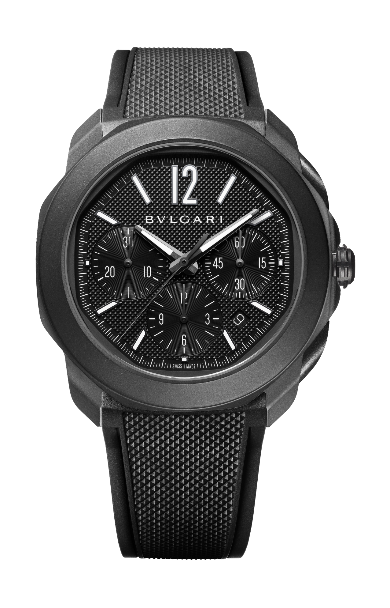 Orologio automatico OCTO ROMA con movimento meccanico di manifattura a carica automatica e cronografo, funzioni piccoli secondi e data, calibro BVL 399, frequenza 28.800 VPH (4 Hz), riserva di carica di 42 ore. Cassa di 42 mm in acciaio inossidabile sabbiato con trattamento DLC nero (spessore 12,40 mm), quadrante opaco nero con finiture clous de Paris, lancette e indici neri in super-luminova®, finestrella della data a ore 4/5, corona a vite in acciaio inossidabile sabbiato con trattamento DLC nero e inserto in ceramica nera, pulsanti in acciaio inossidabile sabbiato con trattamento DLC nero, fondello a vista, cinturino intercambiabile in caucciù nero e cinturino supplementare in alligatore nero con fibbia ad ardiglione in acciaio inossidabile sabbiato con trattamento DLC nero. Impermeabile fino a 100 metri.