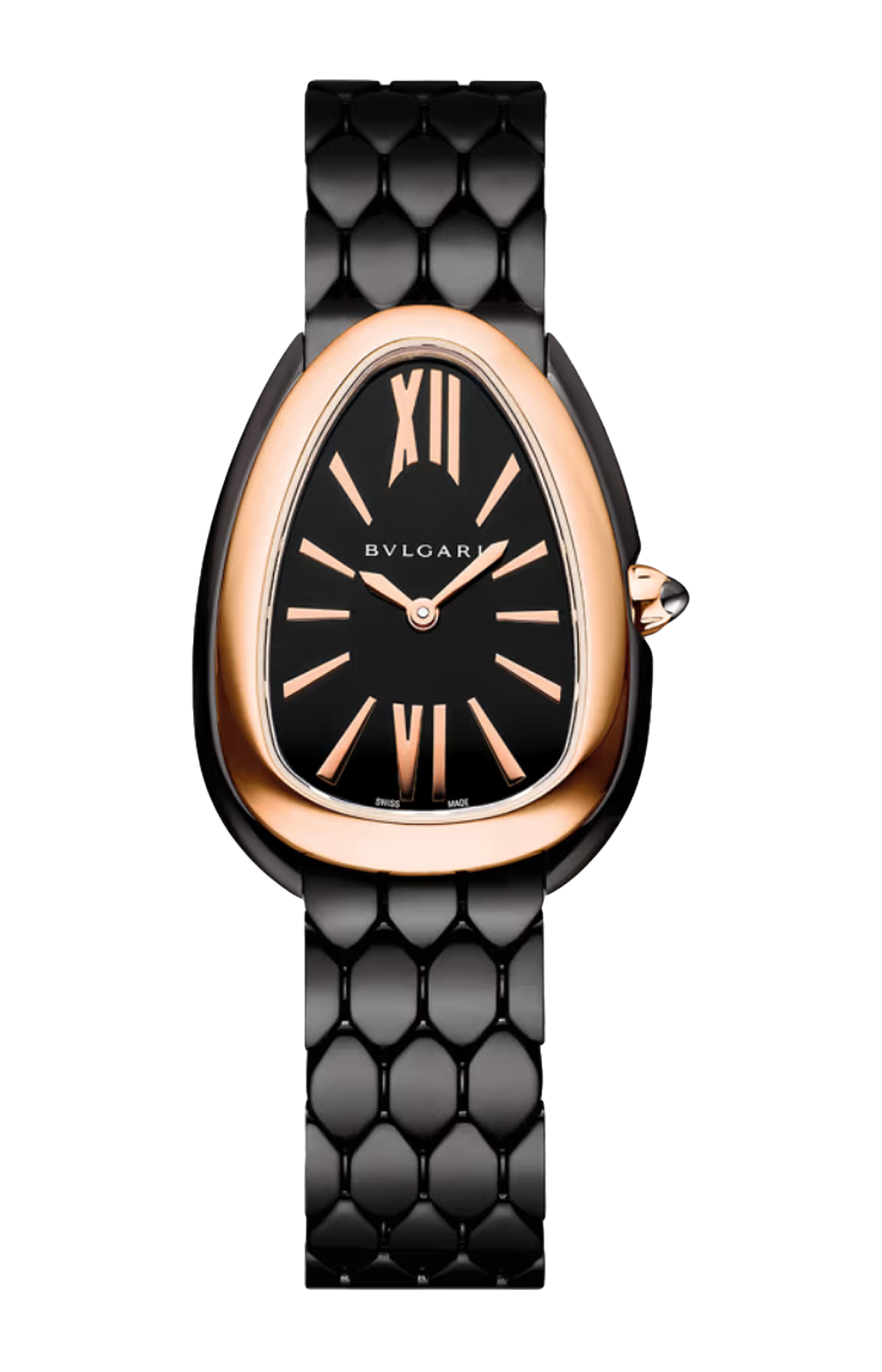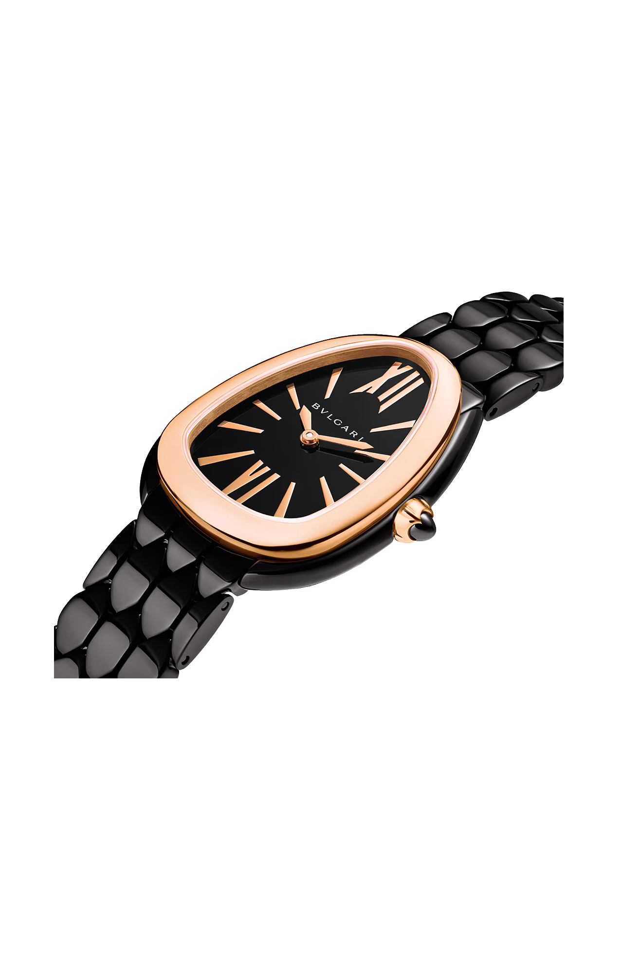 Orologio Serpenti Seduttori con movimento al quarzo, cassa di 33 mm in acciaio inossidabile con trattamento DLC nero, lunetta in oro rosa 18 kt, corona in oro rosa 18 kt con inserto in ceramica nera taglio cabochon, quadrante laccato nero, bracciale in acciaio inossidabile con trattamento DLC e fibbia déployante. Impermeabile fino a 30 metri.