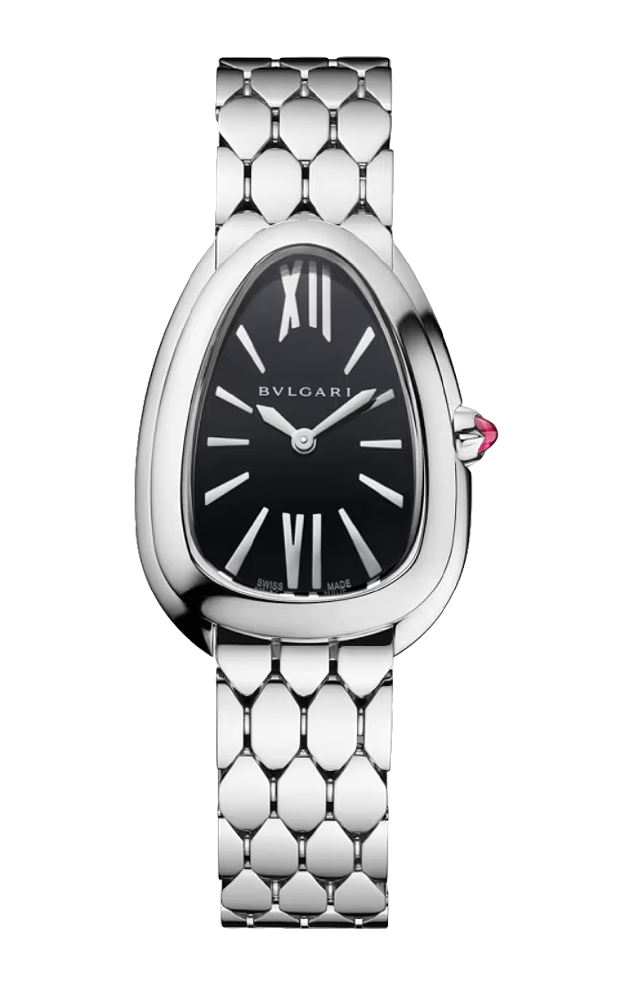 Orologio Serpenti Seduttori con movimento al quarzo, cassa di 33 mm e lunetta in acciaio inossidabile, corona in acciaio inossidabile con rubellite rosa taglio cabochon, quadrante laccato nero, bracciale con fibbia déployante in acciaio inossidabile. Impermeabile fino a 30 metri.