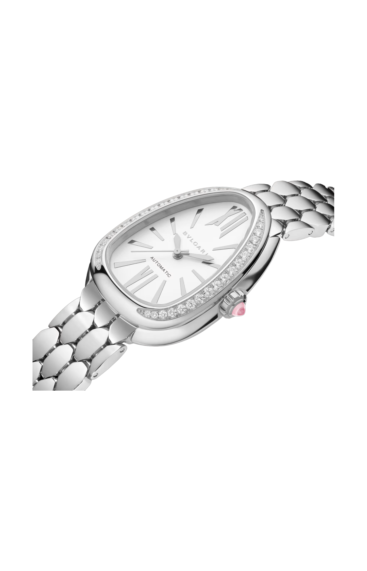 Con il raffinato splendore dei suoi preziosi materiali, l'orologio Serpenti Seduttori in acciaio inossidabile è un trionfo di sensualità, fascino enigmatico e glamour contemporaneo. Contornato dall'iconico design a goccia della cassa, l'incantevole quadrante opalino bianco è illuminato da una lunetta con diamanti, per un effetto sofisticato e scintillante. Il cuore dell'orologio batte al ritmo del movimento automatico di manifattura Lady Solotempo BVS 100. Un perfetto connubio tra precisione e performance, che unisce al savoir-faire di BVLGARI nell'orologeria la maestria della maison nell'arte della gioielleria. A completare il design, un flessuoso bracciale a squame esagonali ispirato alla sinuosa eleganza del serpente. Orologio Serpenti Seduttori con movimento meccanico di manifattura a carica automatica, funzioni ore e minuti, calibro BVS 100 (diametro 19 mm, spessore 3,9 mm) decorato con logo BVLGARI e motivo a squama di serpente, frequenza 3 Hz, 28 rubini, riserva di carica di 50 ore. Cassa di 34 mm in acciaio inossidabile e lunetta con 36 diamanti tondi taglio brillante, corona in acciaio inossidabile con rubellite rosa taglio cabochon, quadrante opalino bianco, fondello a vista, bracciale con fibbia déployante in acciaio inossidabile. Impermeabile fino a 30 metri.