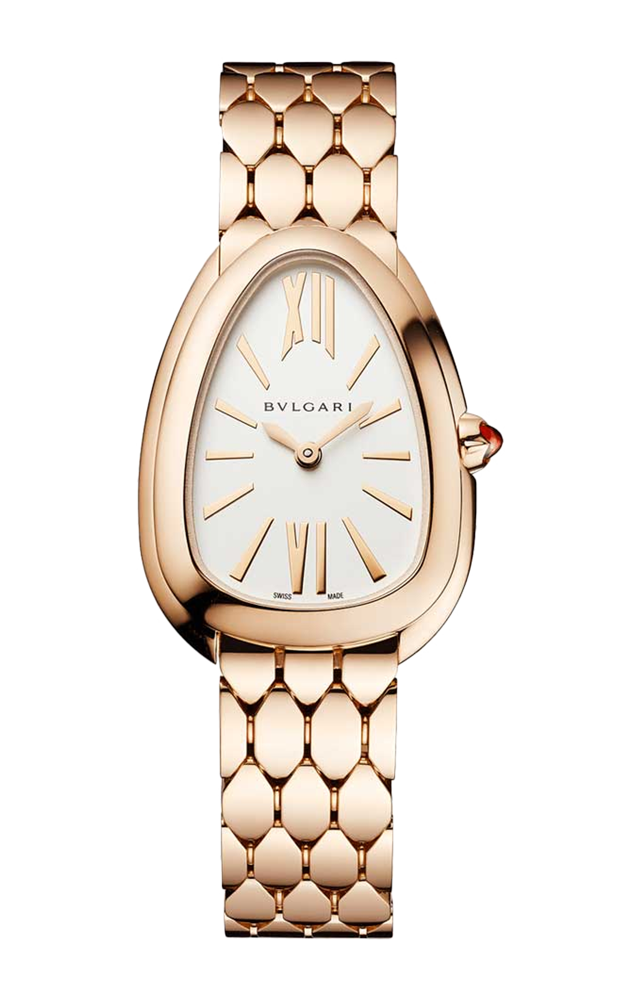 Nato per essere realizzato in oro, l’orologio Serpenti Seduttori rende il tempo ancor più prezioso. Rivisitando l'emblema di seduzione BVLGARI per eccellenza attraverso un design inedito, l’orologio unisce all’iconica cassa a forma di testa di serpente, dallo spessore ancor più sottile, un flessuoso bracciale adornato da preziose squame esagonali. Un orologio dal design accattivante, ispirato alle creazioni di gioielleria della maison, che ammanta l’universo “Serpenti” di un nuovo irresistibile incanto. Orologio Serpenti Seduttori con movimento al quarzo, cassa di 33 mm in oro rosa 18 kt, corona in oro rosa 18 kt con rubellite rosa taglio cabochon, quadrante opalino argento e bracciale con fibbia d’éployante in oro rosa 18 kt.