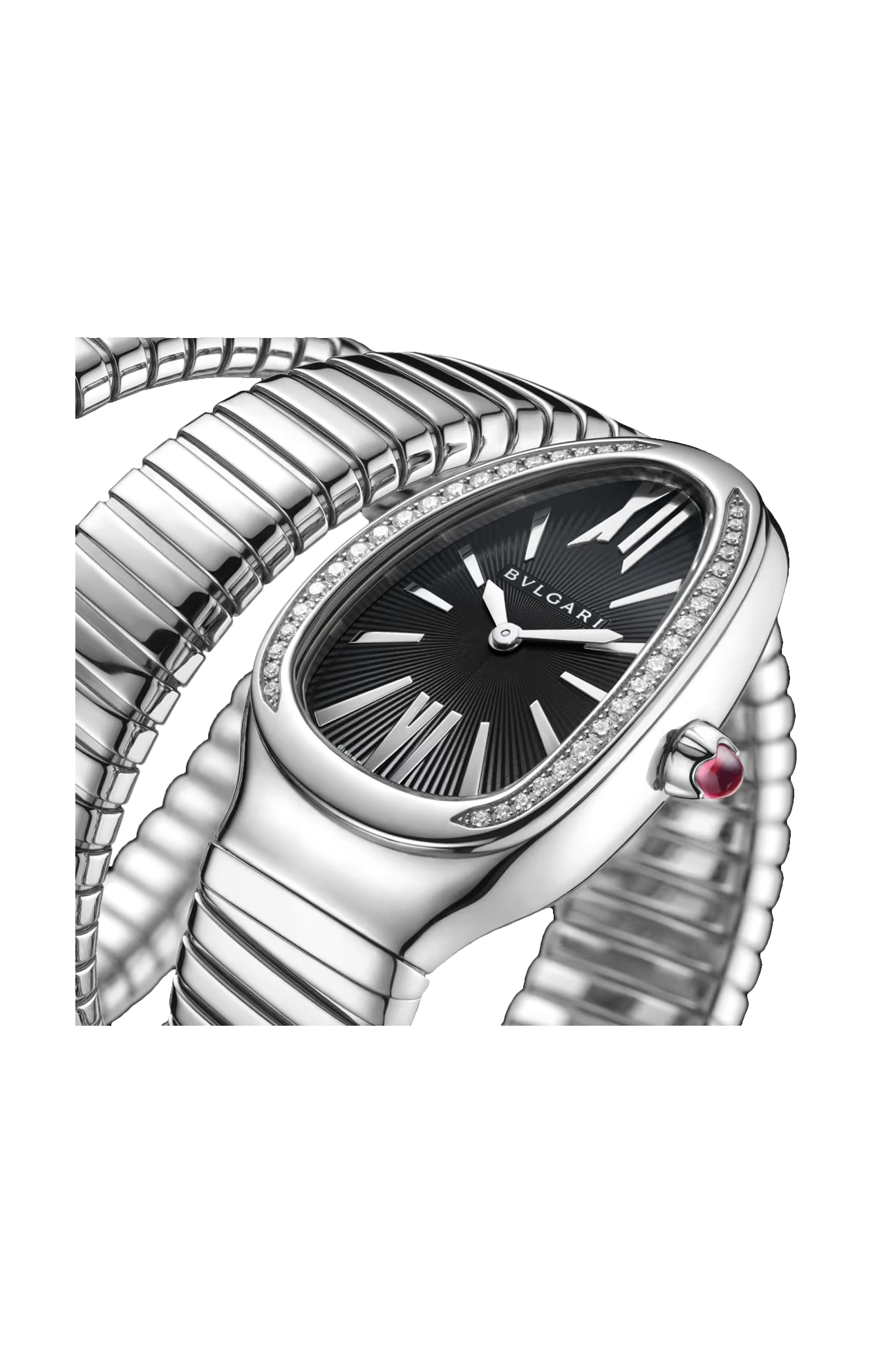 Orologio Serpenti Tubogas con movimento al quarzo, cassa curva di 35 mm in acciaio inossidabile e lunetta con 38 diamanti tondi taglio brillante (circa 0,29 ct), corona in acciaio inossidabile con rubellite taglio cabochon (0,108 ct), quadrante nero con finiture guilloché soleil e bracciale a doppia spirale in acciaio inossidabile. Impermeabile fino a 30 metri.