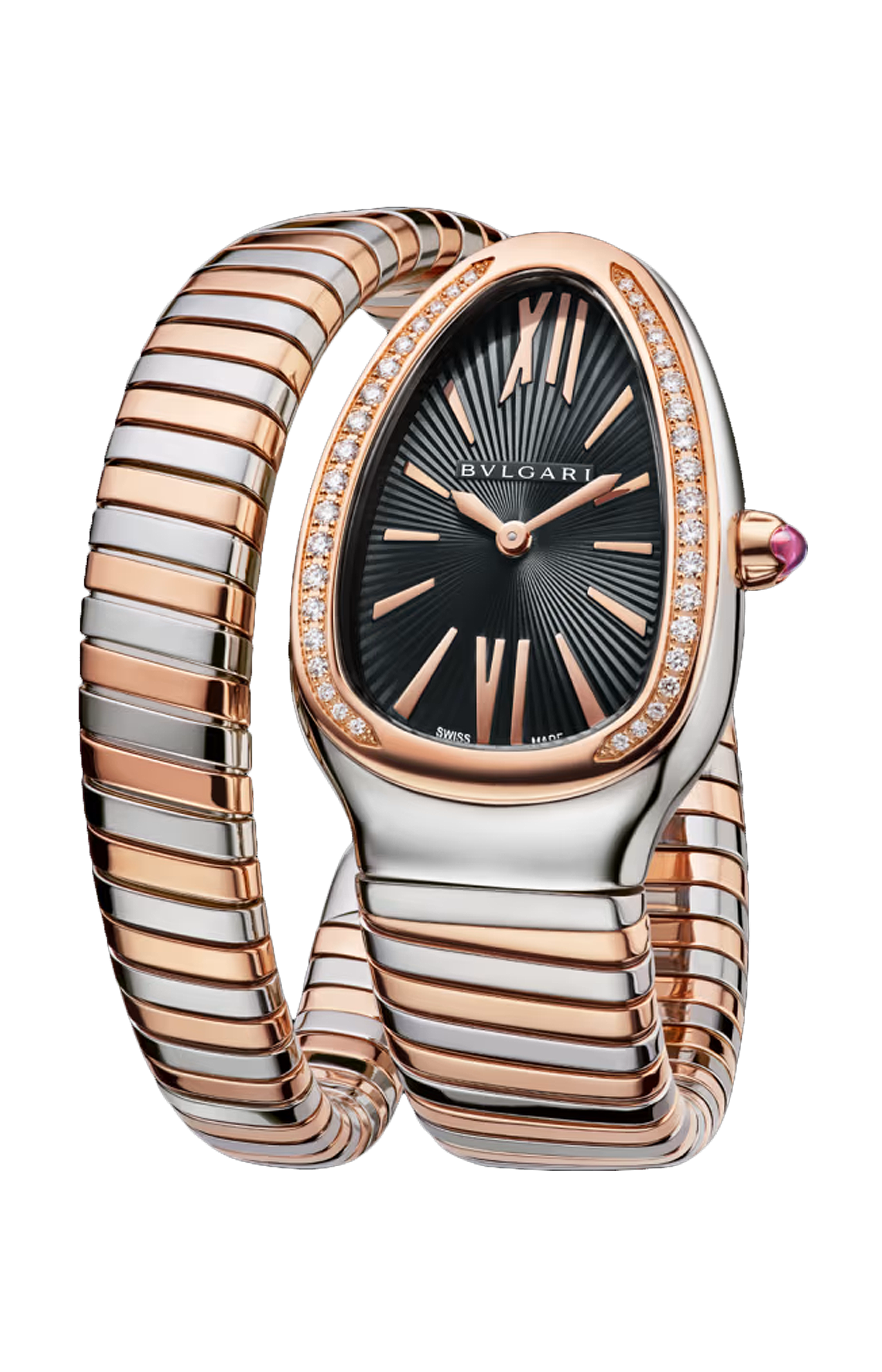 Orologio Serpenti Tubogas con movimento al quarzo, cassa curva di 35 mm in acciaio inossidabile, lunetta in oro rosa 18 kt con diamanti taglio brillante, corona in oro rosa 18 kt con rubellite rosa taglio cabochon, quadrante opalino nero con finiture guilloché soleil e indici applicati a mano, bracciale a spirale in oro rosa 18 kt e acciaio inossidabile.