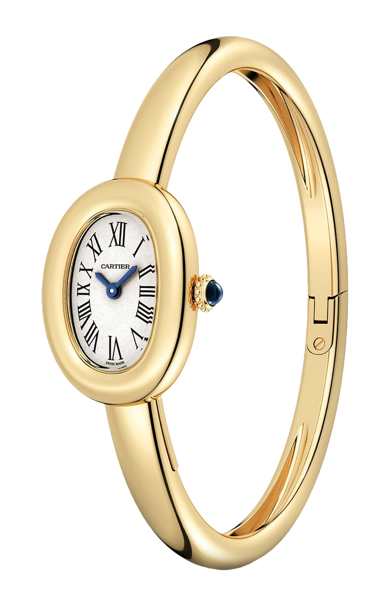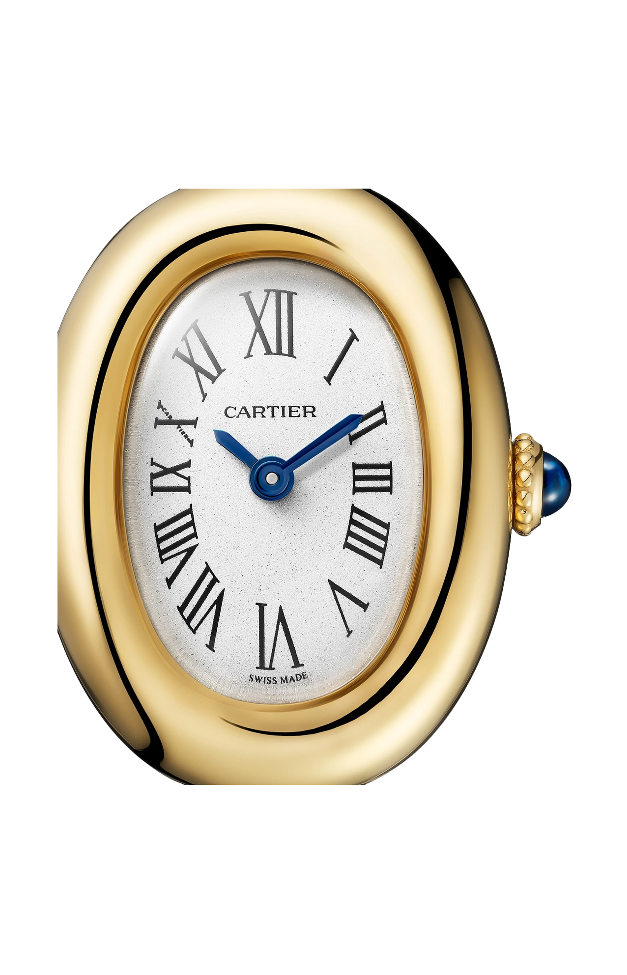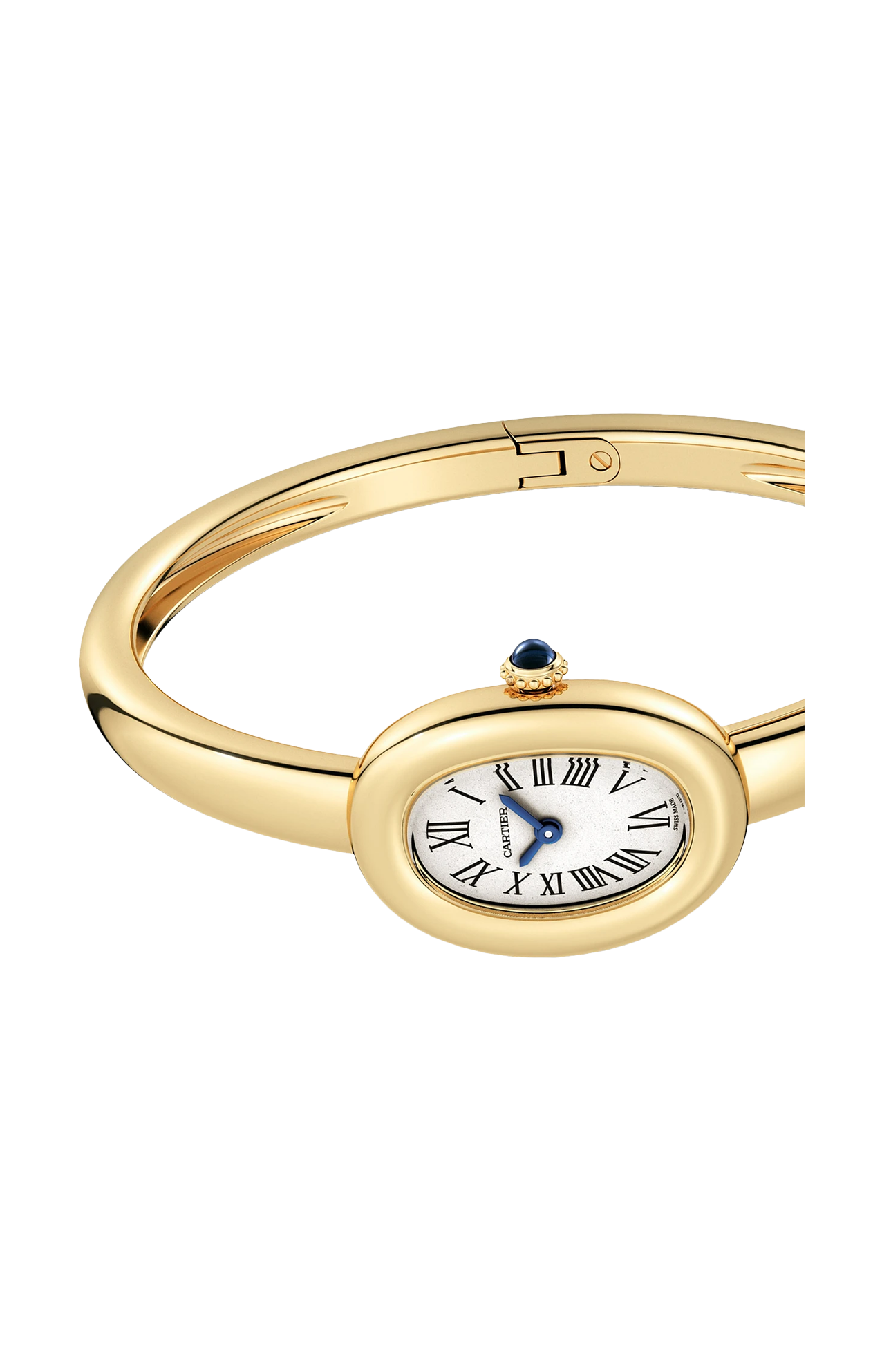 Orologio Baignoire de Cartier, modello mini, misura 17, movimento al quarzo. Cassa in oro giallo 750/1000. Corona perlata in oro giallo 750/1000 ornata di uno zaffiro cabochon. Quadrante argentato, lancette a forma di gladio d’acciaio azzurrato, vetro zaffiro. Bracciale rigido in oro giallo 750/1000. Dimensioni della cassa 24,6 x 18,7 mm, spessore 7,2 mm. Impermeabile fino a 30 metri.